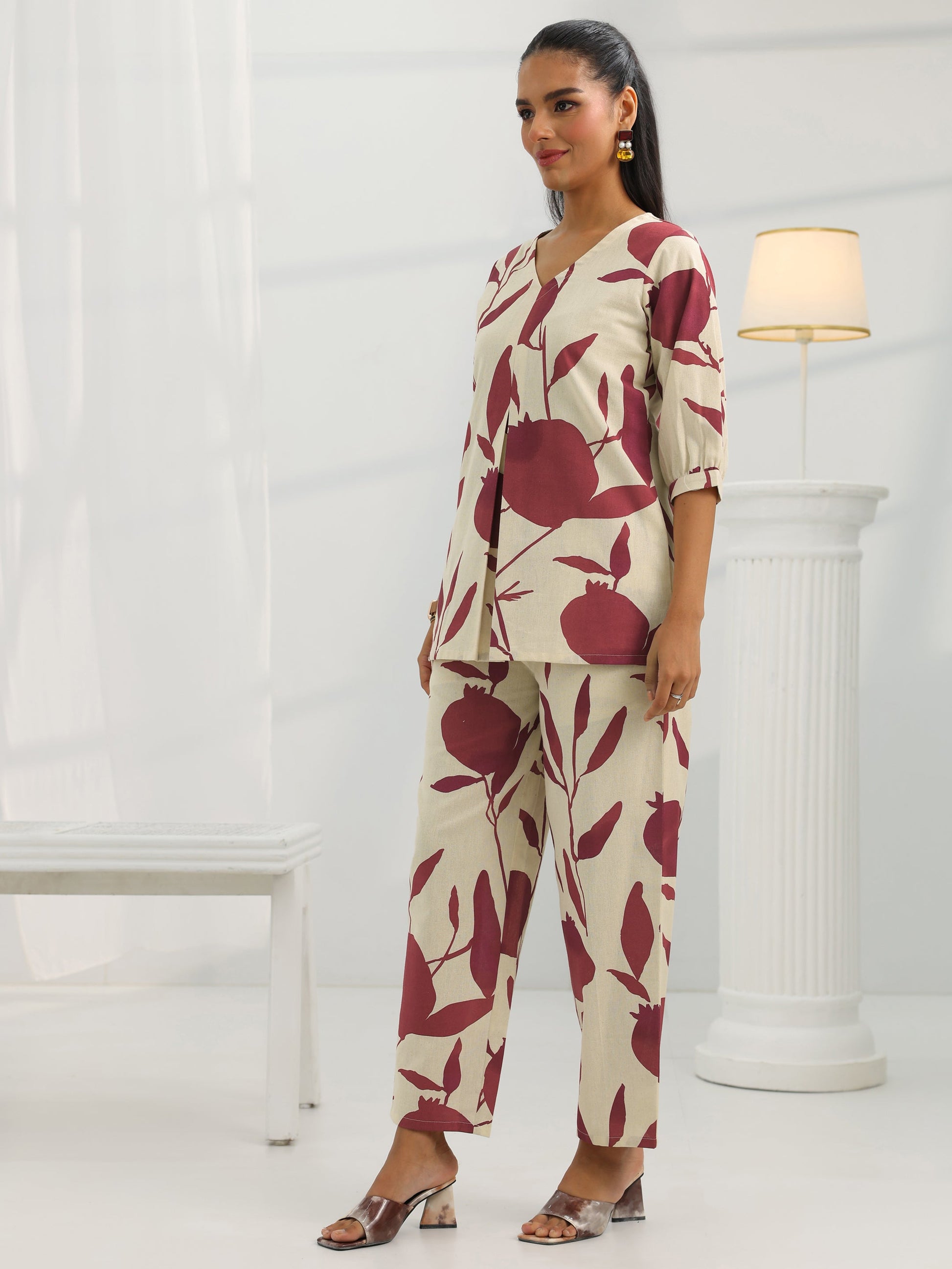 Off White Printed Cotton Straight Co-Ord Sets