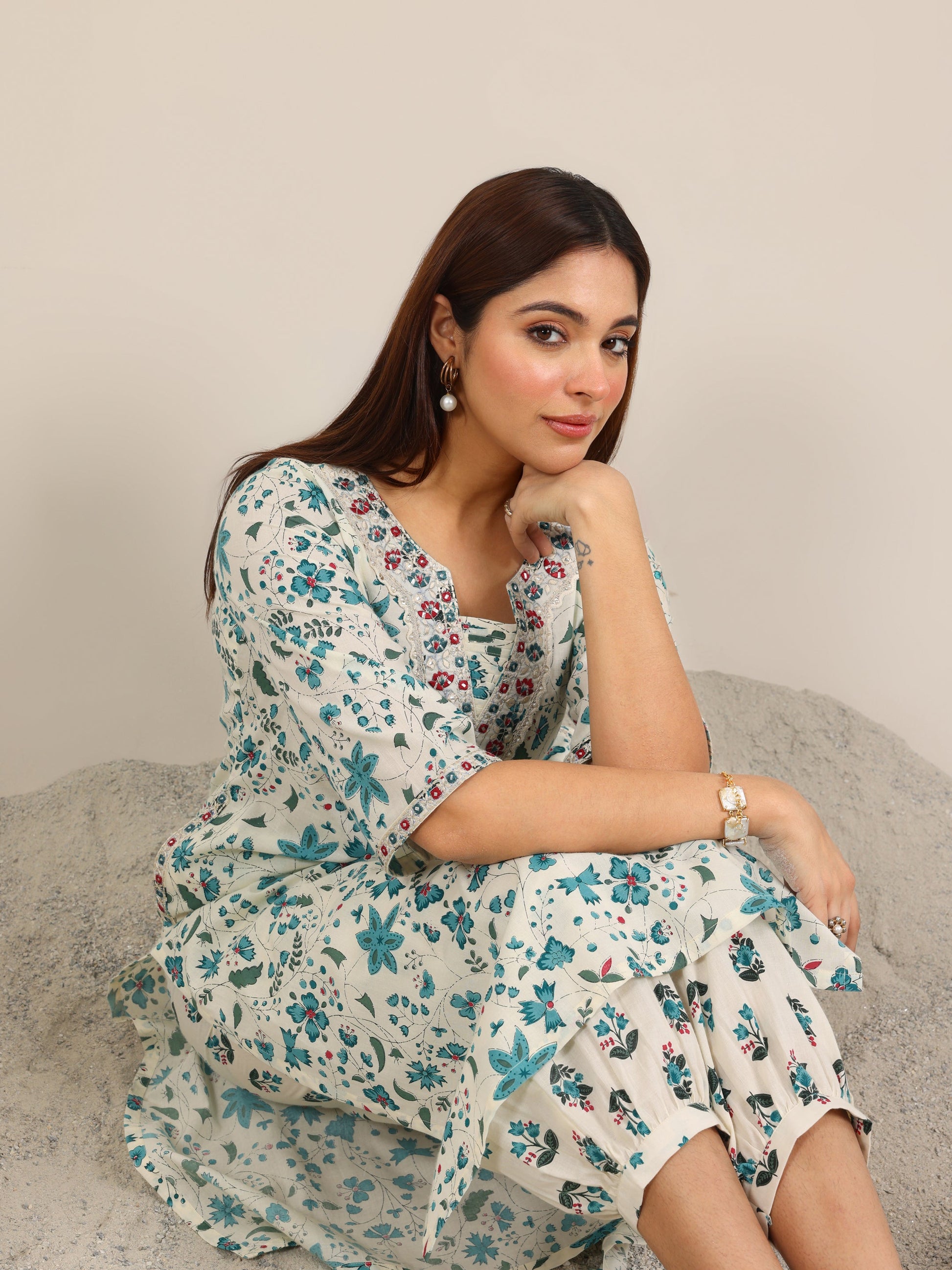 Our 2-piece Off White and Turquoise Blue Cotton Straight-Fit features a V-Neckline, Regular Sleeves, and statement yoke. Complemented with Straight Pants with a Partially Elasticated waistband and 2 pockets. Adorned with Floral Printed, this style is perfect for Casual wear.