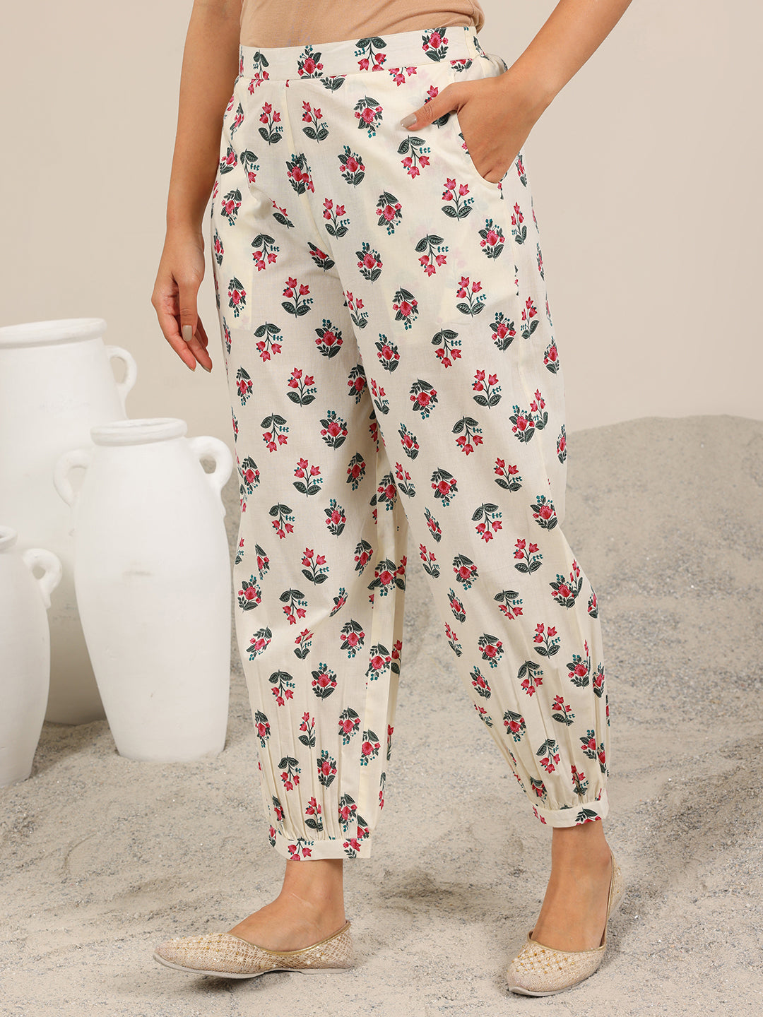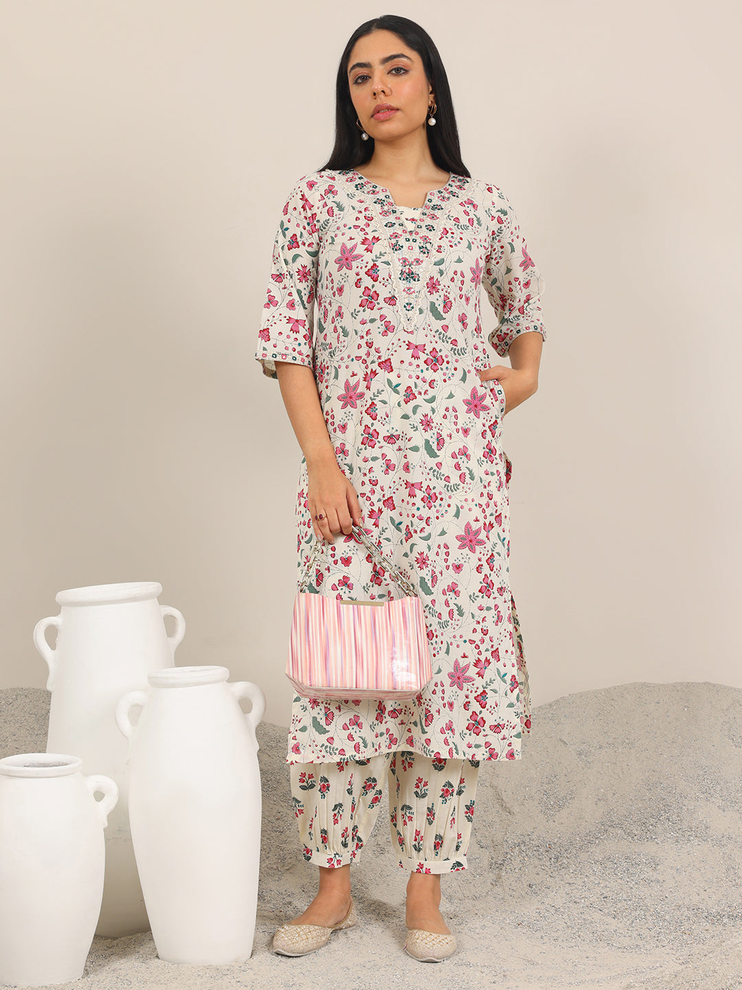 Our 1-piece cream cotton straight-fit features a notched neckline, regular sleeves, and statement yoke. Adorned with floral prints, this style is perfect for casual wear.