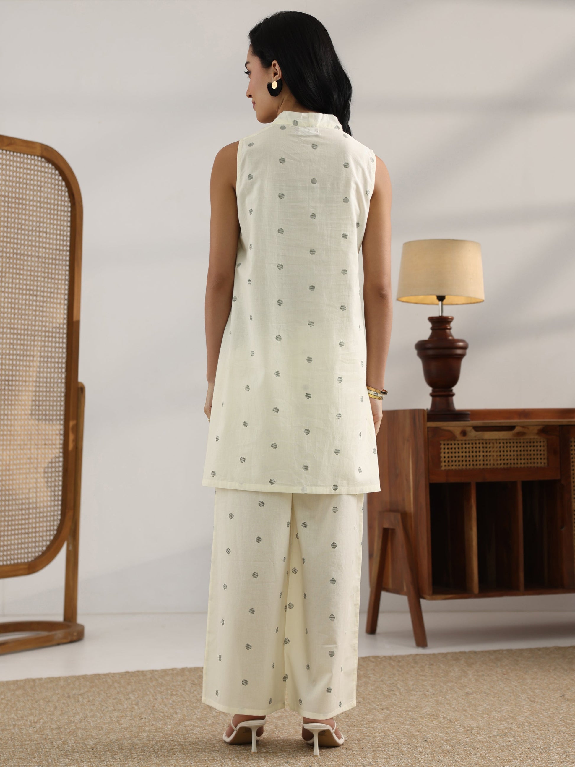 Our 2-piece Off White Cotton Straight-fit Kurta Set features a V-Neckline and statement yoke. Complemented with Straight Pants with a Partially Elasticated waistband and 2 pockets. Adorned with Geometric Printed accents, this style is perfect for Casual wear.