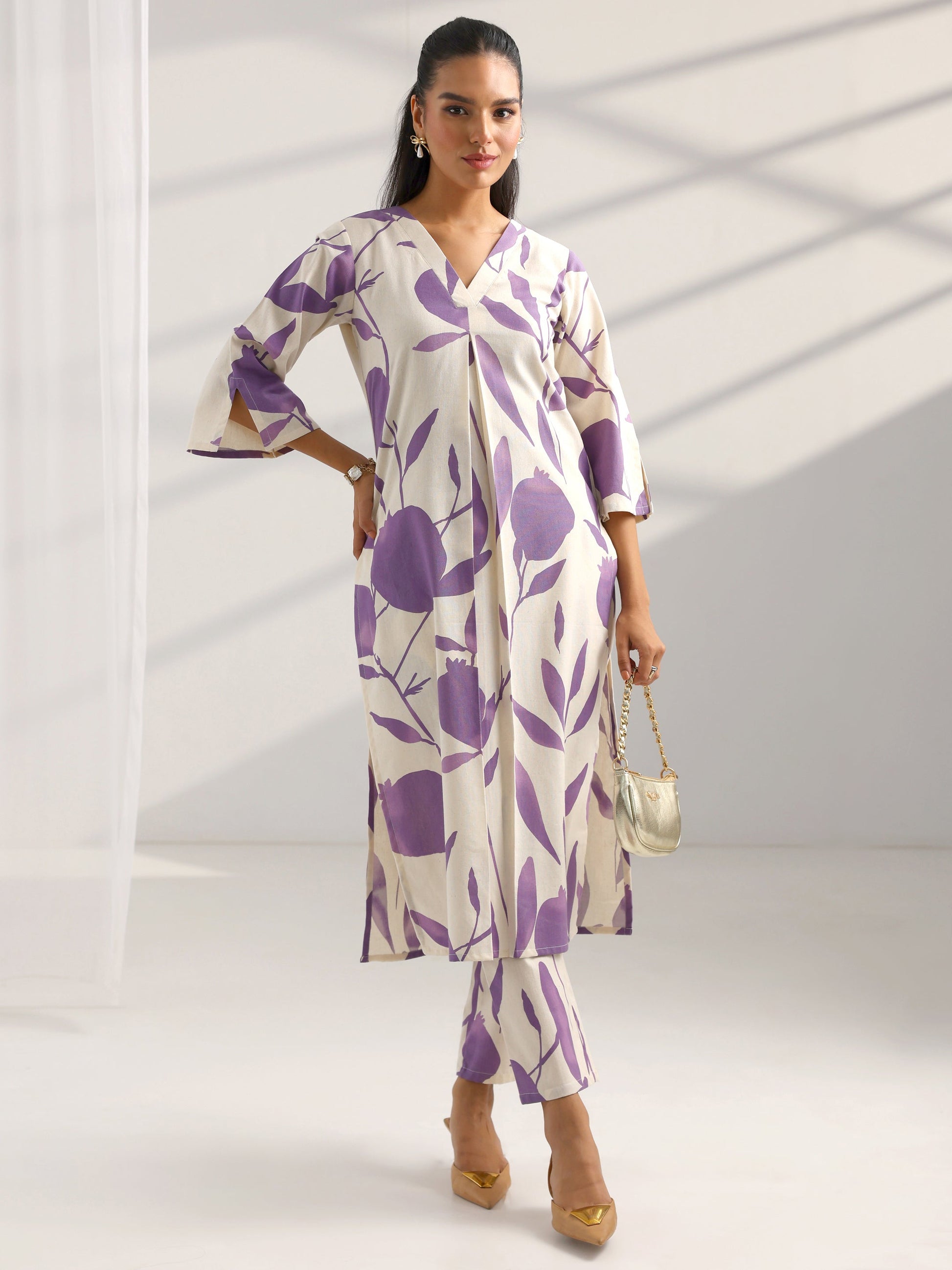 Our 2-piece Purple and Off White Cotton Straight-fit features a V-Neckline, Regular Sleeves, and statement Yoke. Complemented with Straight Pants with a Partially Elasticated waistband and 2 pockets. Adorned with Floral prints, this style is perfect for Casual wear.