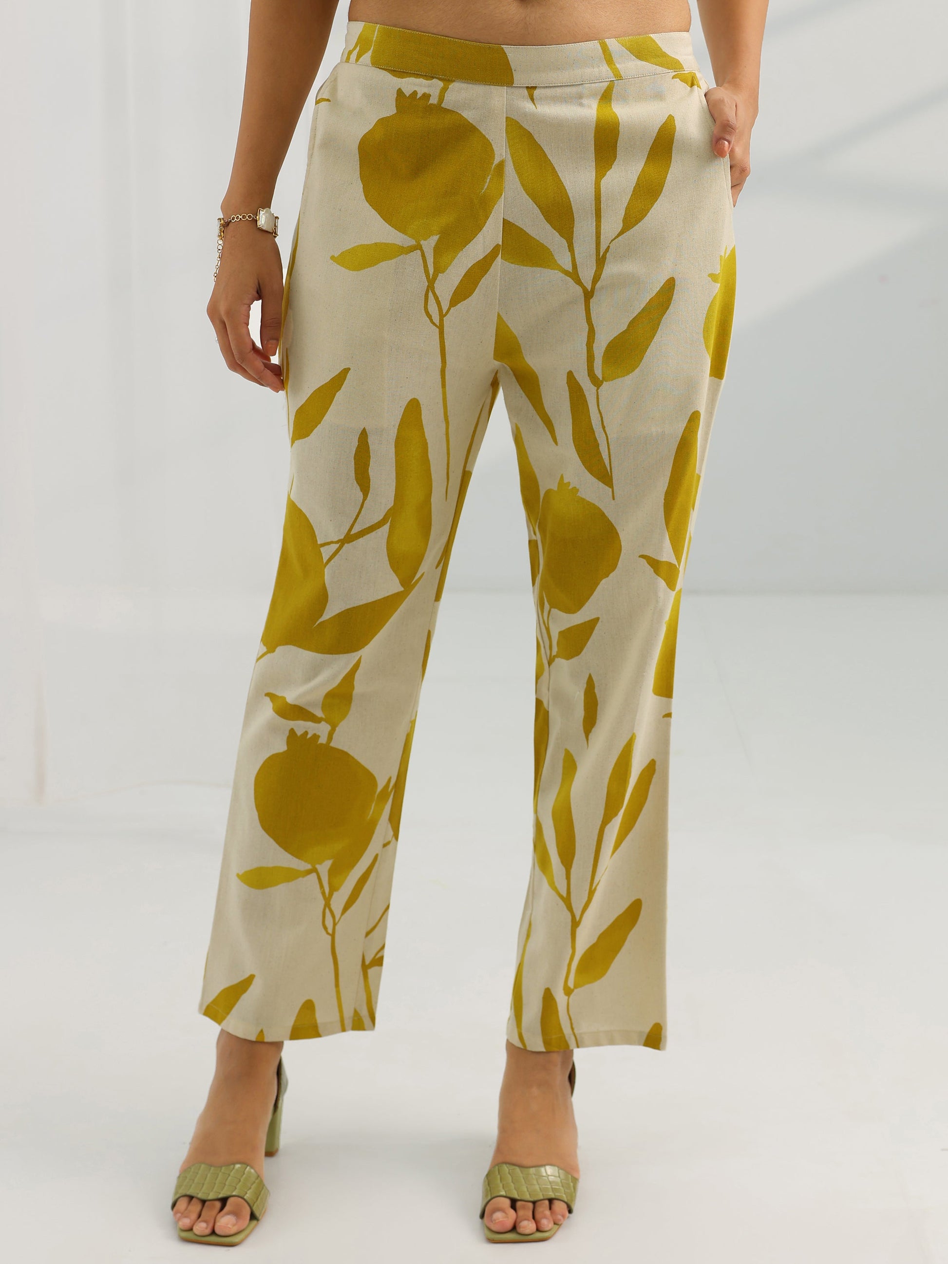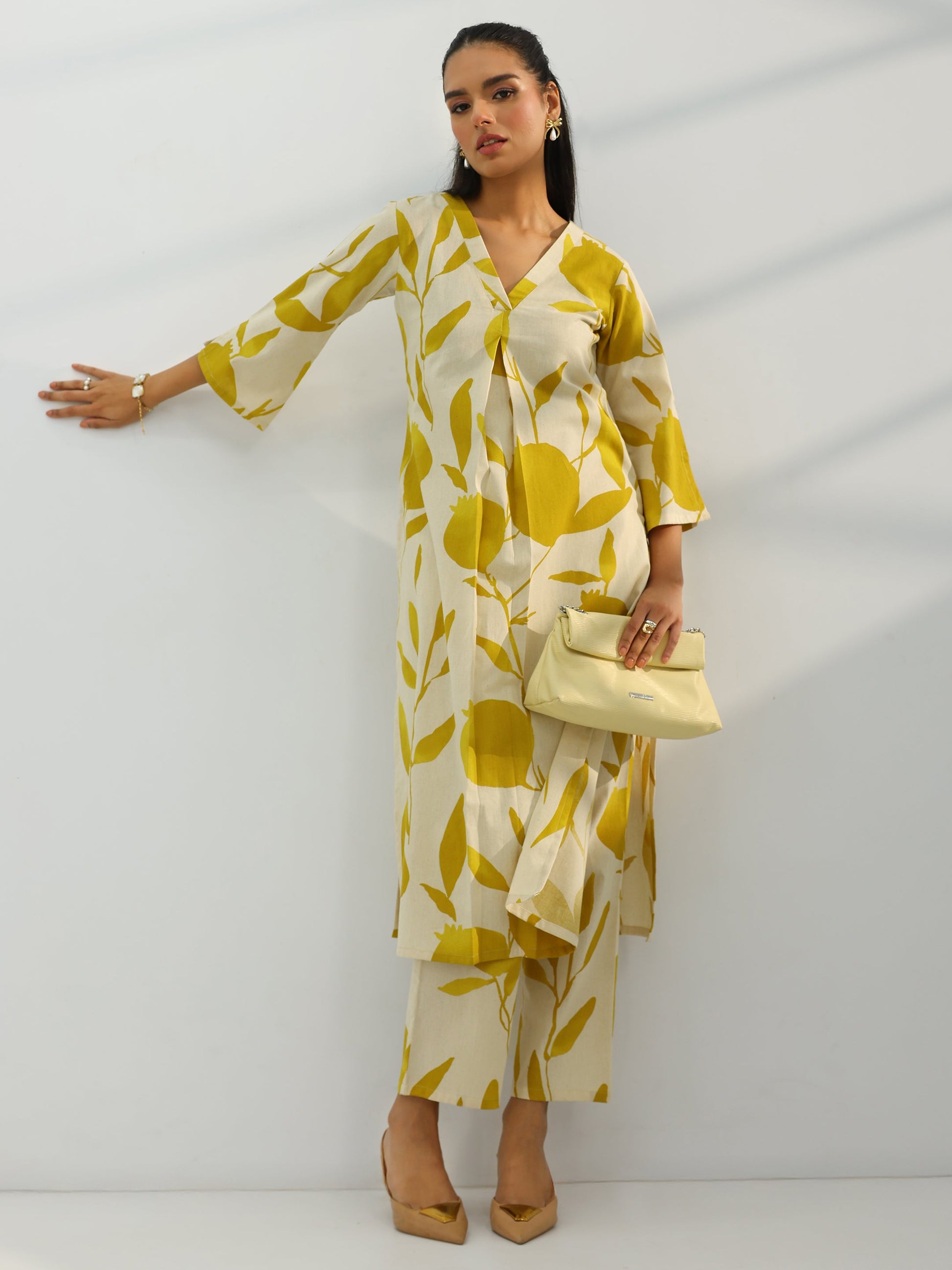 Our 2-piece yellow and off-white cotton straight-fit kurta set features a V-neckline, regular sleeves, and a statement yoke. Complemented with straight pants with a partially elasticated waistband and 2 pockets. Adorned with floral prints, this style is perfect for casual wear.