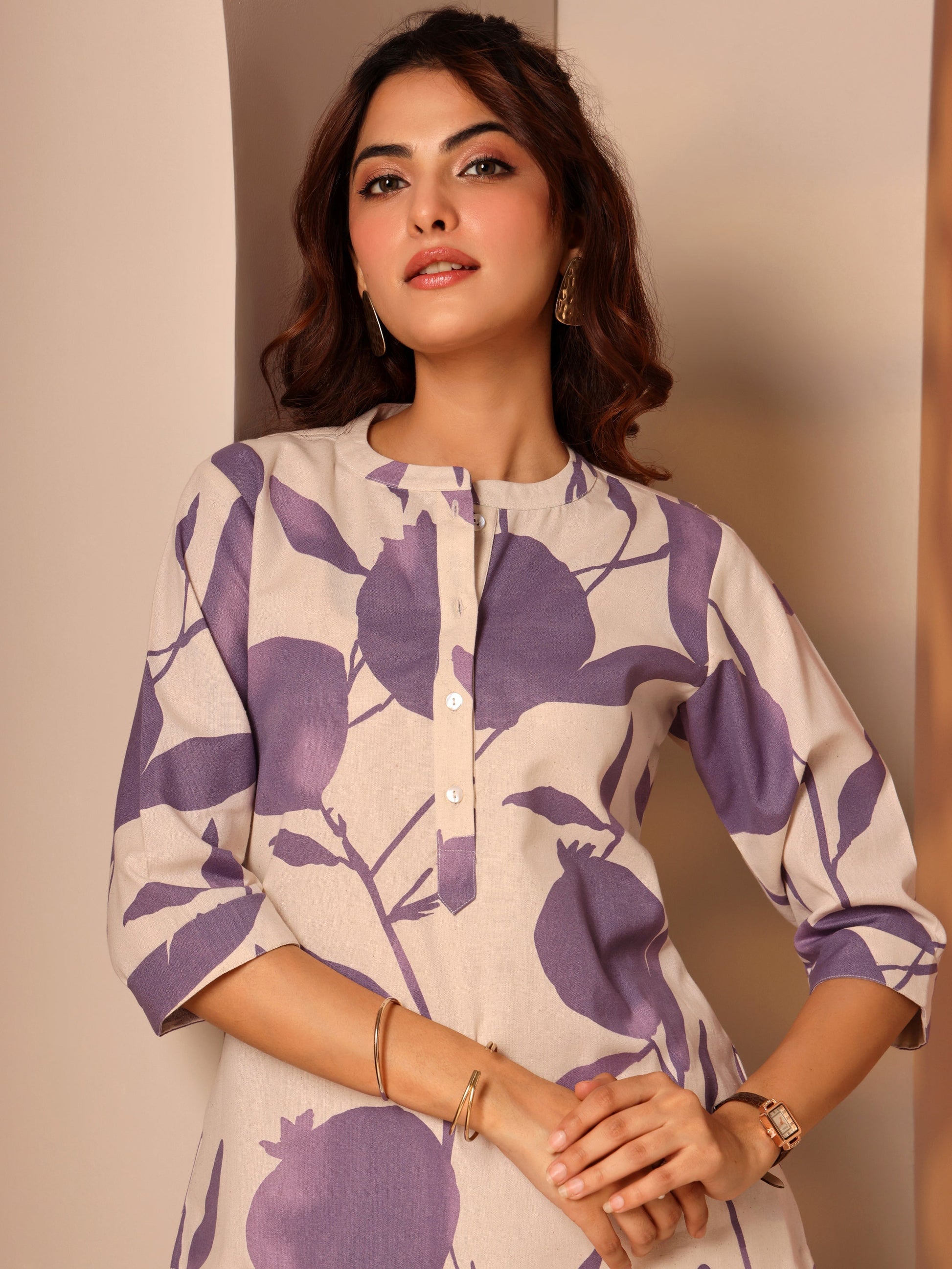 Off White Printed Cotton Straight Short Kurti
