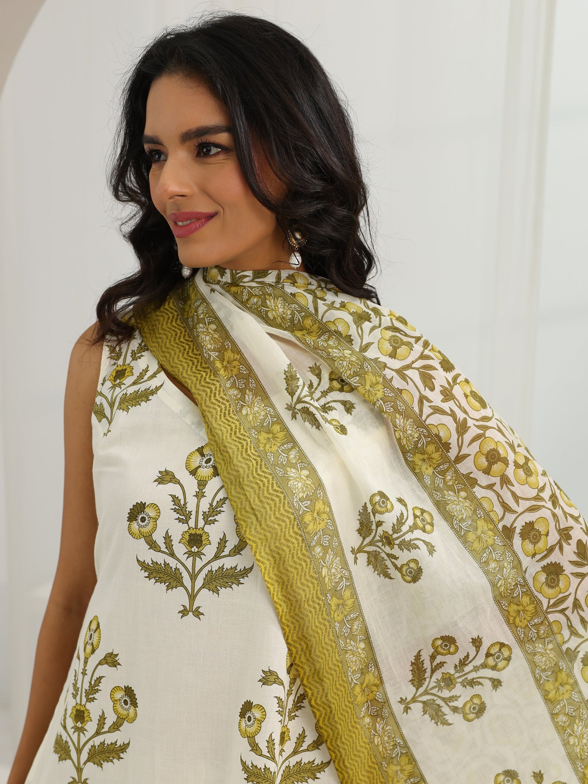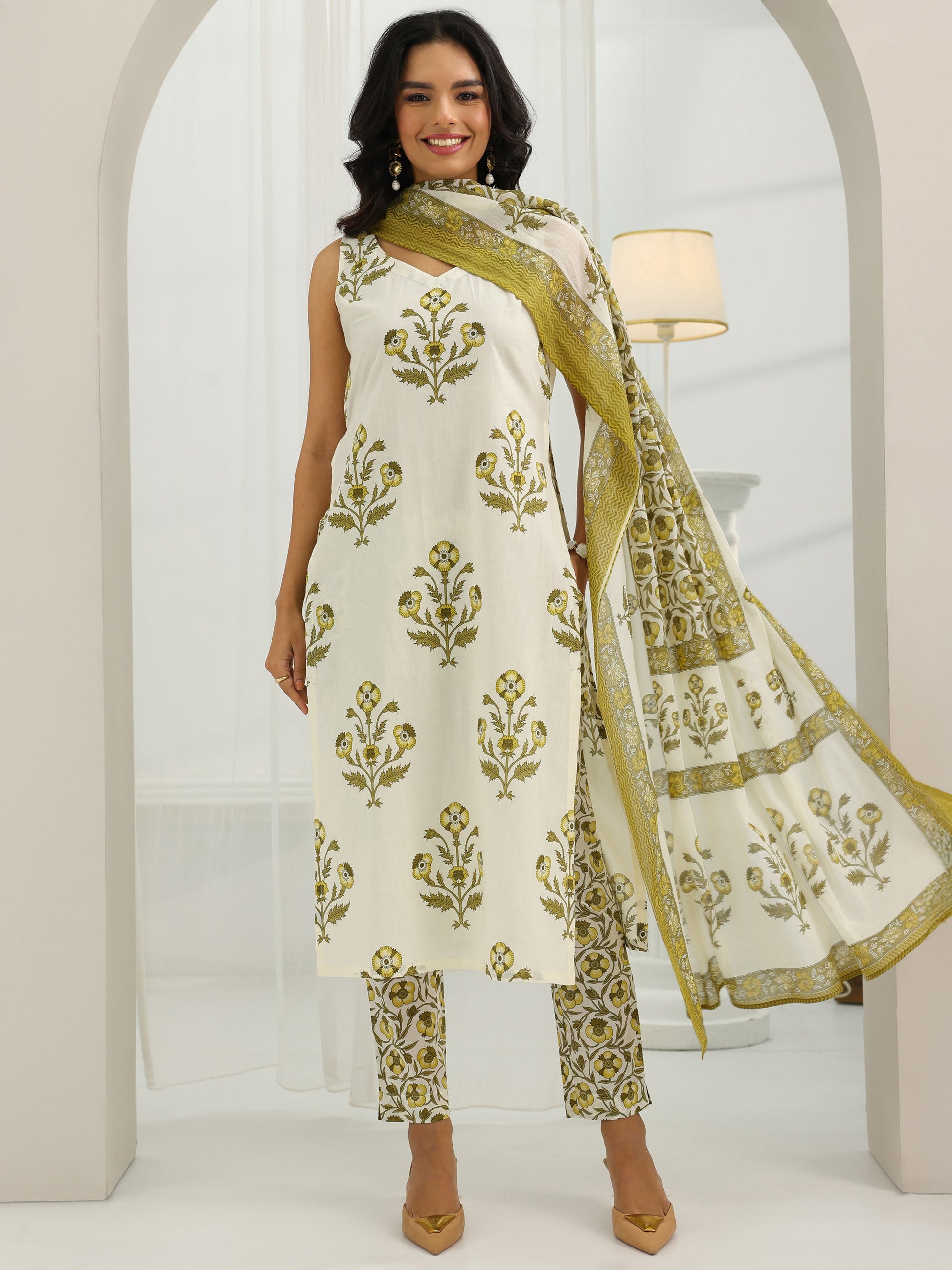 Off White Printed Cotton Straight Suit Set With Dupatta