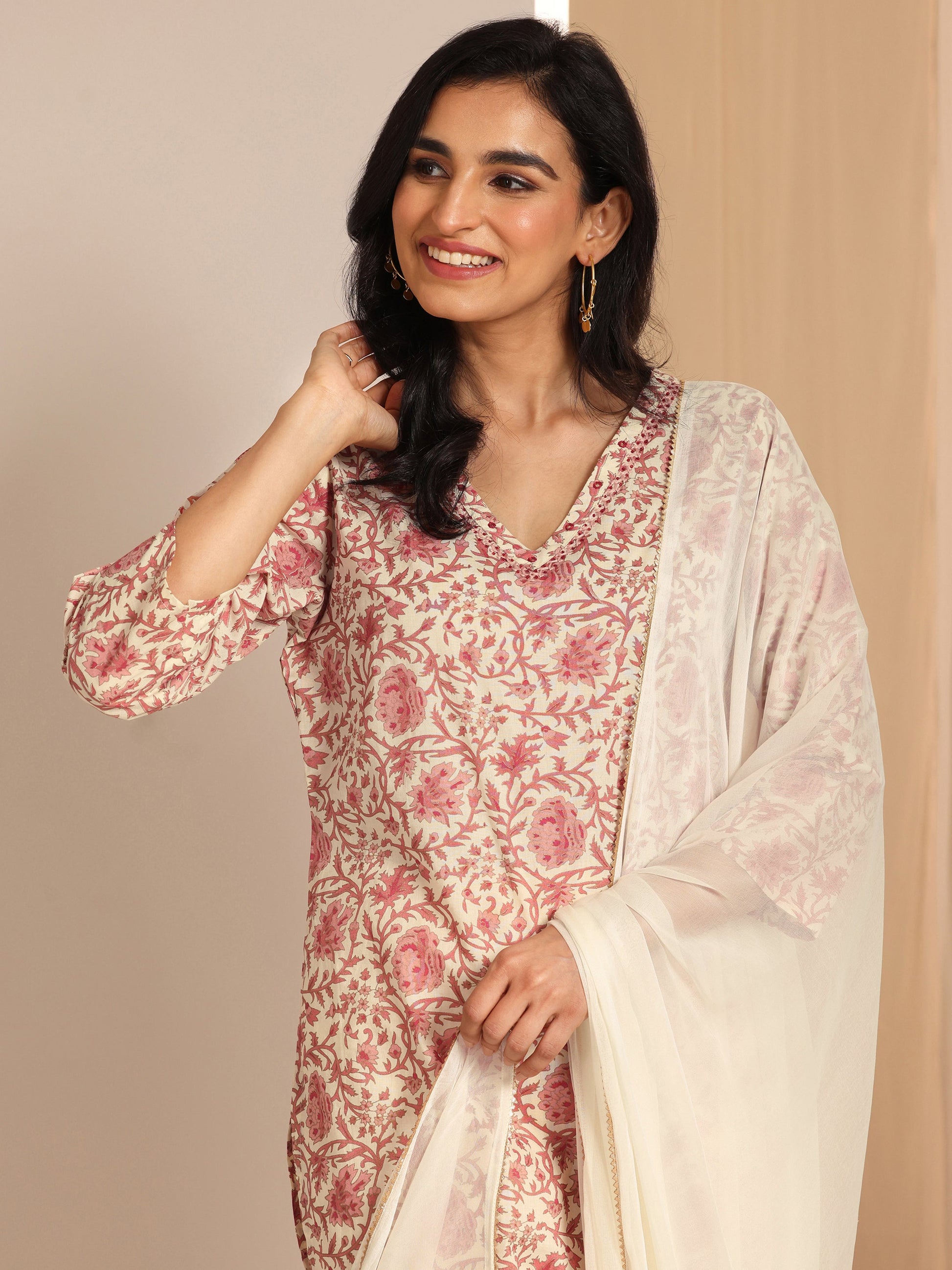 Our 3-piece pink cotton straight-fit kurta set features a V-neckline, regular sleeves, and statement yoke. Complemented with straight pants with a partailly elasticated waistband and 2 pocket, and a solid dupatta. Adorned with floral prints, this style is perfect for casual occasions.