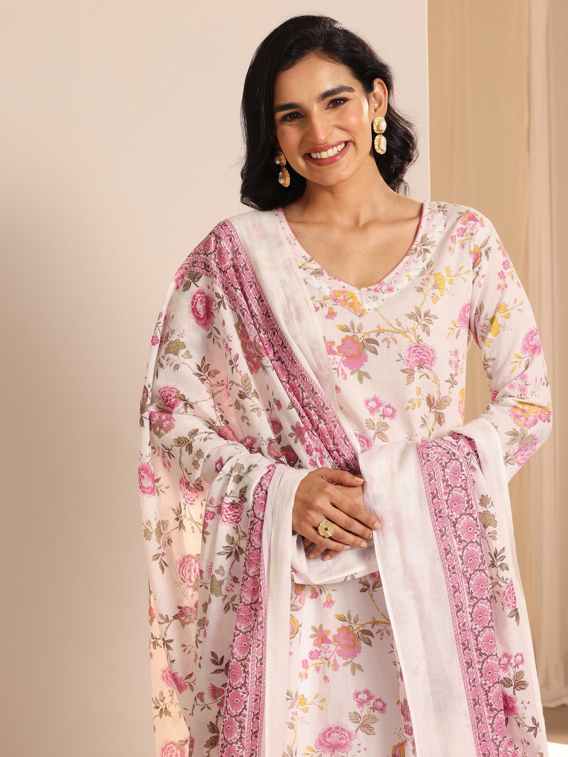 Off White Printed Cotton Straight Suit Sets With Dupatta