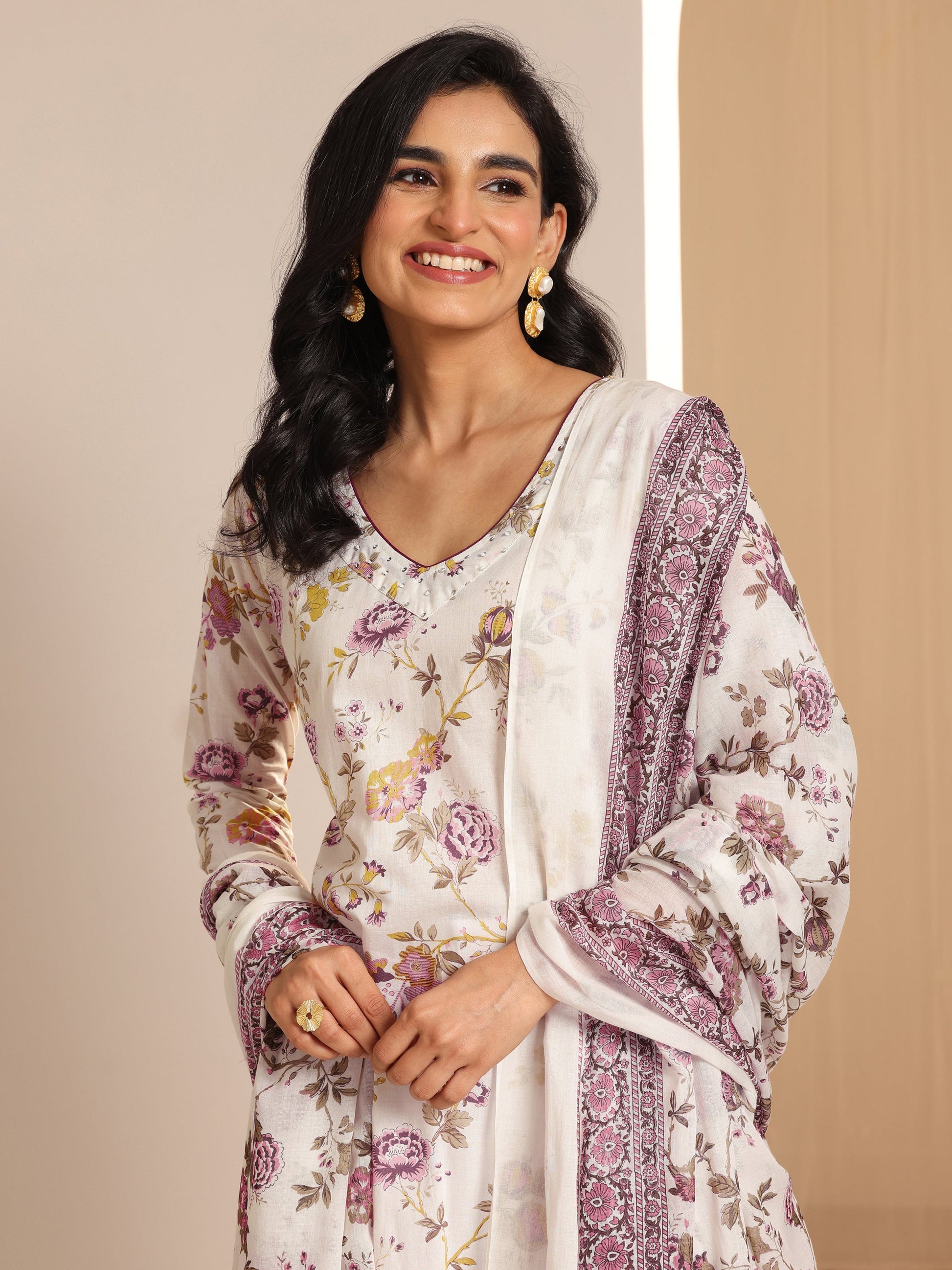 Off White Printed Cotton Straight Suit Sets With Dupatta