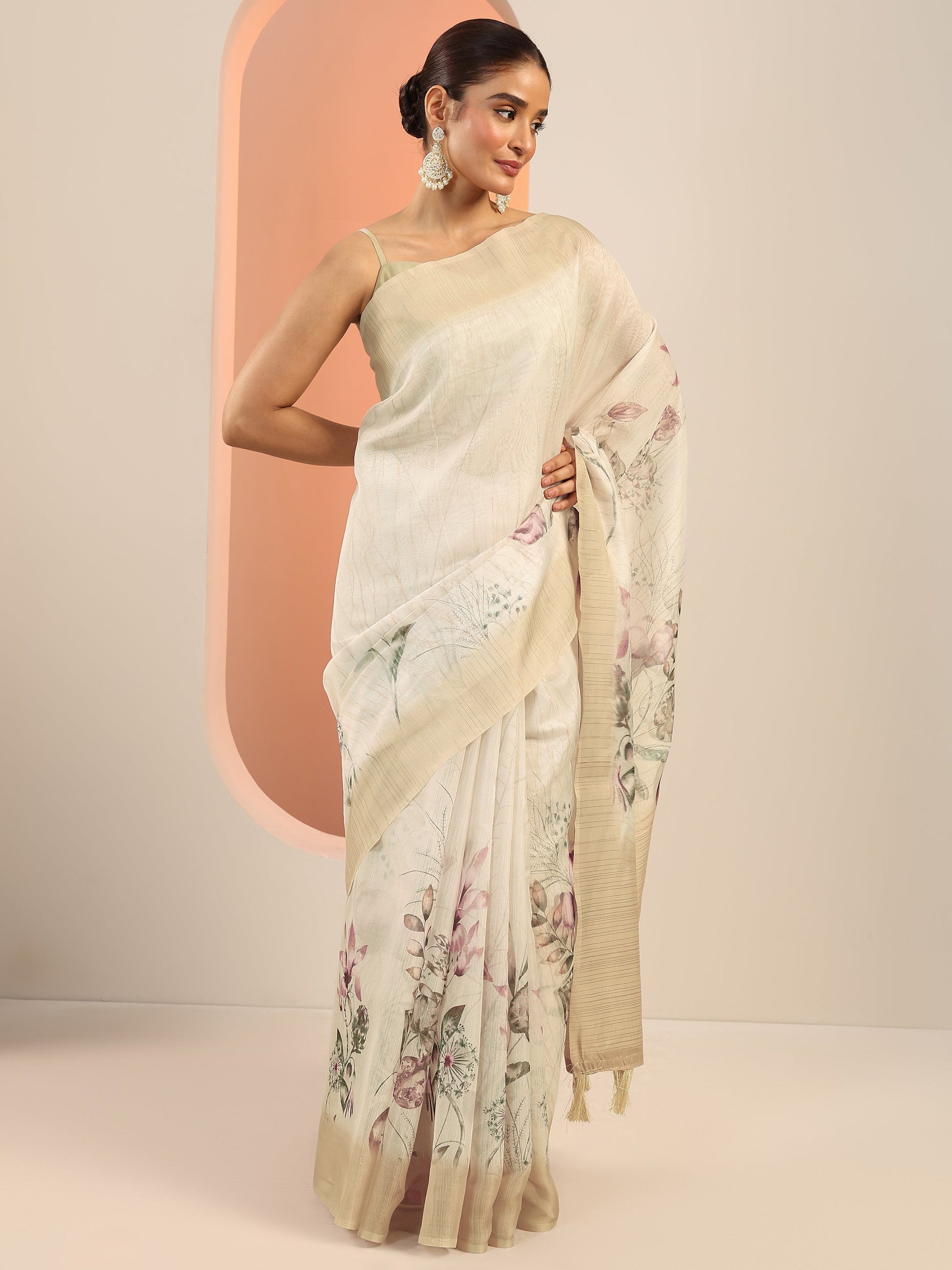 Off White Printed Organza Saree With Unstitched Blouse Piece