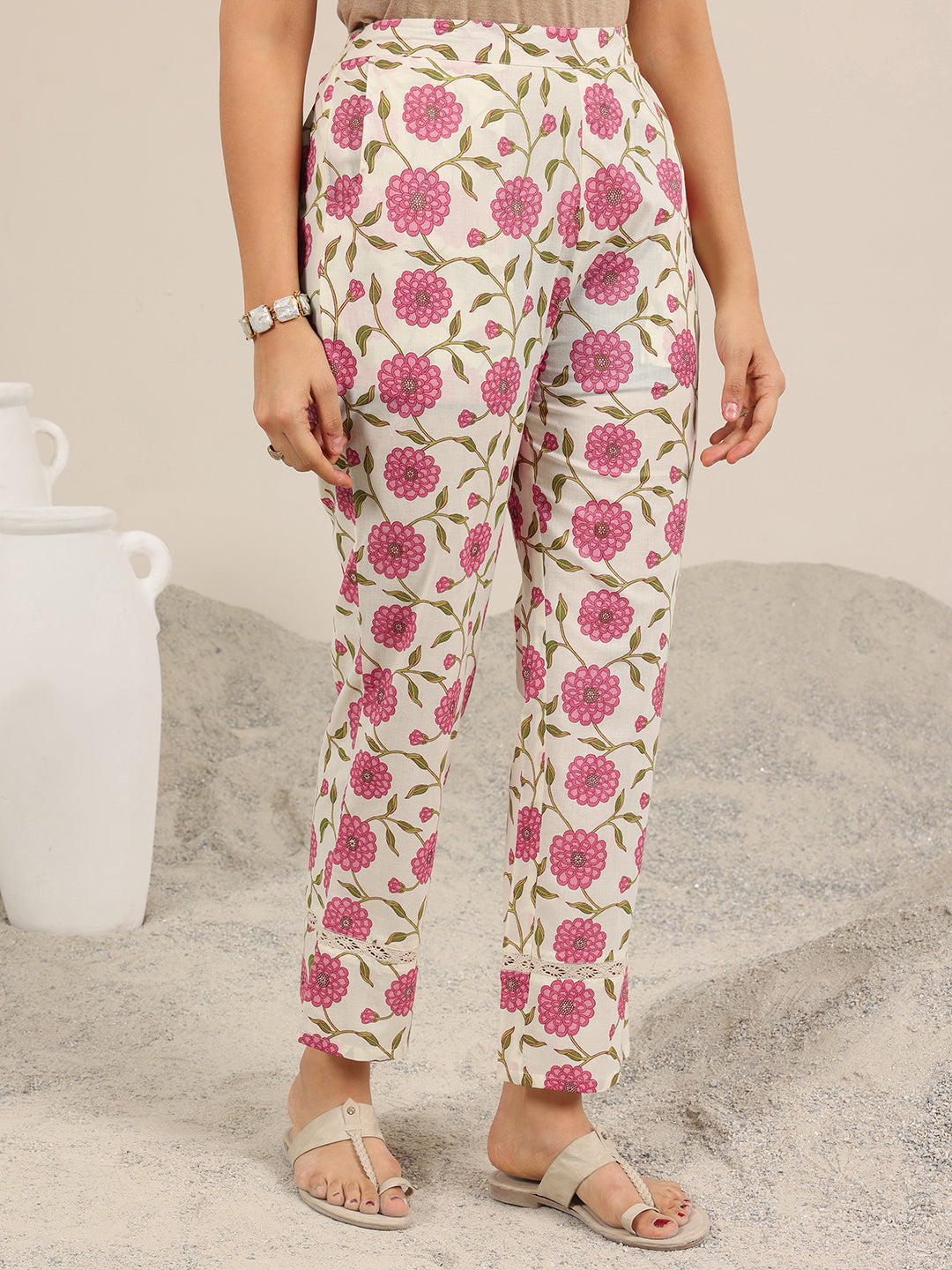 Our 2-piece Off White and Pink Cotton A-line features a Round Neckline, Regular Sleeves, and statement Yoke. Complemented with Straight Pants with a Partially Partially Elasticated waistband and Roomy Pockets. Adorned with Floral Prints, this style is perfect for Casual wear.