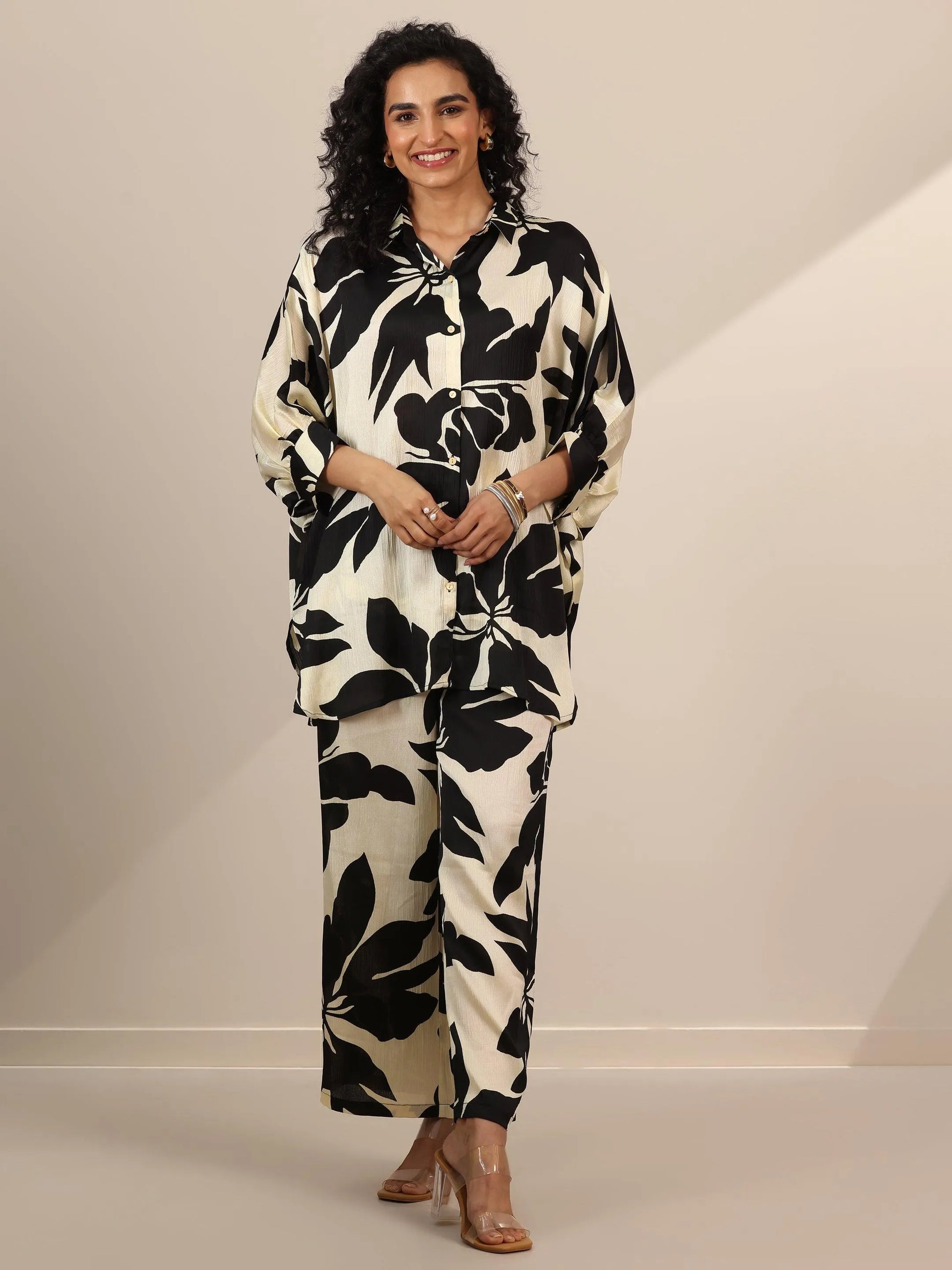 Our 2-piece Black and Off White printed Silk Blend co-ord set features a Straight-fit Shirt with a Shirt Collar neckline and Three-quarter sleeves. Complemented with matching Palazzos with an Elasticated waistband. Highlighted with Printed, this style is perfect for Casual.