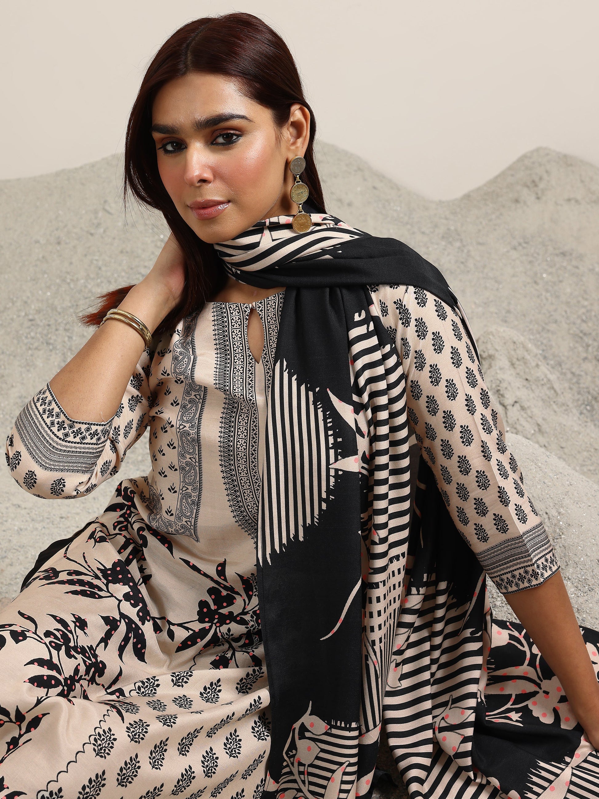 Off White Printed Silk Blend Straight Suit With Dupatta