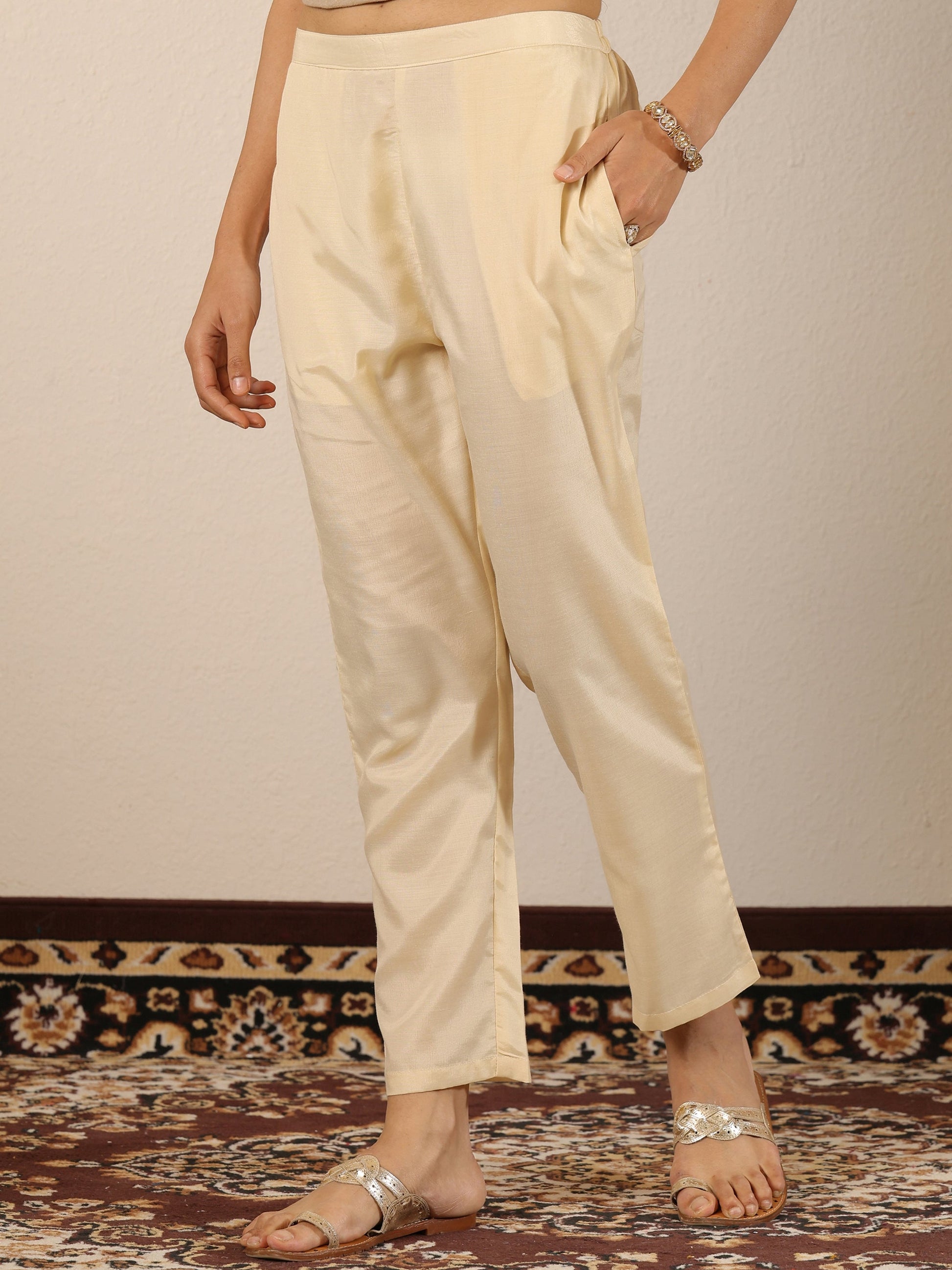 Our 3-piece Off White and Pink Silk blend Kurta Set features a Straight-fit kurta with a Round Neckline, Regular Sleeves, and statement yoke. Complemented with Straight Pants with a Partially Elasticated waistband and 2 pockets, and an Embroidered dupatta. Adorned with Floral Woven Design, this style is perfect for Festive occasions.