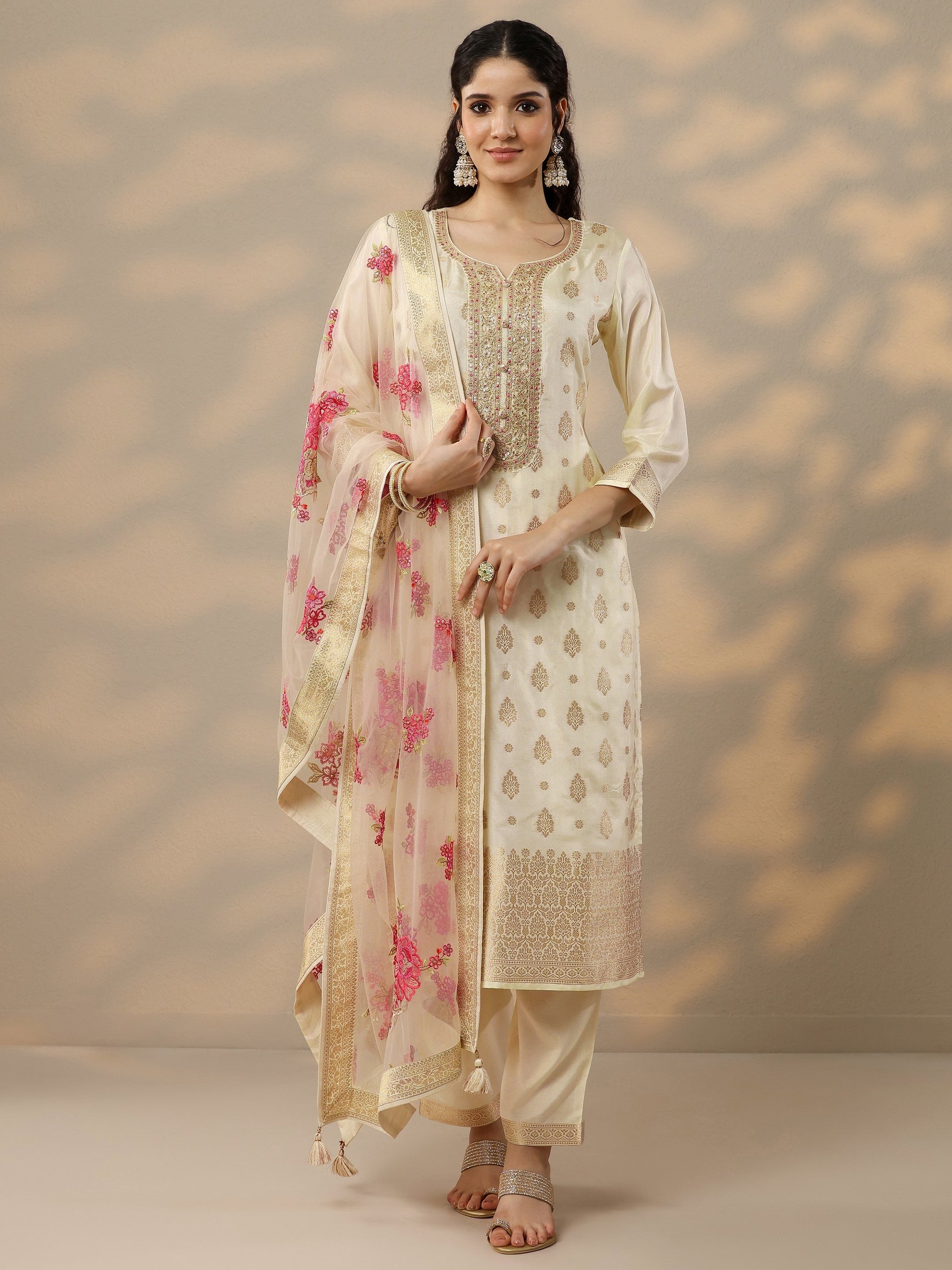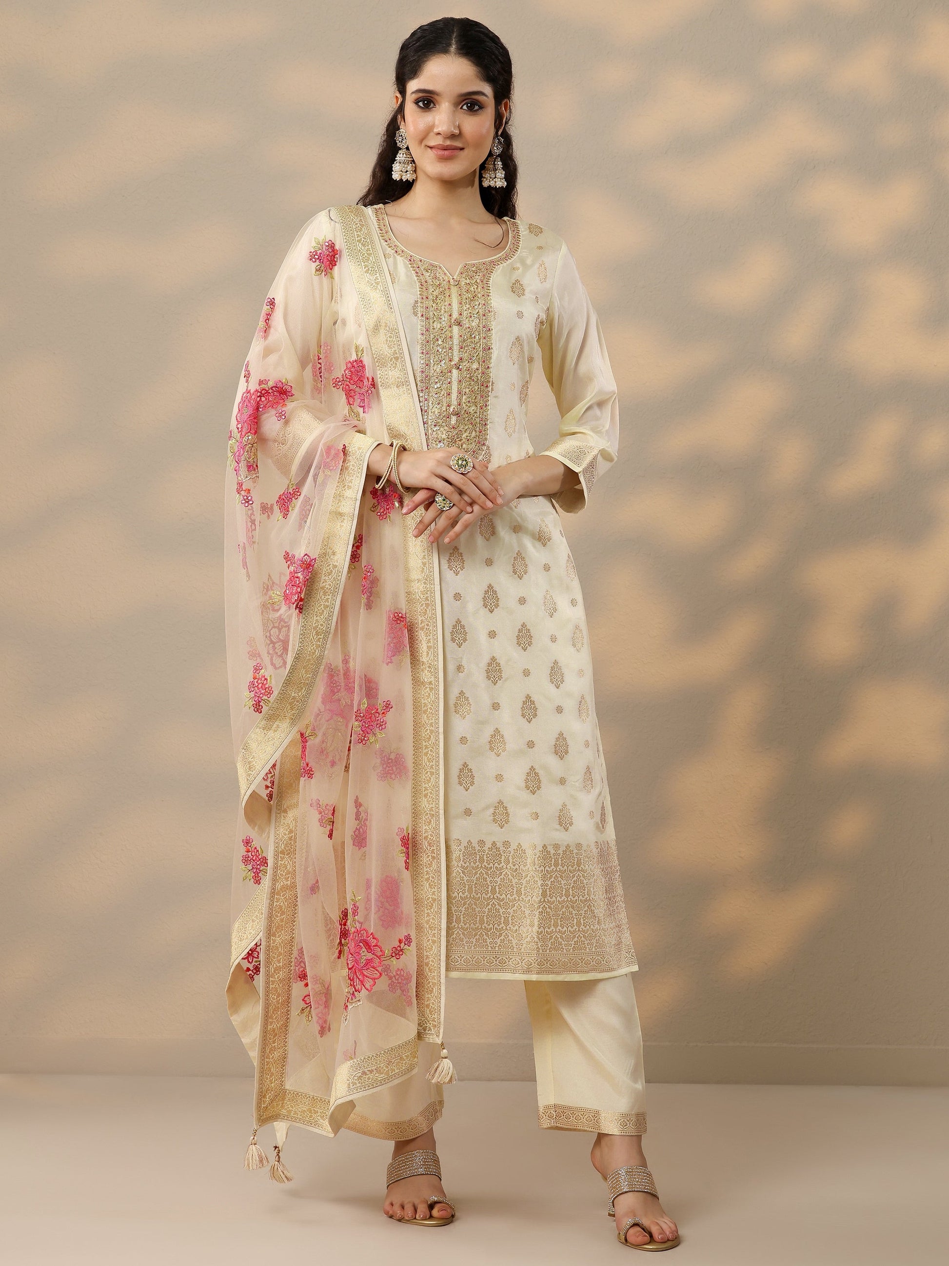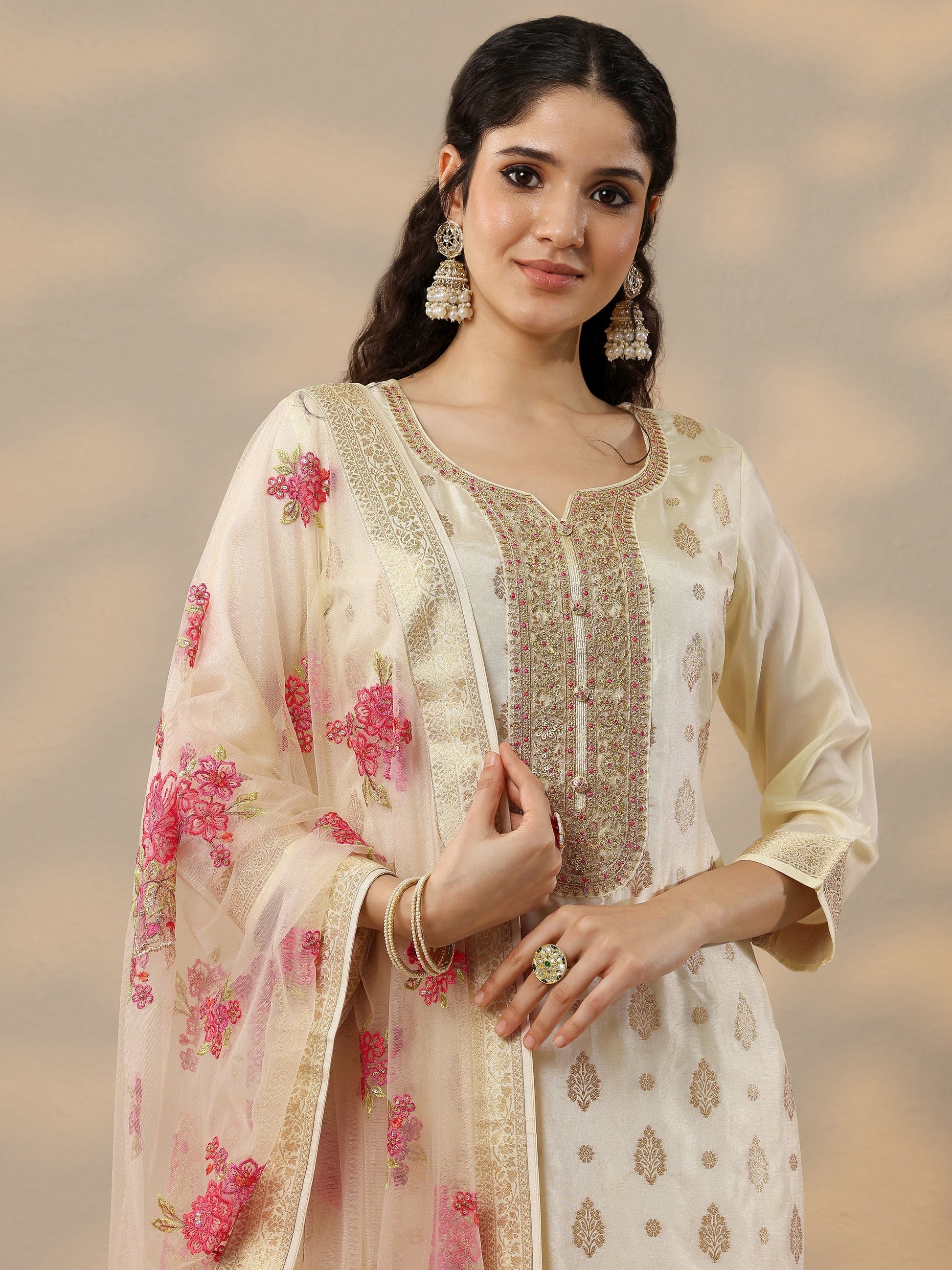 Off White Woven Design Silk Blend Straight Suit Set With Dupatta