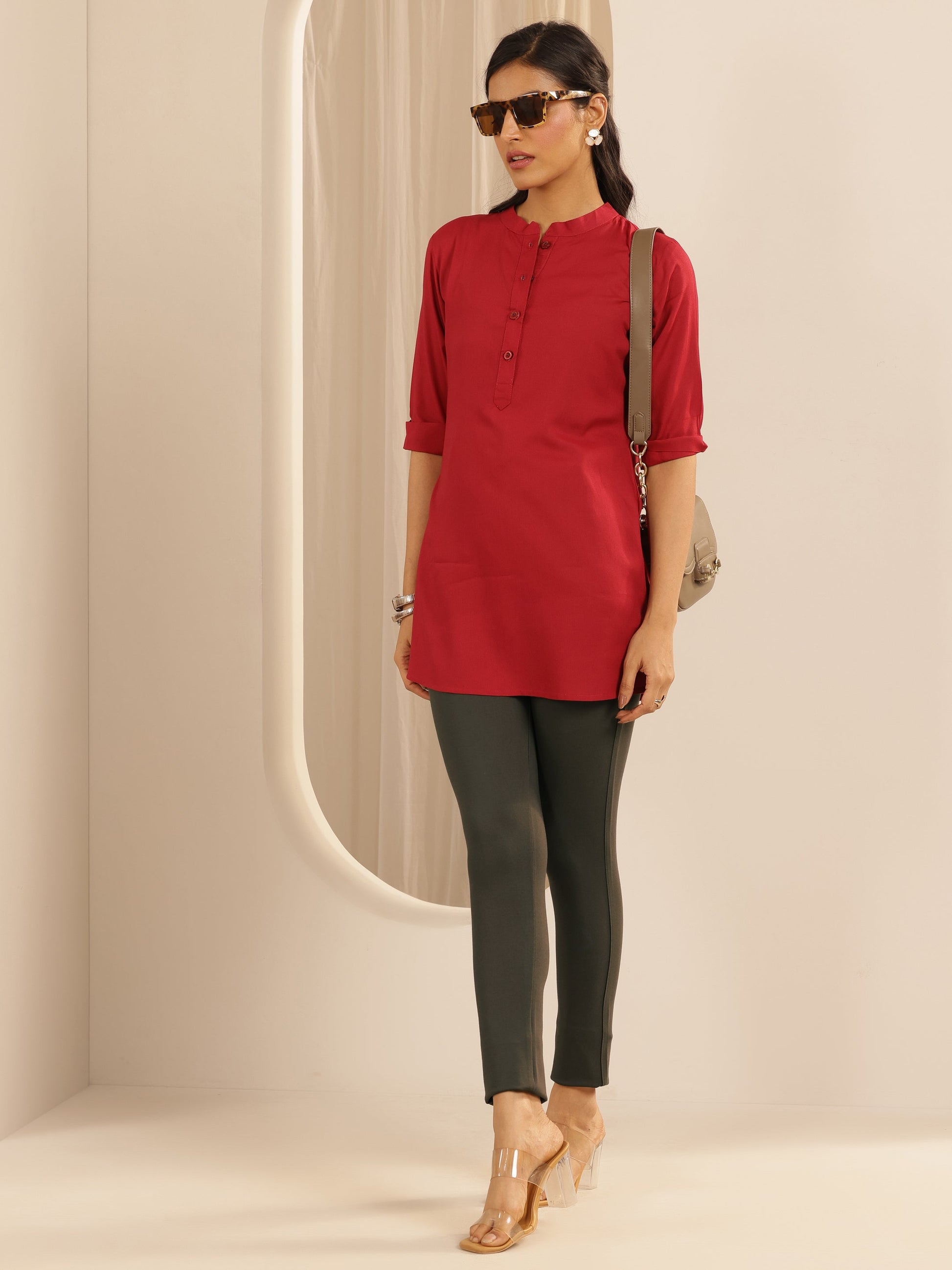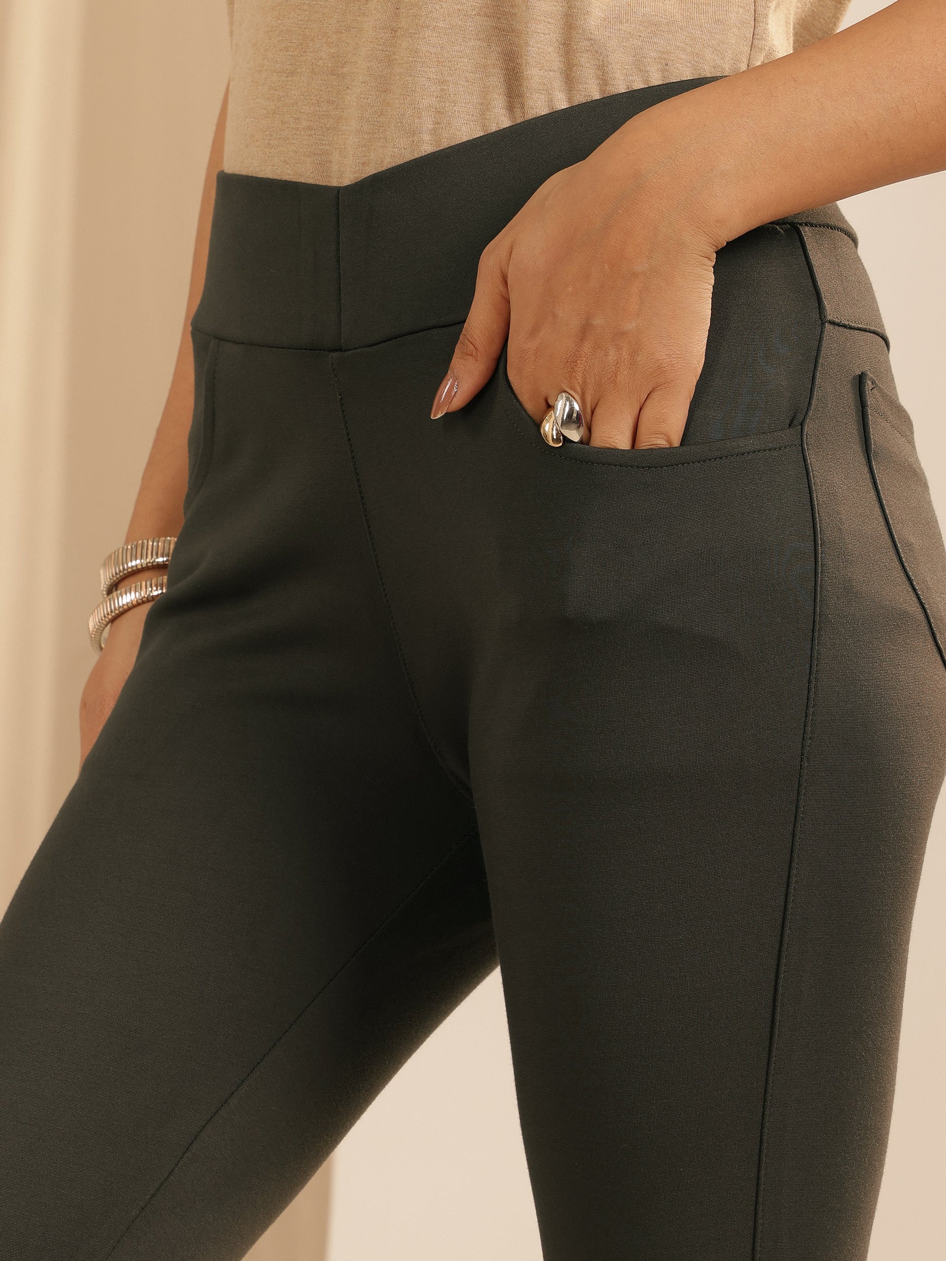 Our brown rayon blend trousers feature a mid-rise waist style with slip-on closure and 2 pockets. Adorned with solid embellishments, this intricate style is perfect for casual wear.