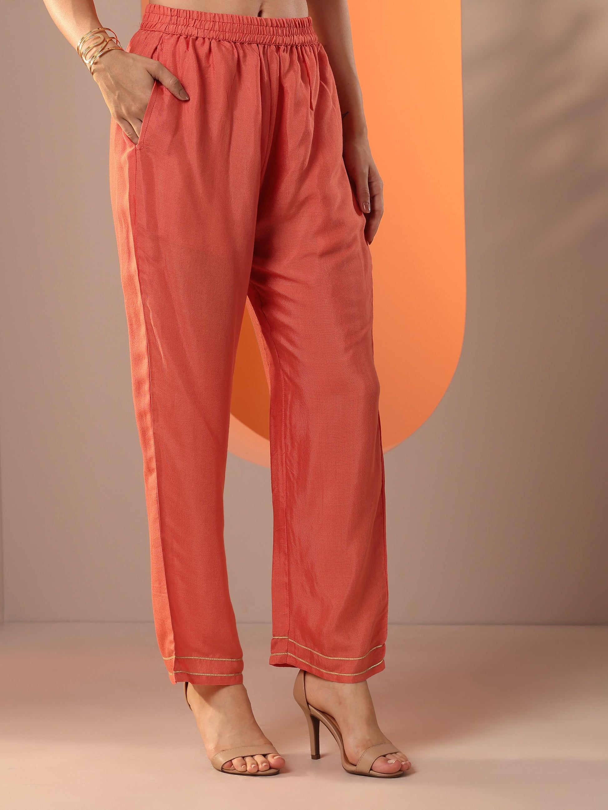 Our 3-piece peach Chinon straight-fit kurta set features a V-neckline, regular sleeves, and statement yoke. Complemented with straight pants with a partially elasticated waistband and a printed dupatta. Adorned with embroidered embellishments, this style is perfect for festive occasions.