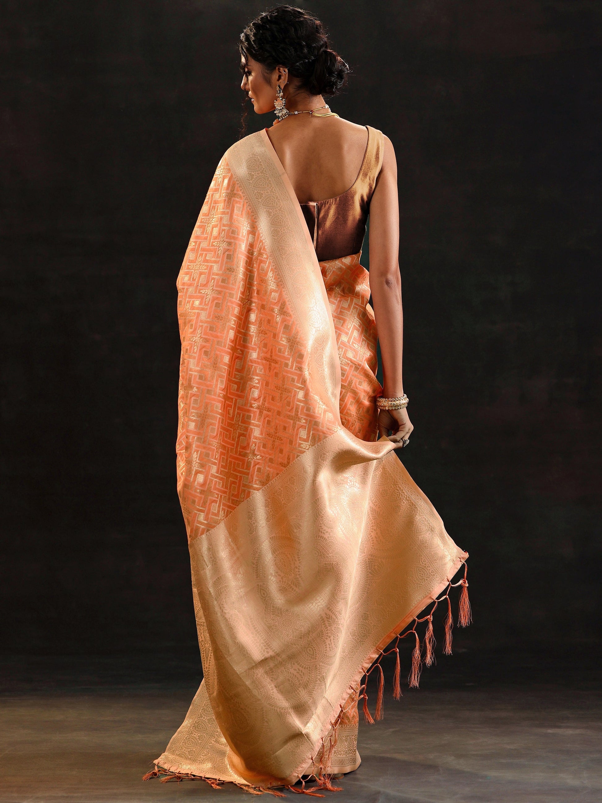 Our Orange Woven Design Silk Blend Saree Features Captivating Geometric Print. Complemented With A Unstitched Blouse Piece. This Charming Saree Is Perfect For Festive Wear