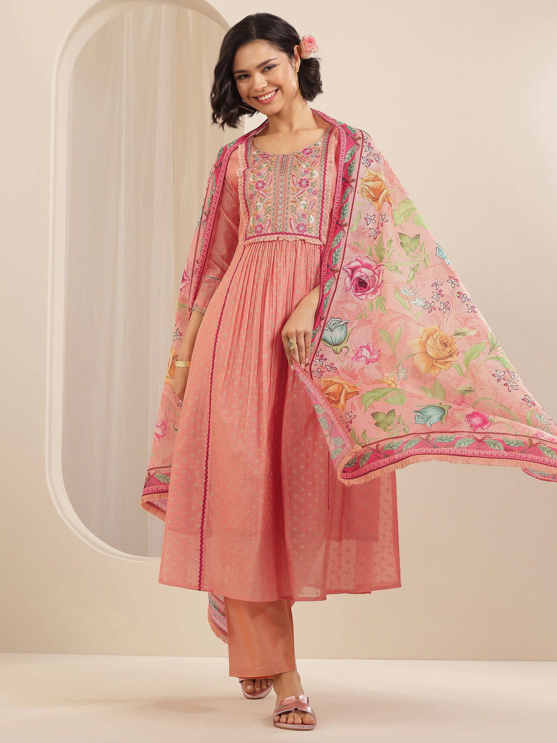 Peach Embroidered Chanderi Silk A-line Suit Sets With Dupatta