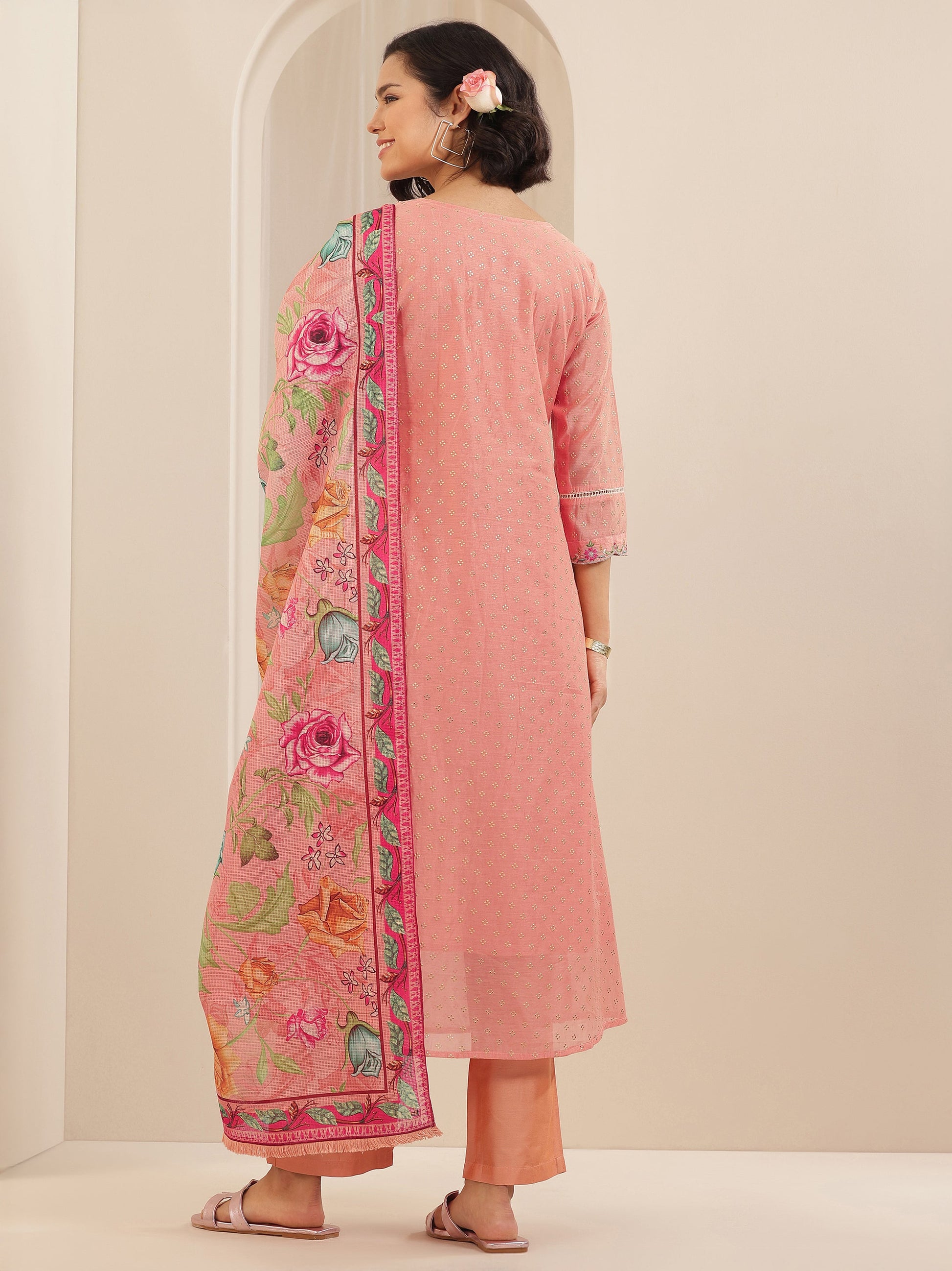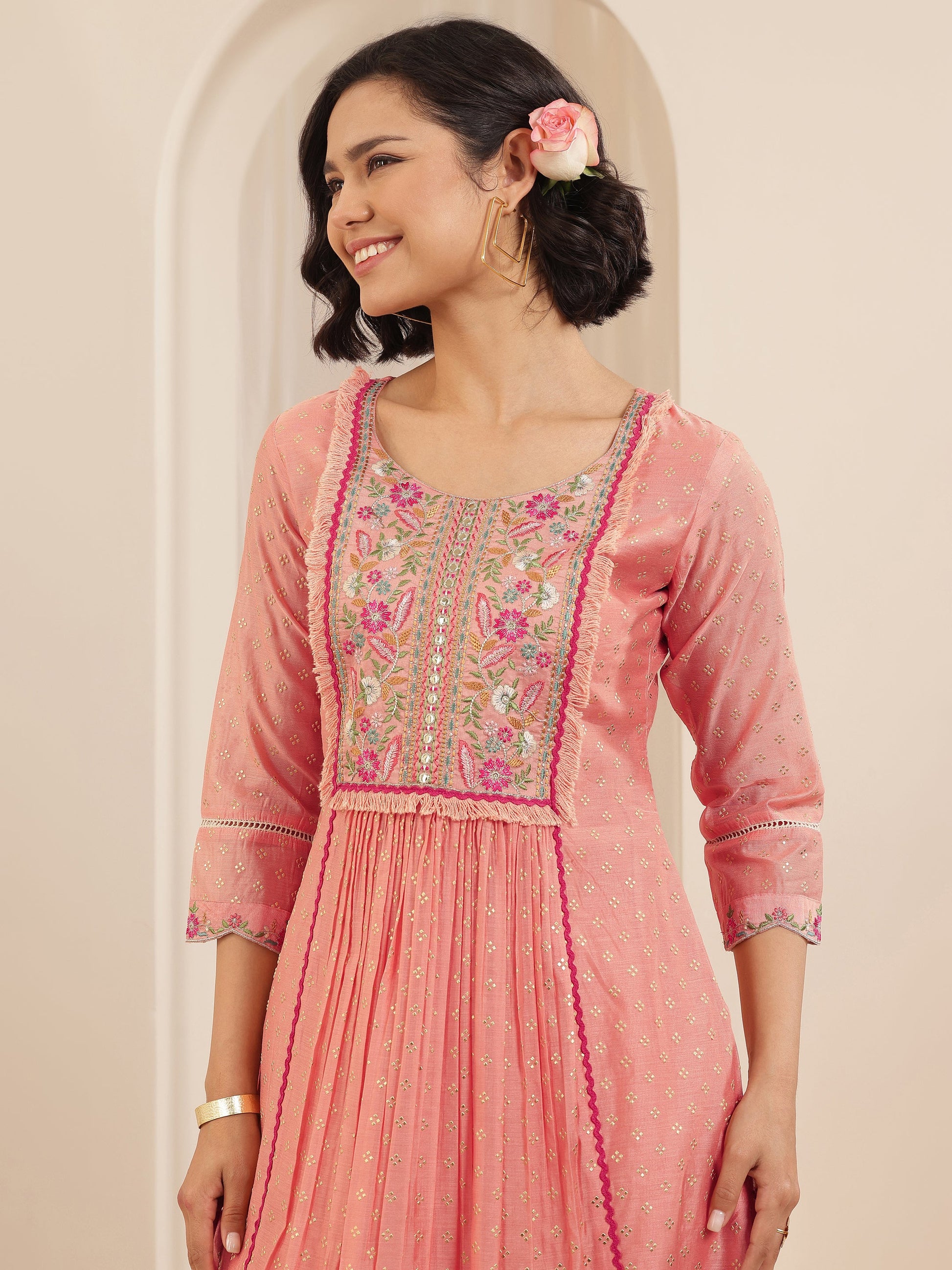 Our 3-piece peach Chanderi Silk features an Anarkali Kurta Set with a round neckline, regular sleeves, and statement yoke. Complemented with straight pants with an elasticated waistband and a printed dupatta. Adorned with embroidered accents, this style is perfect for festive occasions.