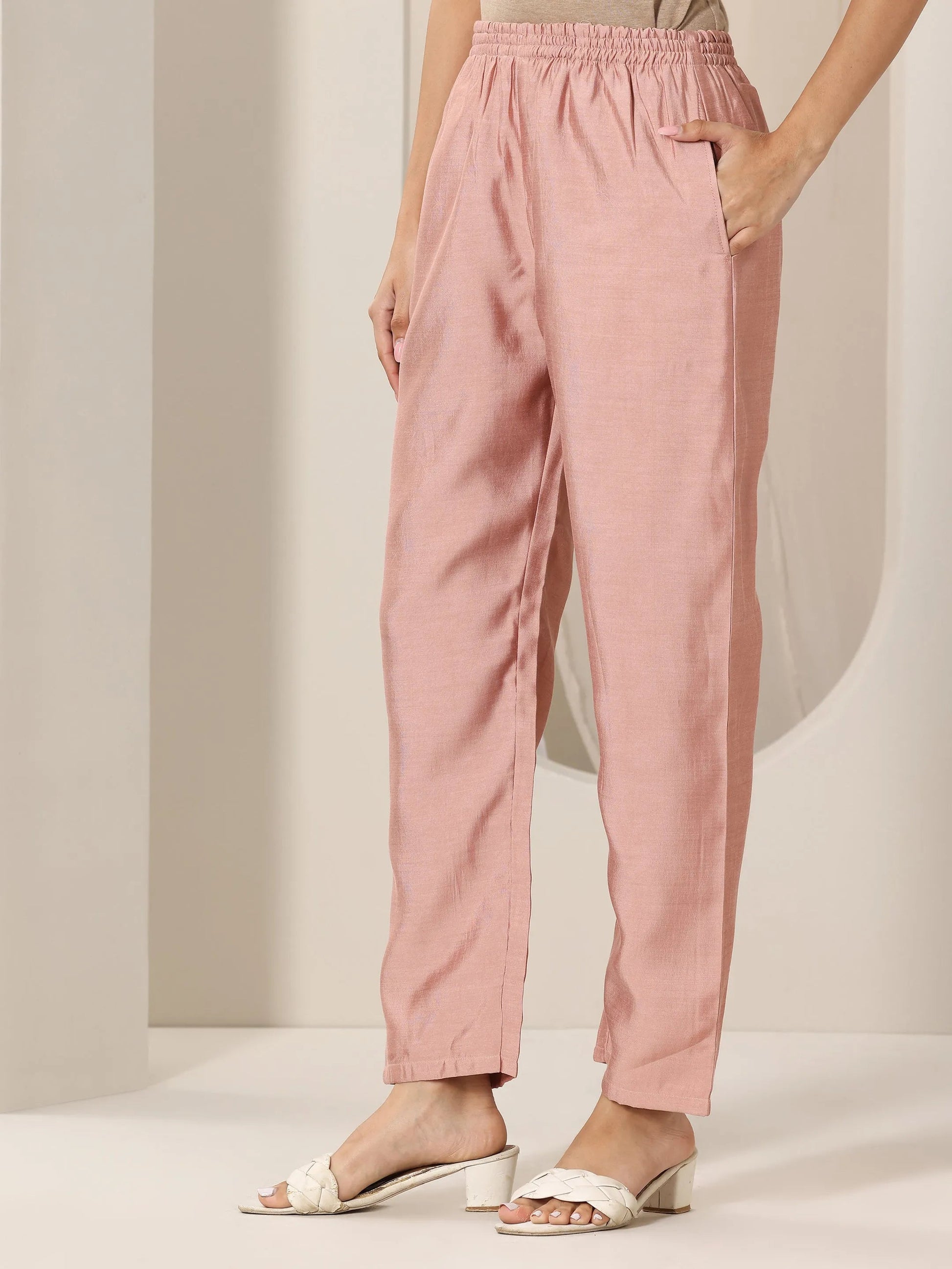 Our 3-piece peach organza suit set features a straight-fit kurta with a V-neckline, regular sleeves, and a statement yoke. Complemented with straight pants with an elasticated waistband and an embroidered dupatta. Adorned with embroidered accents, this style is perfect for casual occasions.