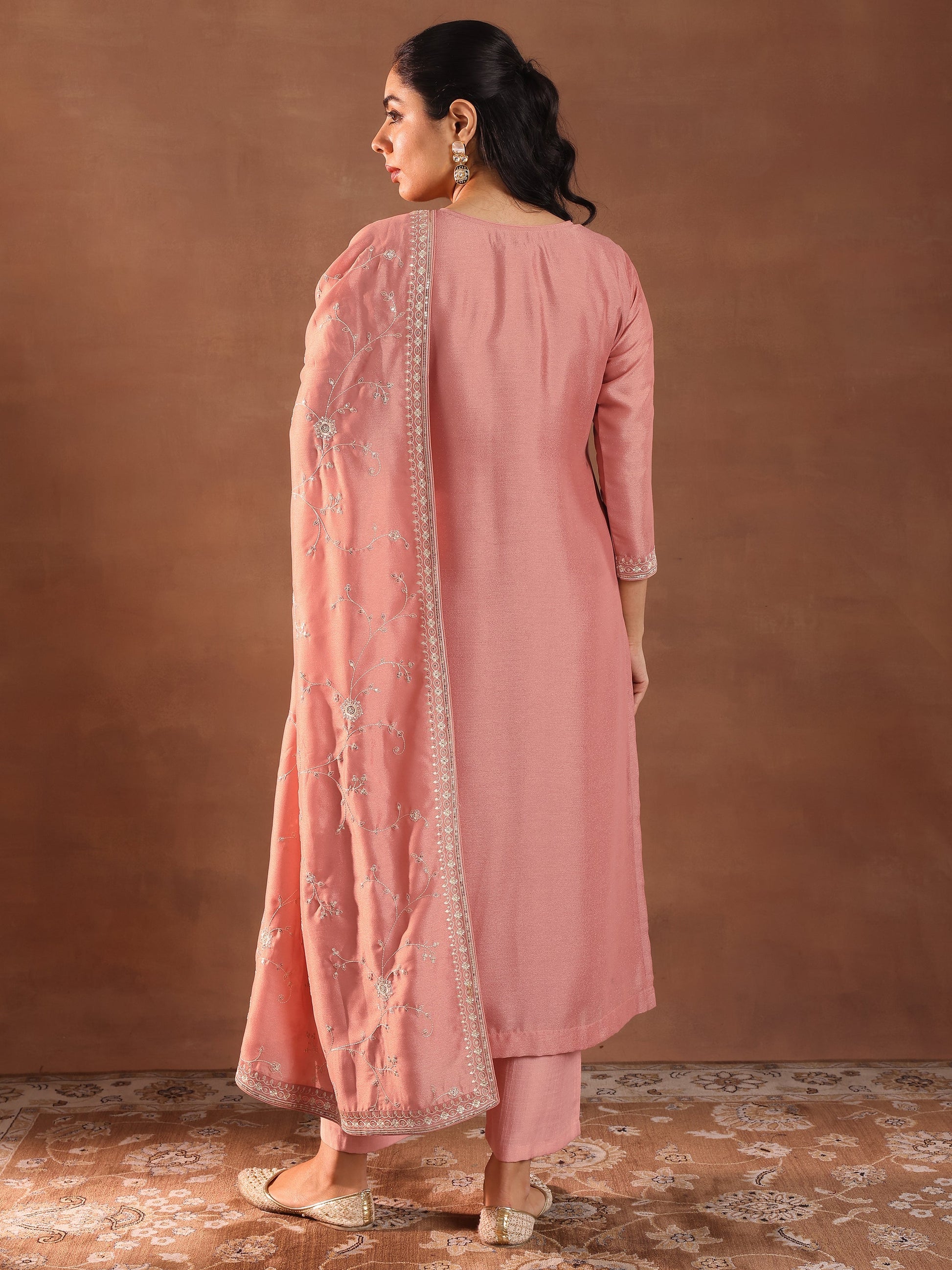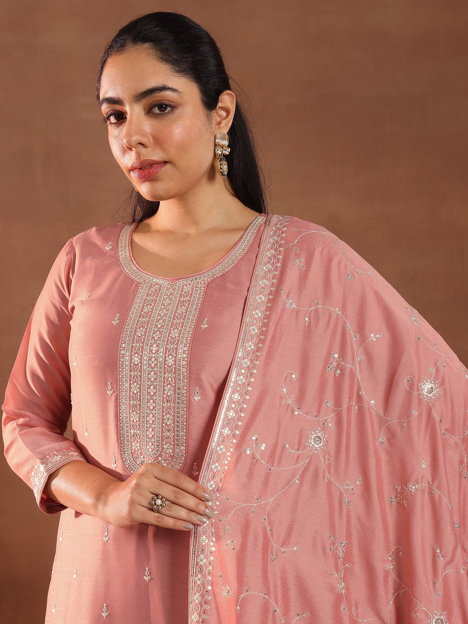 Our 3-piece peach silk blend kurta set features a straight-fit design with a round neckline, regular sleeves, and a statement yoke. Complemented with straight palazzo pants with an elasticated waistband and 2 pockets, and an embroidered dupatta. Adorned with embroidered accents, this style is perfect for festive occasions.