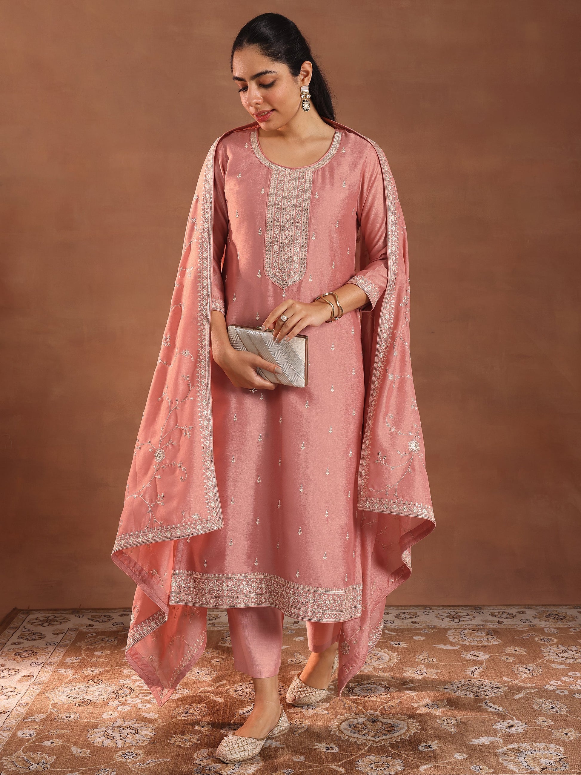 Peach Embroidered Silk Blend Straight Suit With Dupatta