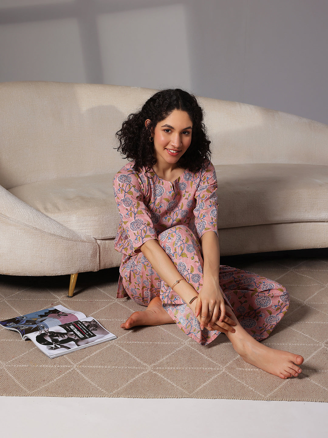 Our 2-piece peach printed cotton night suit features a short kurta with a notched neckline and three-quarter sleeves. Complemented with relaxed palazzo pants with a partially elasticated waistband and roomy pockets. Elevated with captivating floral prints, this style is an ideal pick for lounging at home.