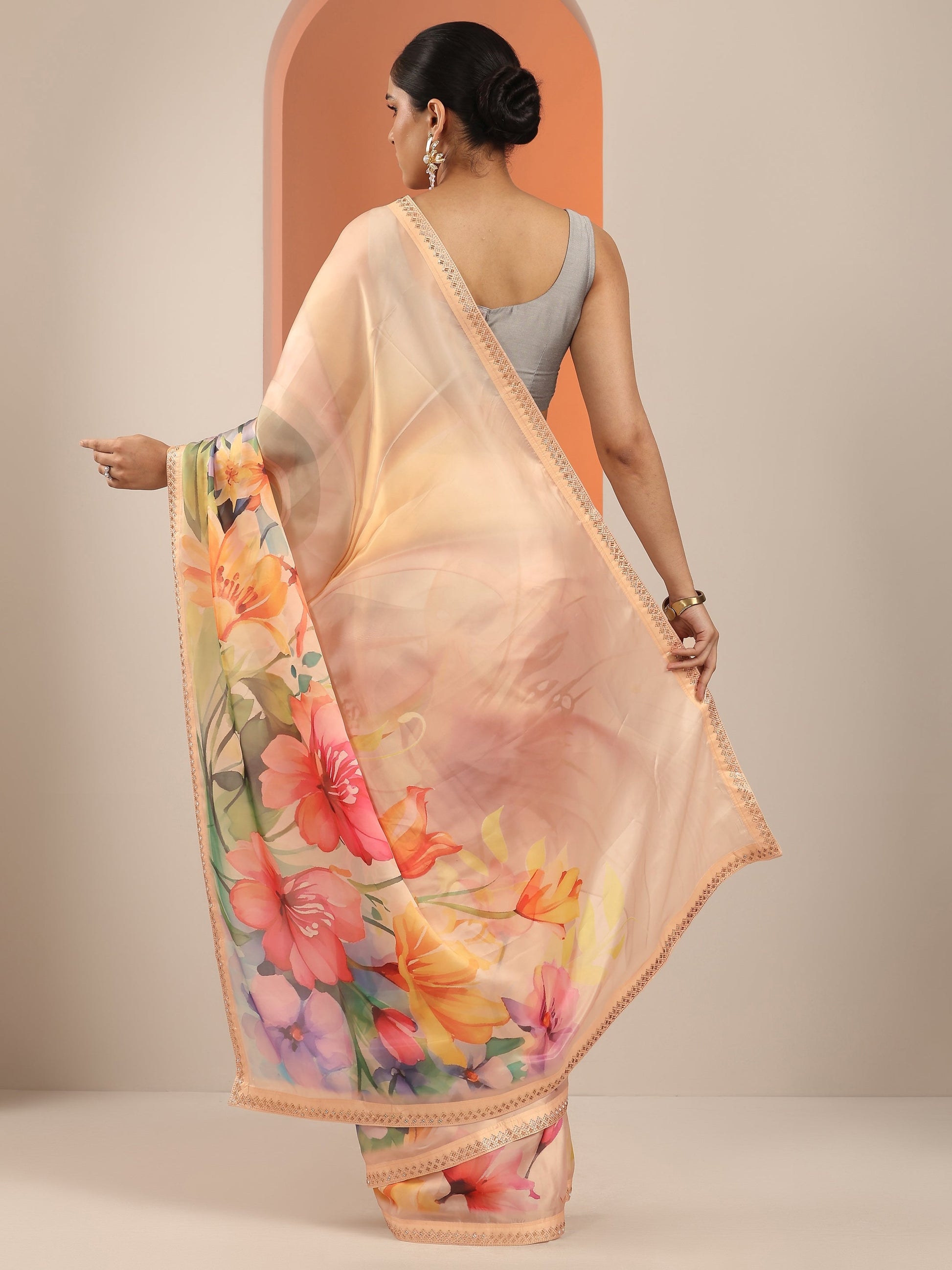 Our Peach Printed Organza Saree Features Captivating Floral Print. Complemented With A Unstitched Blouse Piece. This Charming Saree Is Perfect For Festive Wear