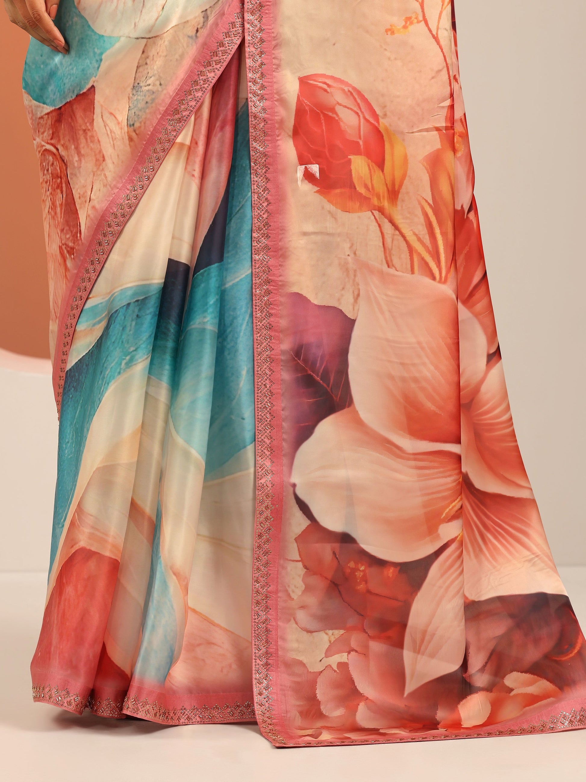 Our Multi Printed Organza Saree Features Captivating Floral Print. Complemented With A Unstitched Blouse Piece. This Charming Saree Is Perfect For Festive Wear