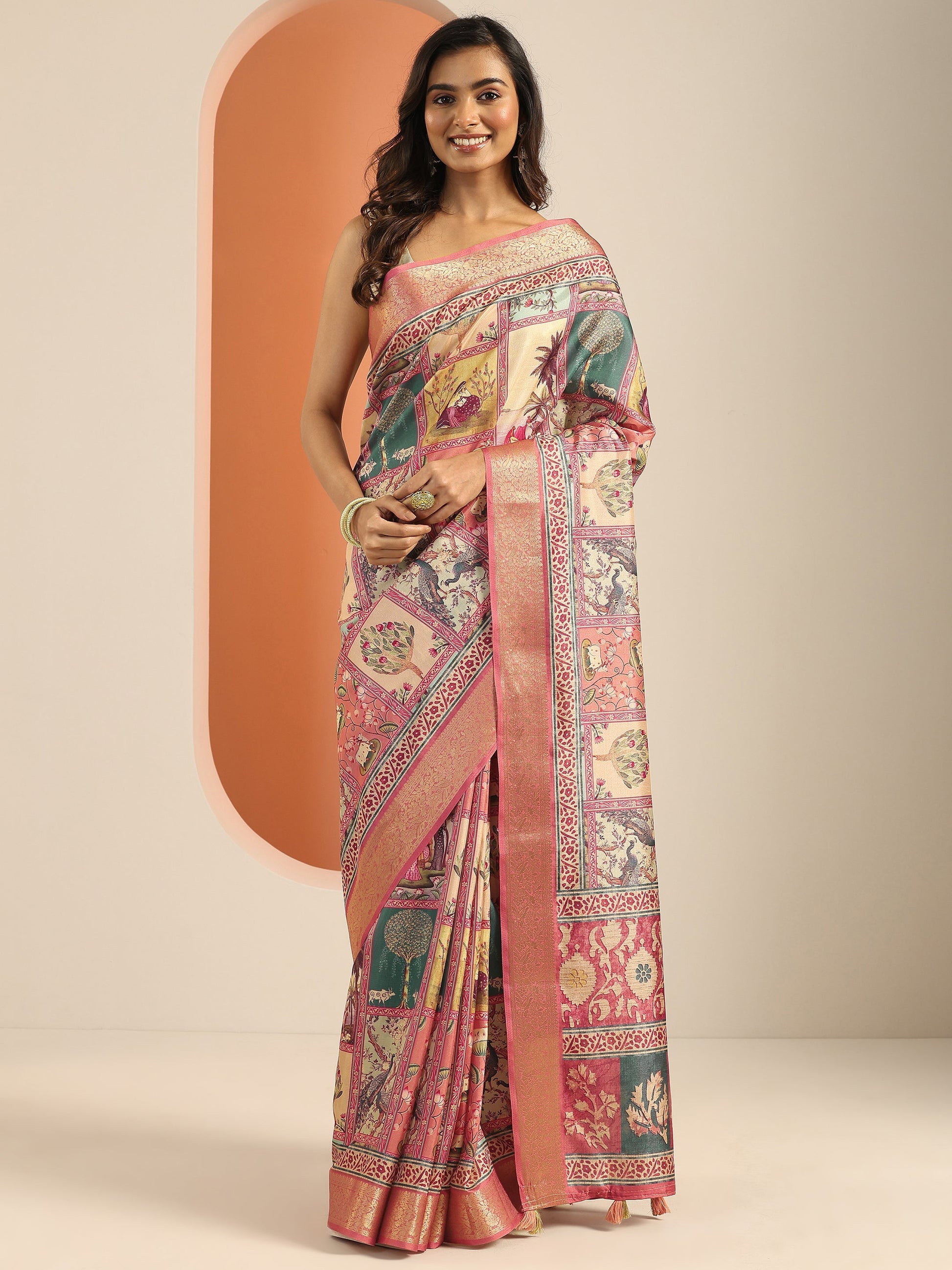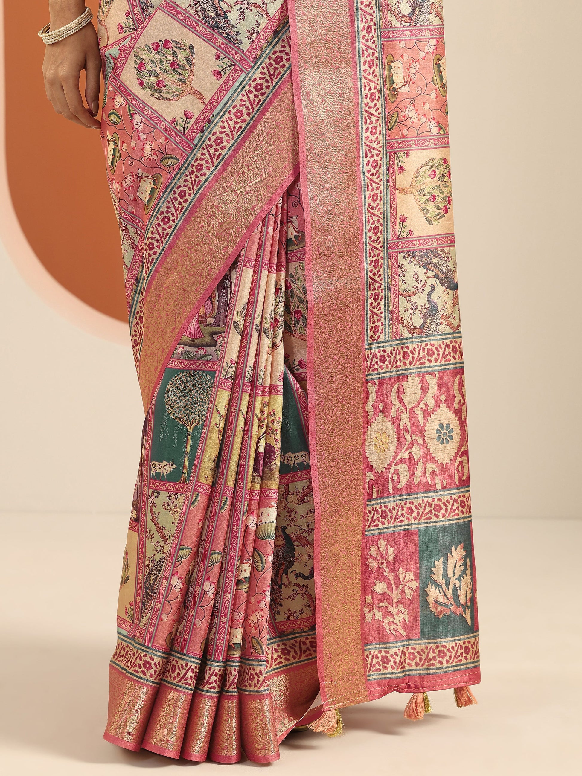 Our Peach Printed Silk Blend Saree Features Captivating Tribal Printed Design. Complemented With A Unstitched Blouse Piece. This Charming Saree Is Perfect For Festive Wear.