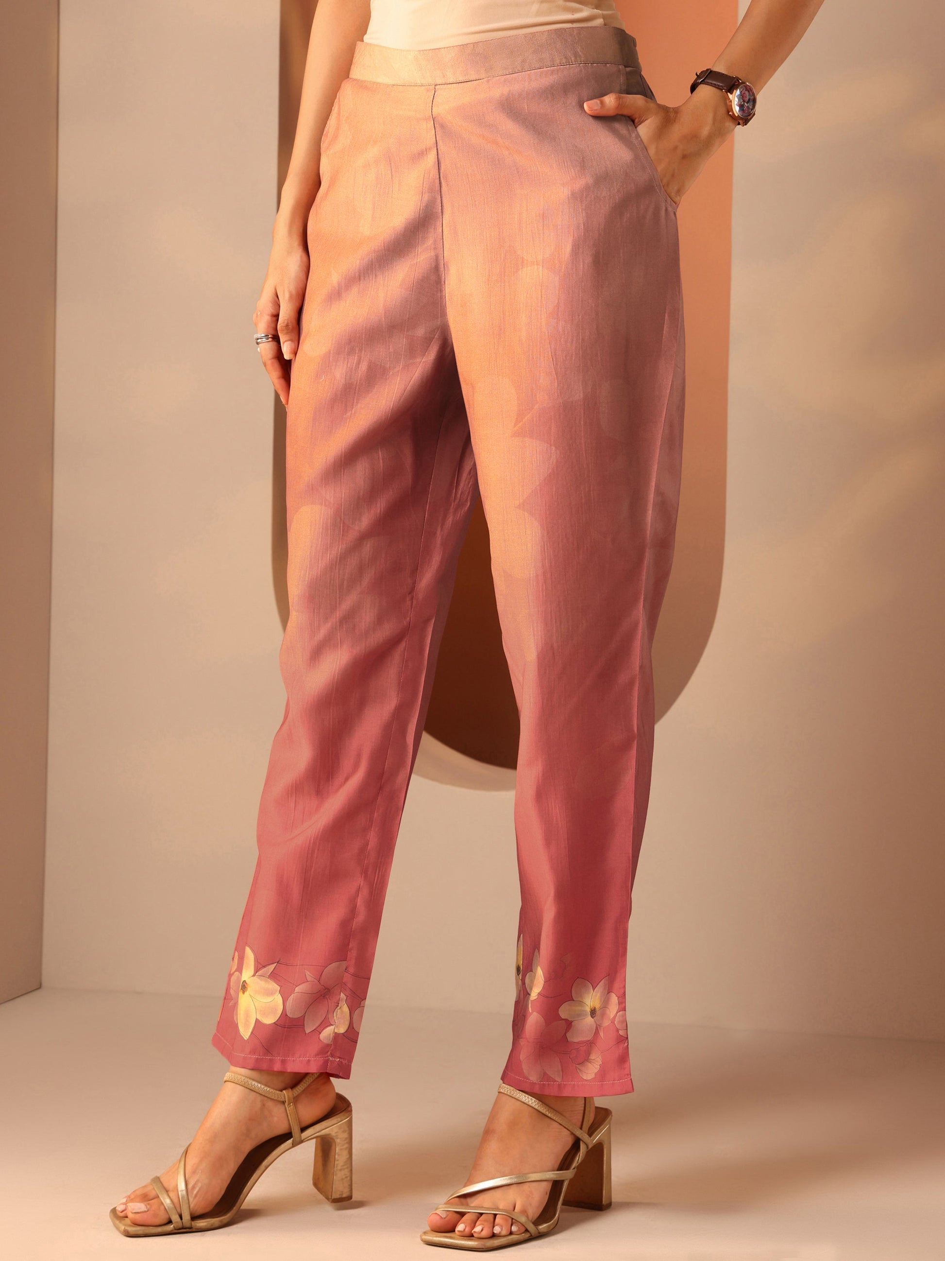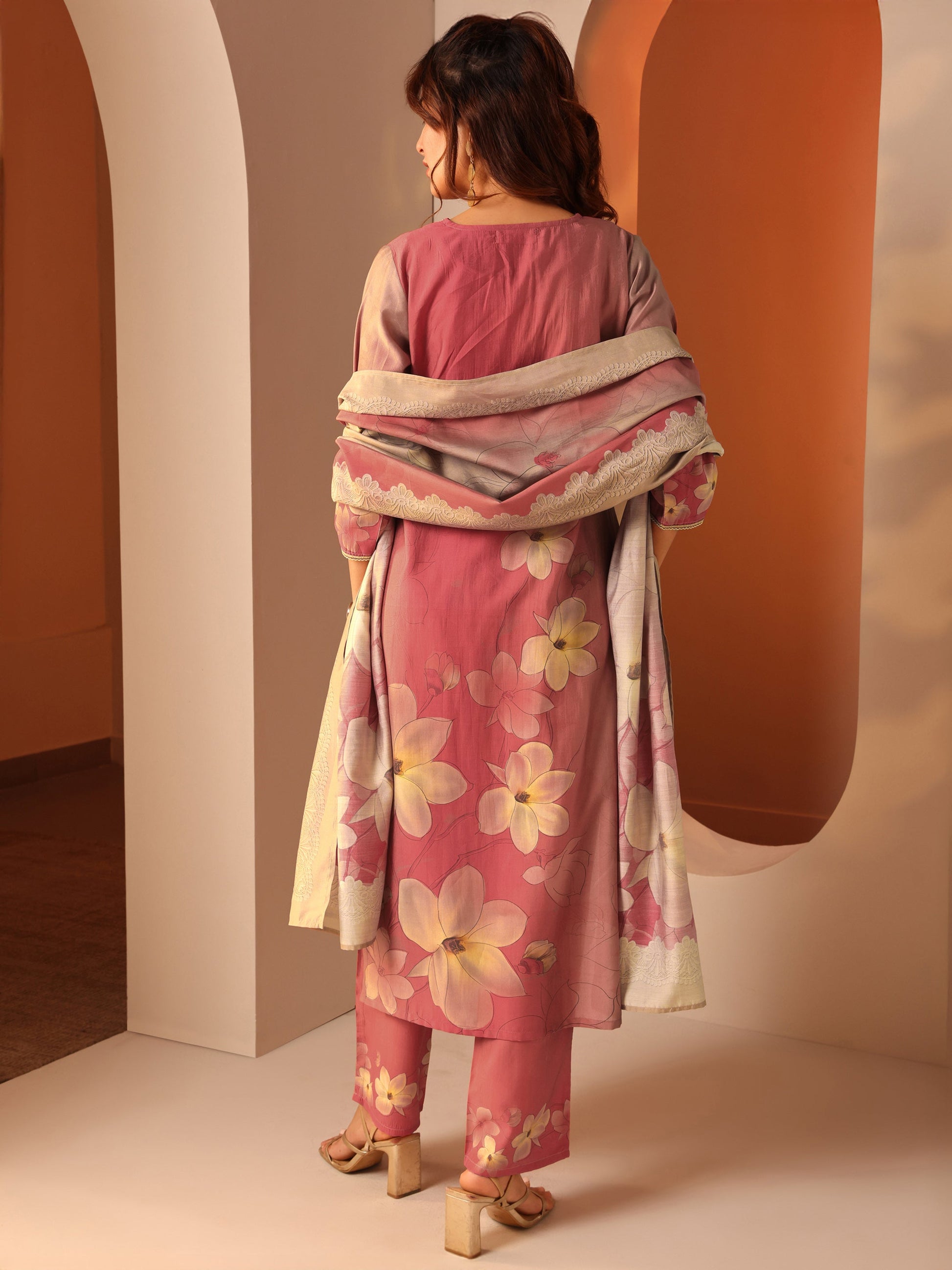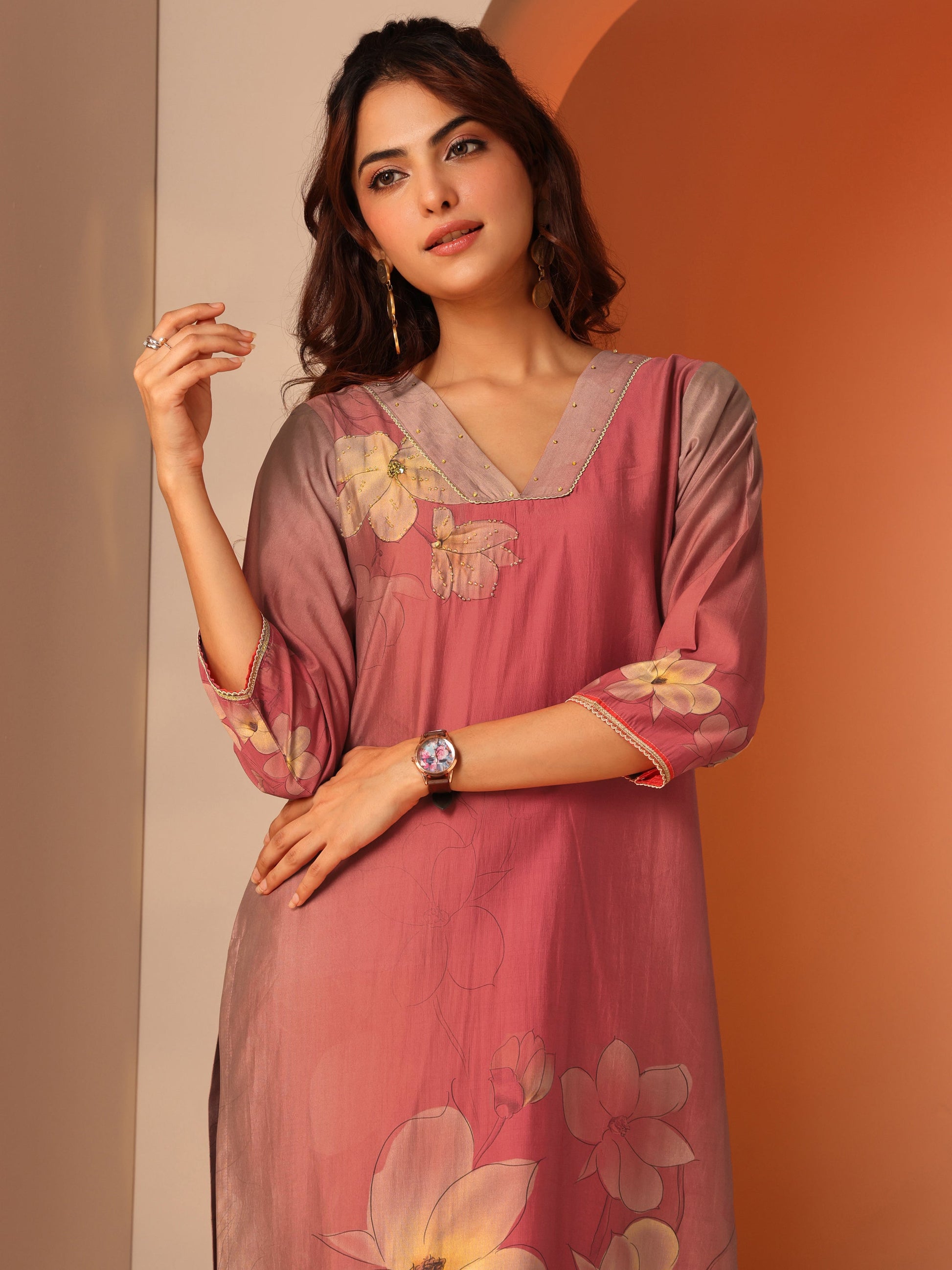 Our 3-piece pink and beige silk blend kurta set features a straight-fit silhouette with a V-neckline, regular sleeves, and a statement yoke. Complemented with straight pants with a partially elasticated waistband and 2 pockets, and a printed dupatta. Adorned with floral printed accents, this style is perfect for casual wear.