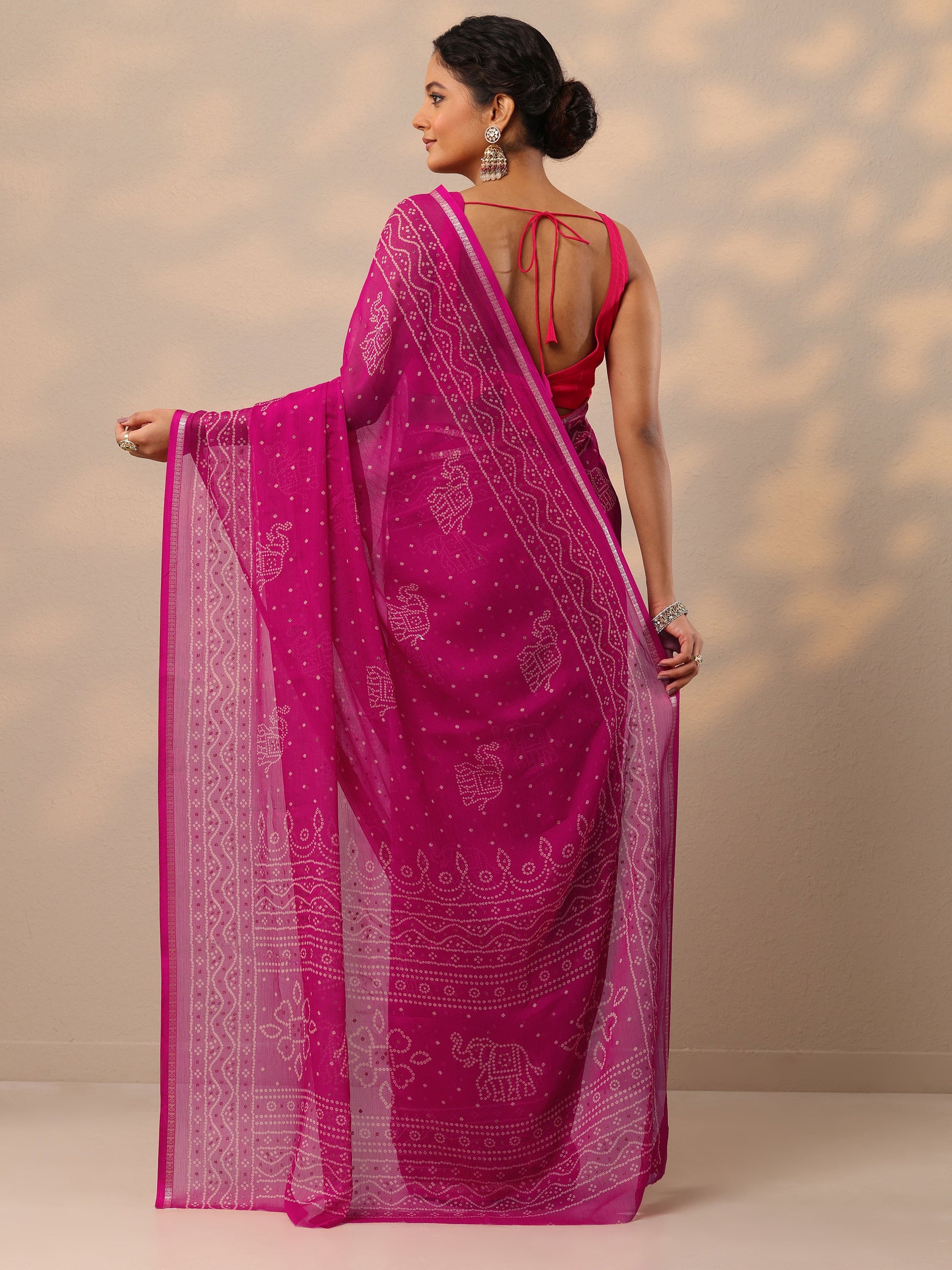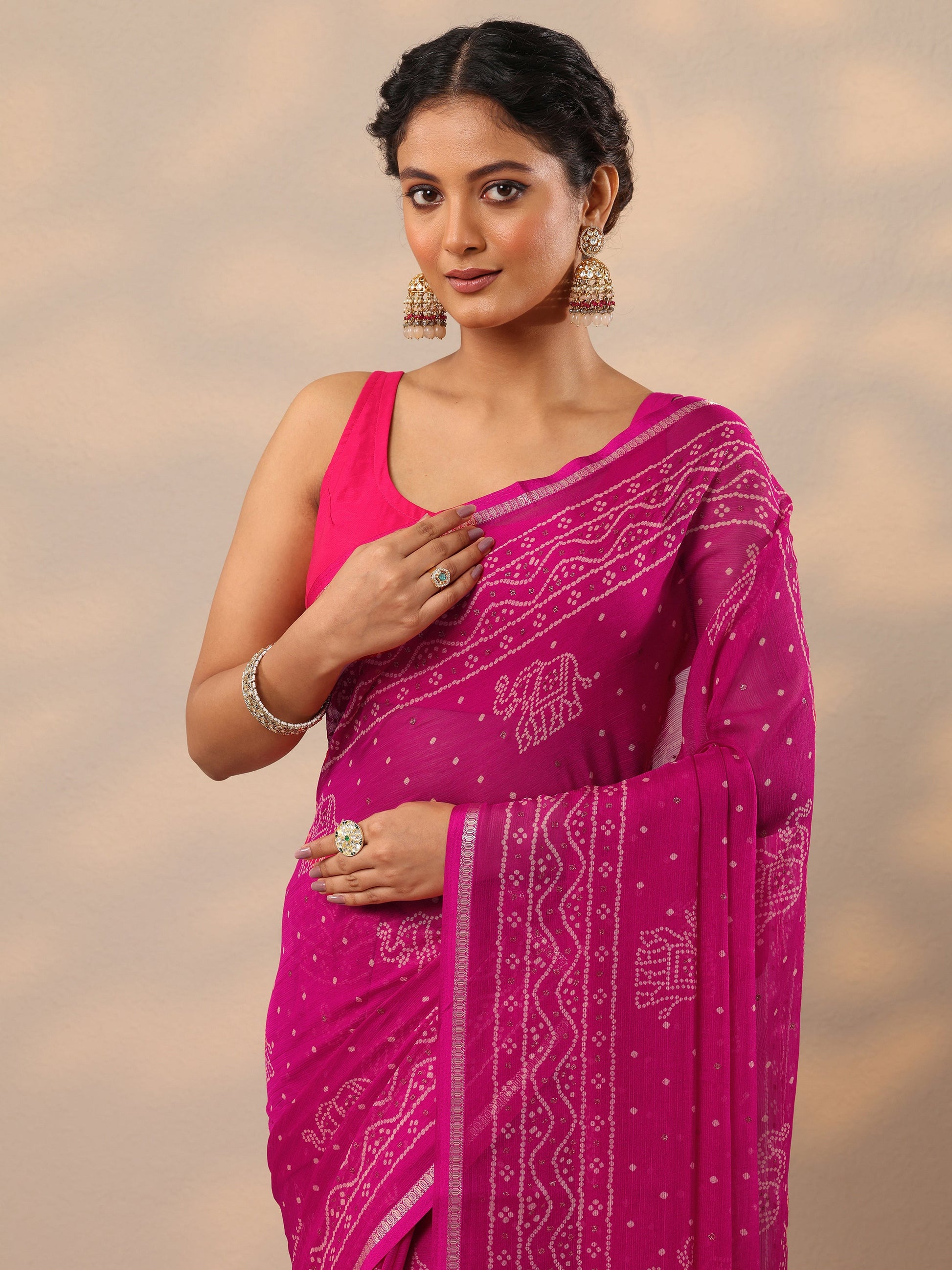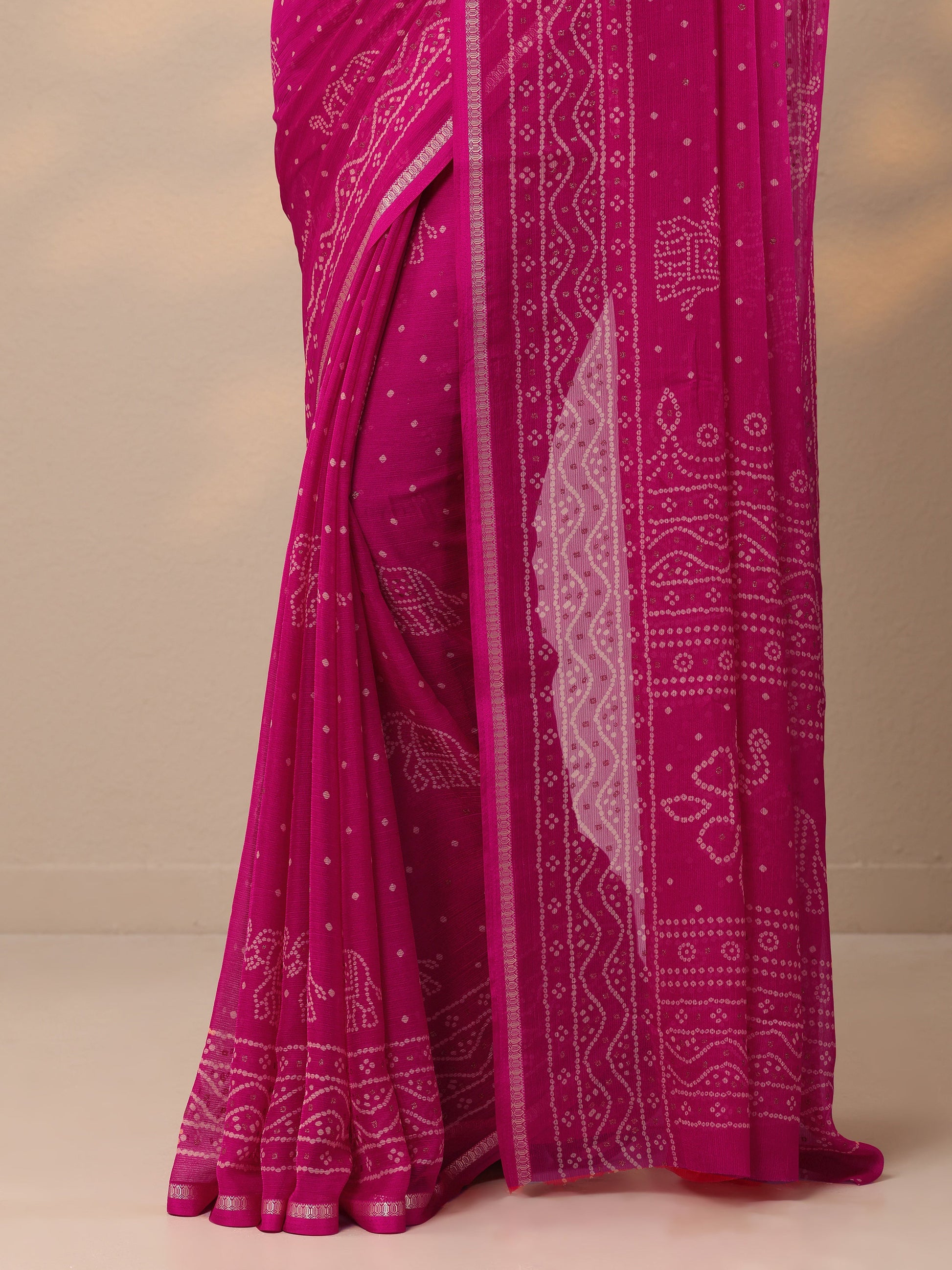Pink Bandhani Printed Chiffon Saree With Unstitched Blouse Piece