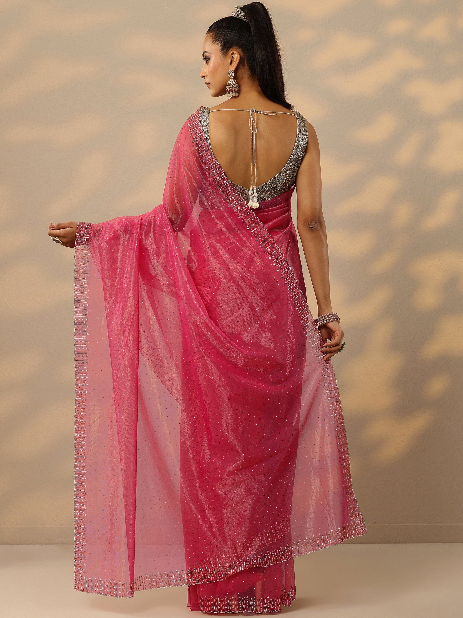 Pink Embellished Nylon Saree With Unstitched Blouse Piece