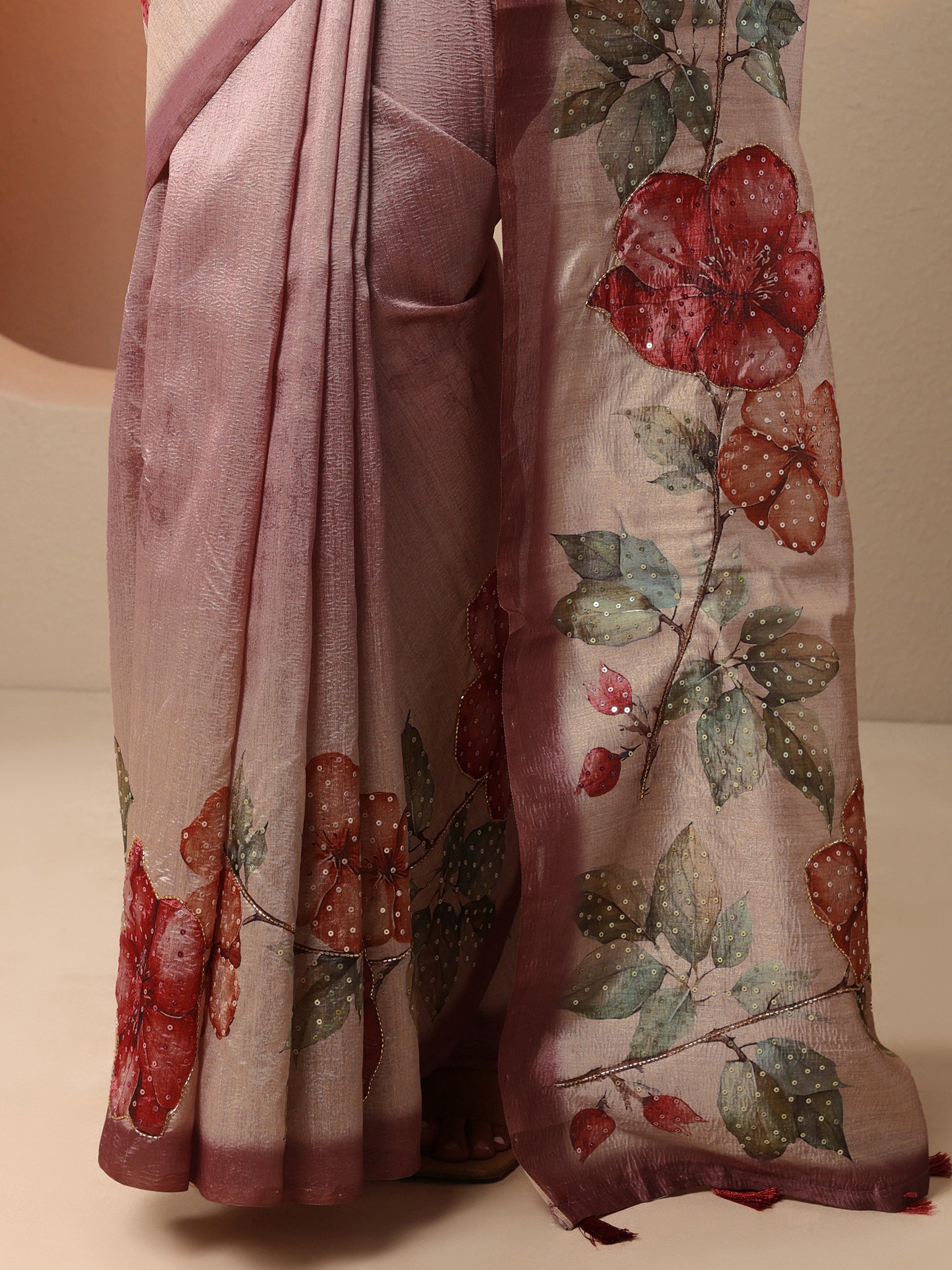 Our Mauve Printed Silk Blend Saree Features Captivating Top Print. Complemented With An Unstitched Blouse Piece. This Charming Saree Is Perfect For Semi Festive Wear