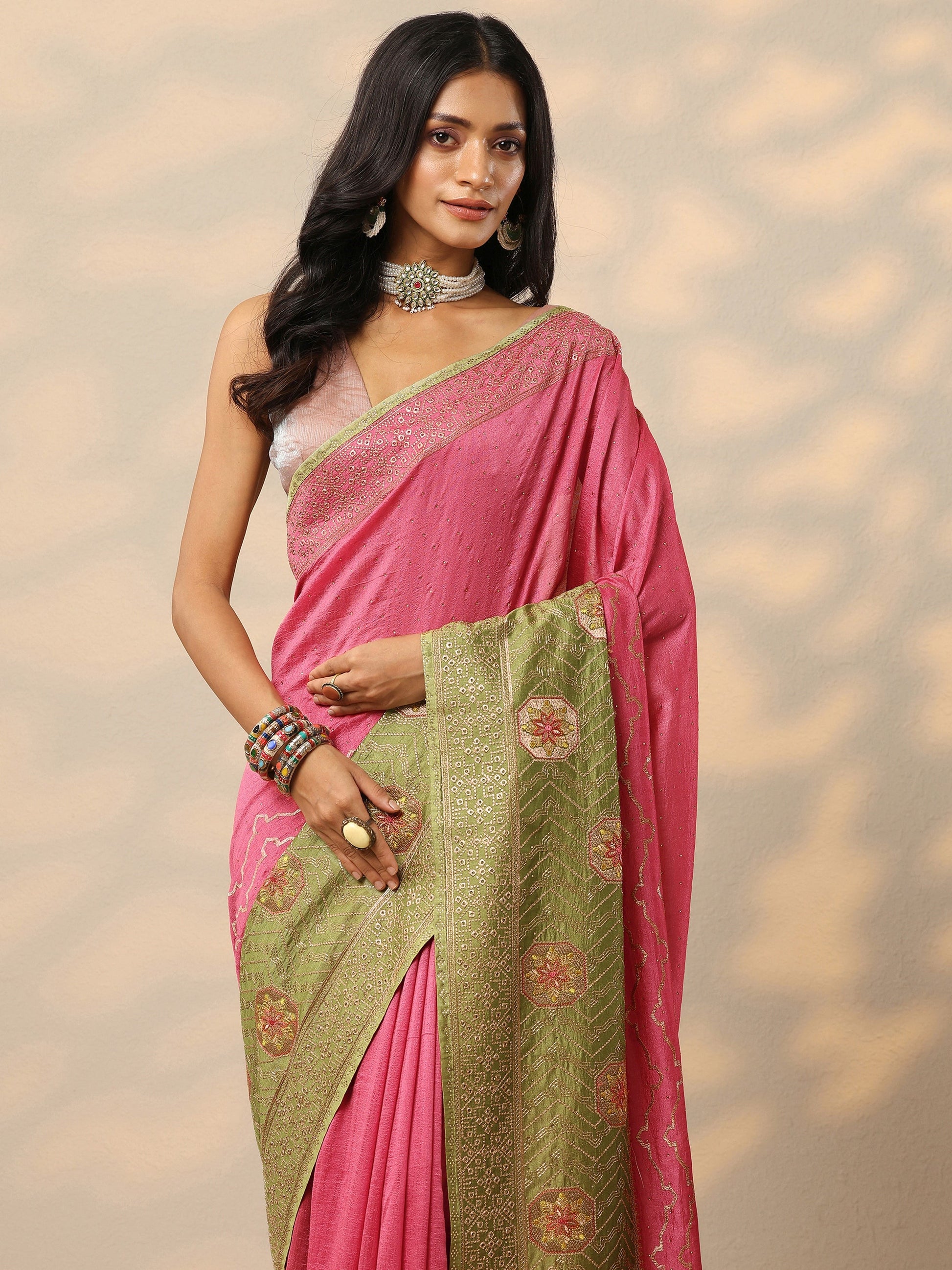 Pink Embellished Silk Blend Saree With Unstitched Blouse Piece