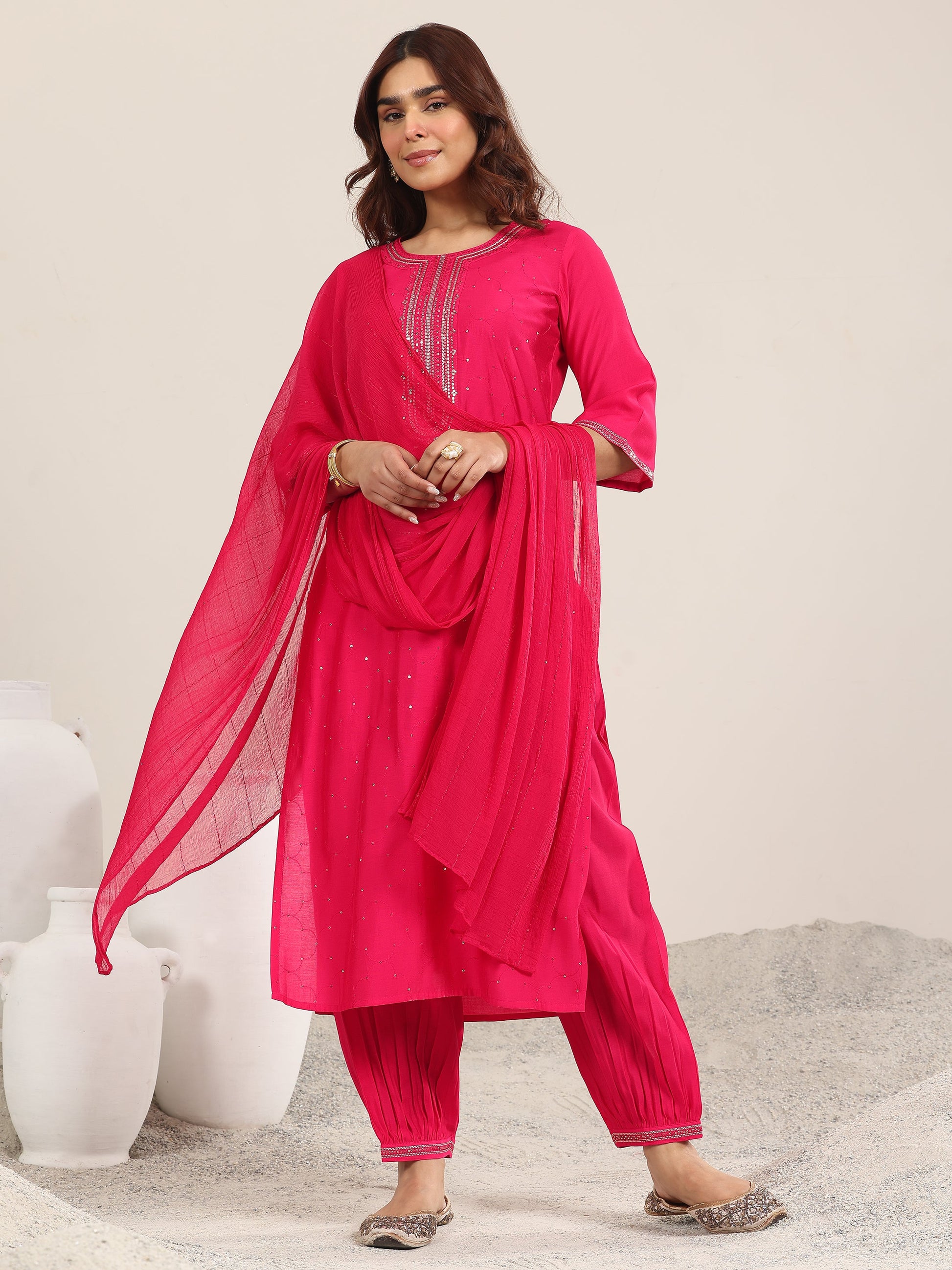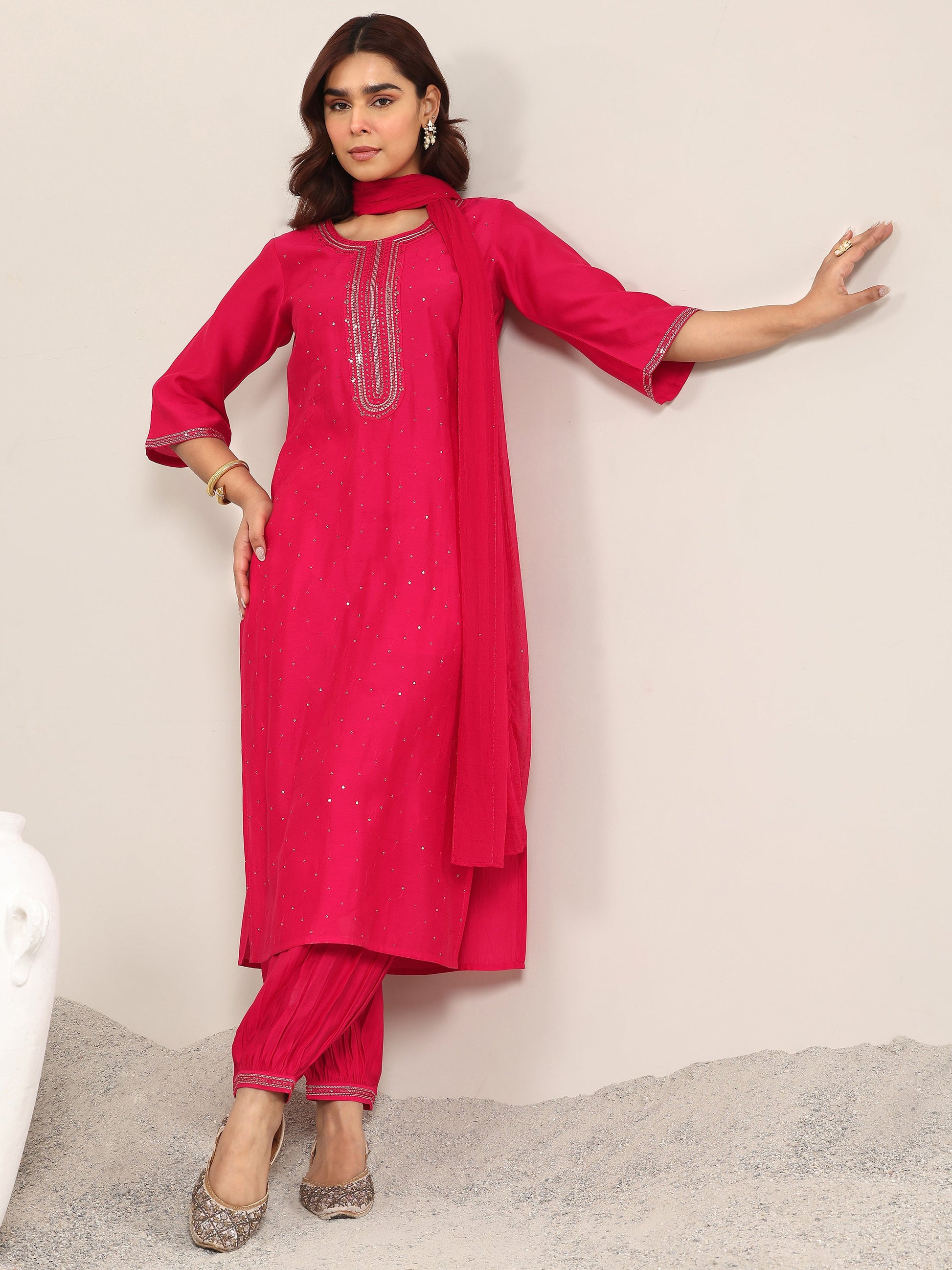 Pink Embellished Silk Blend Straight Suit With Dupatta