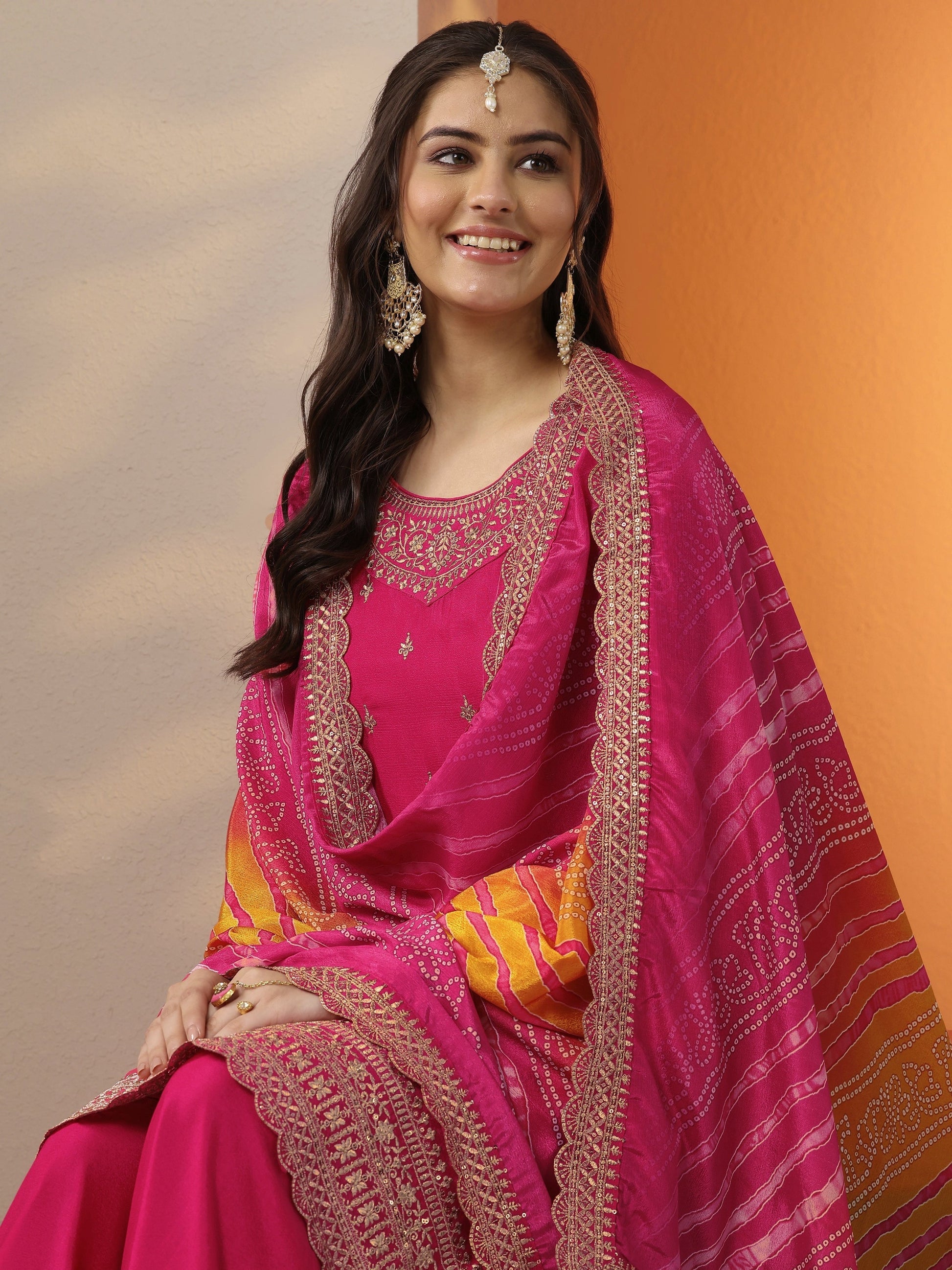 Our 3-piece Pink Silk blend Straight-fit Kurta Set features a Round Neckline, Regular Sleeves, and statement yoke. Complemented with Palazzo Pants with a Partially Elasticated waistband, and a Printed dupatta. Adorned with Embroidered accents, this style is perfect for Festive occasions.