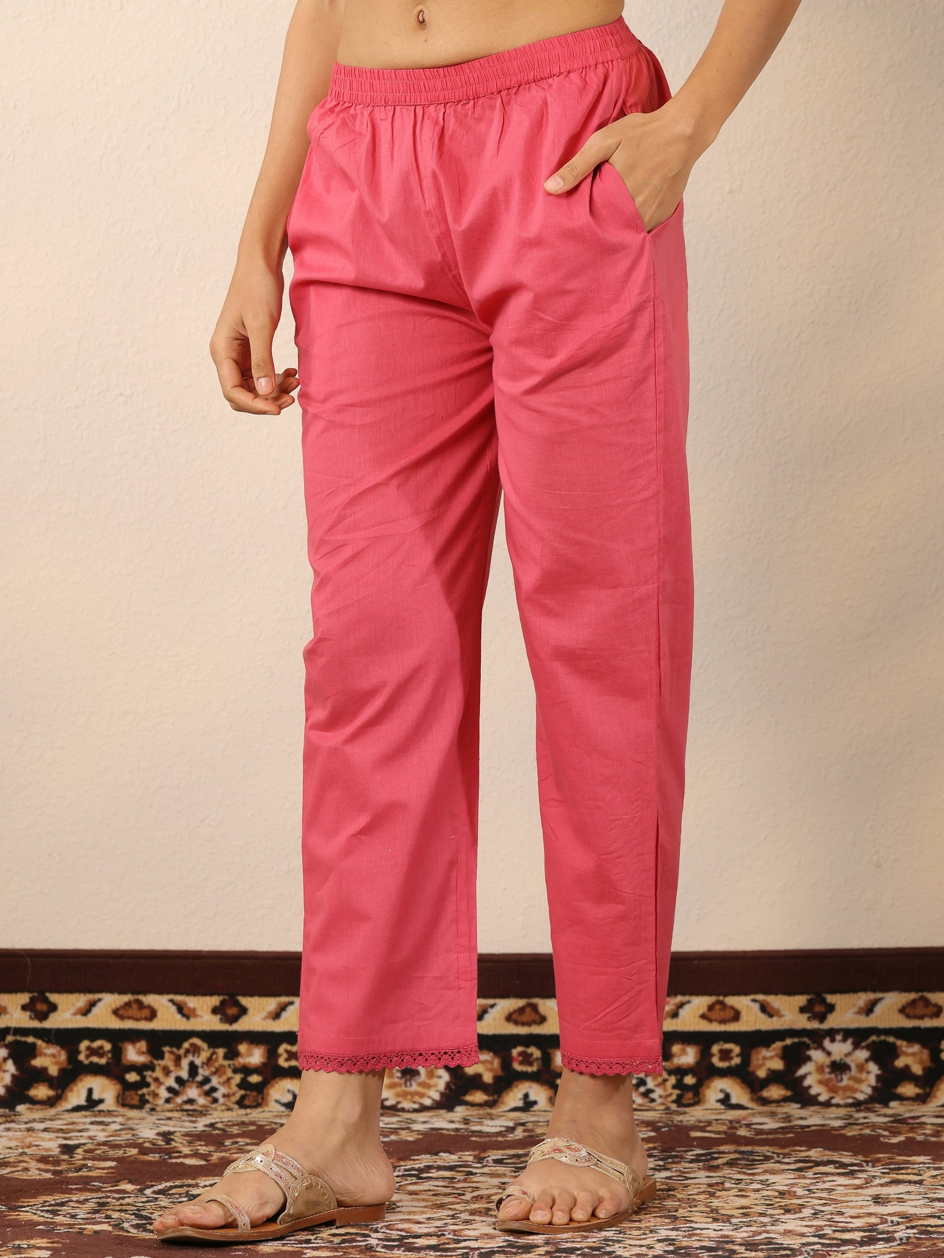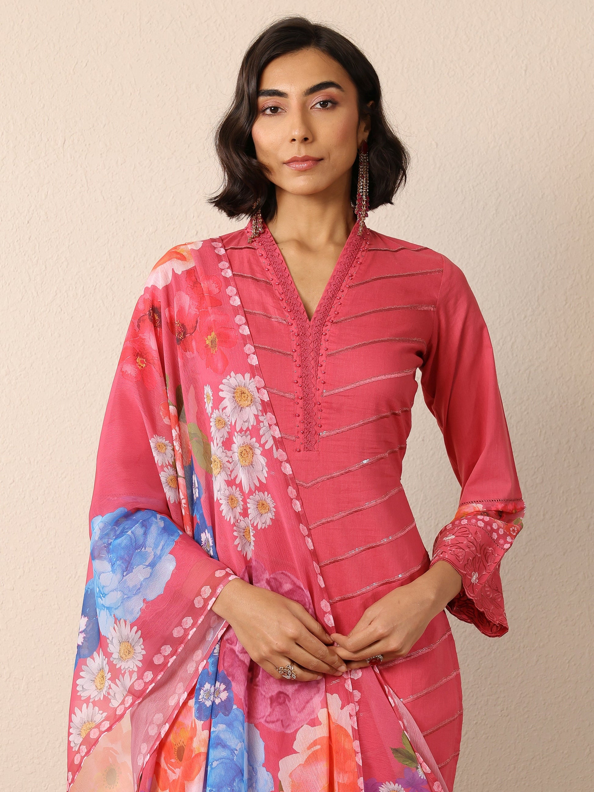 Our 3-piece Pink Cotton Straight-Fit Kurta Set features a V-Neckline, Regular Sleeves, and statement yoke. Complemented with Straight Pants with a Partially Elasticated waistband and 2 pockets, and a Printed dupatta. Adorned with Chevron Embroidered, this style is perfect for Festive occasions.