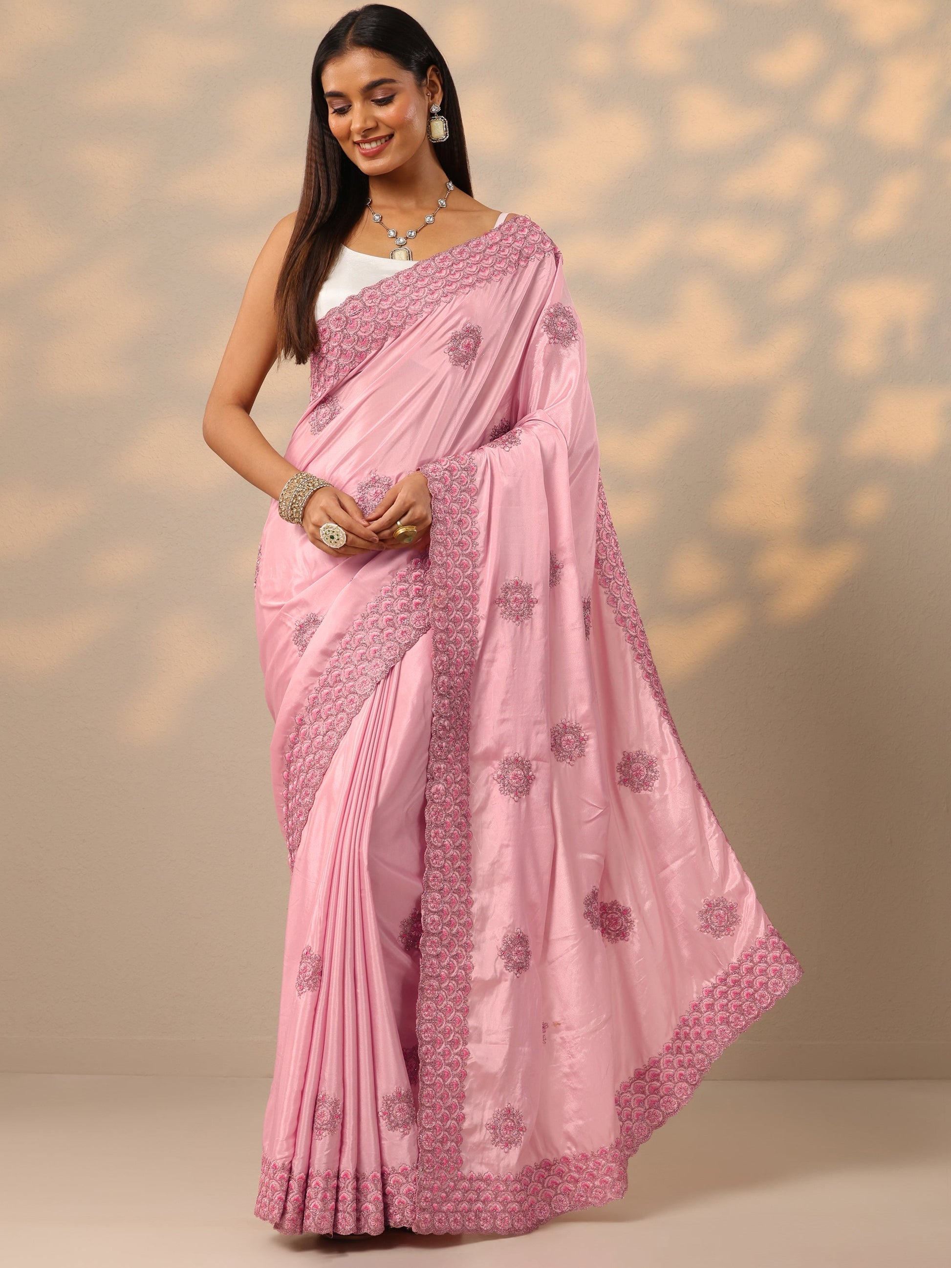 Pink Embroidered Crepe Saree With Unstitched Blouse Piece