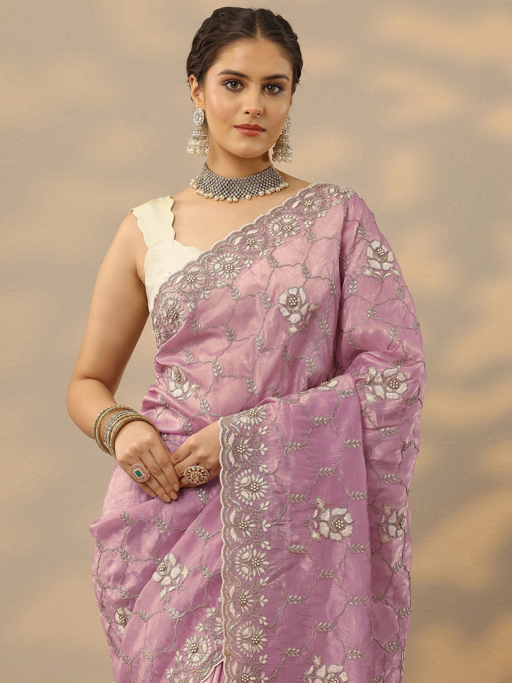 Our Lavender Organza Saree Features Captivating Floral Embroidery. Complemented With An Unstitched Blouse Piece. This Charming Saree Is Perfect For Festive Occasions