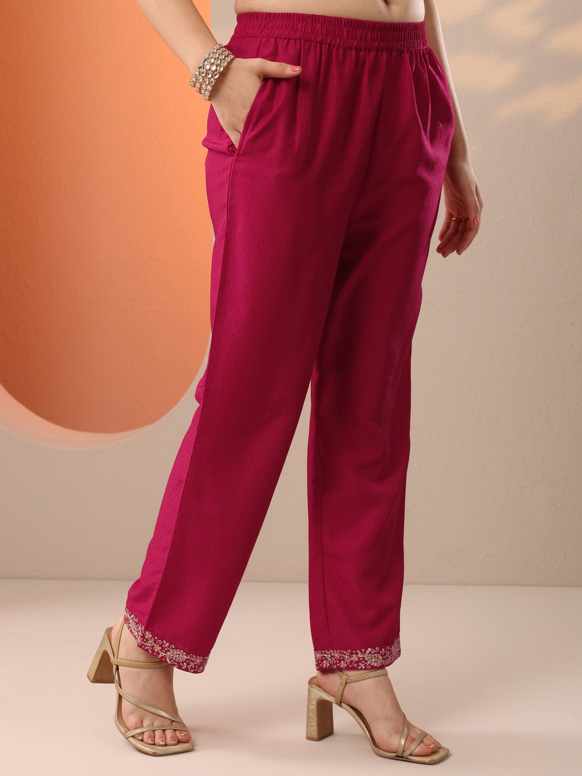 Our 3-piece Red Silk blend Straight-fit Kurta Set features a Round Neckline, Regular Sleeves, and statement yoke. Complemented with Straight Pants with a Partially Elasticated waistband and 2 pockets, and a Solid dupatta. Adorned with Embroidered accents, this style is perfect for Festive occasions.