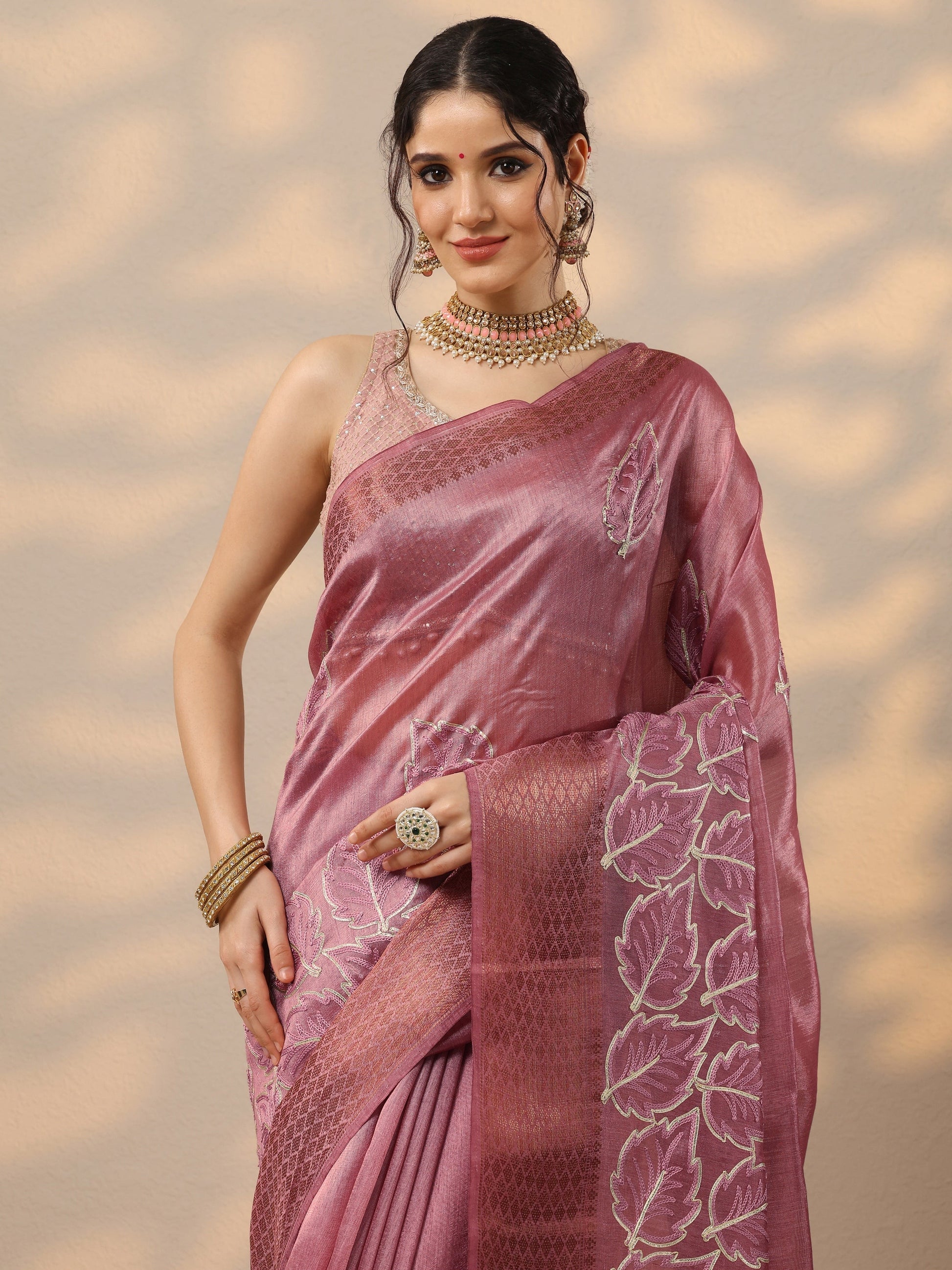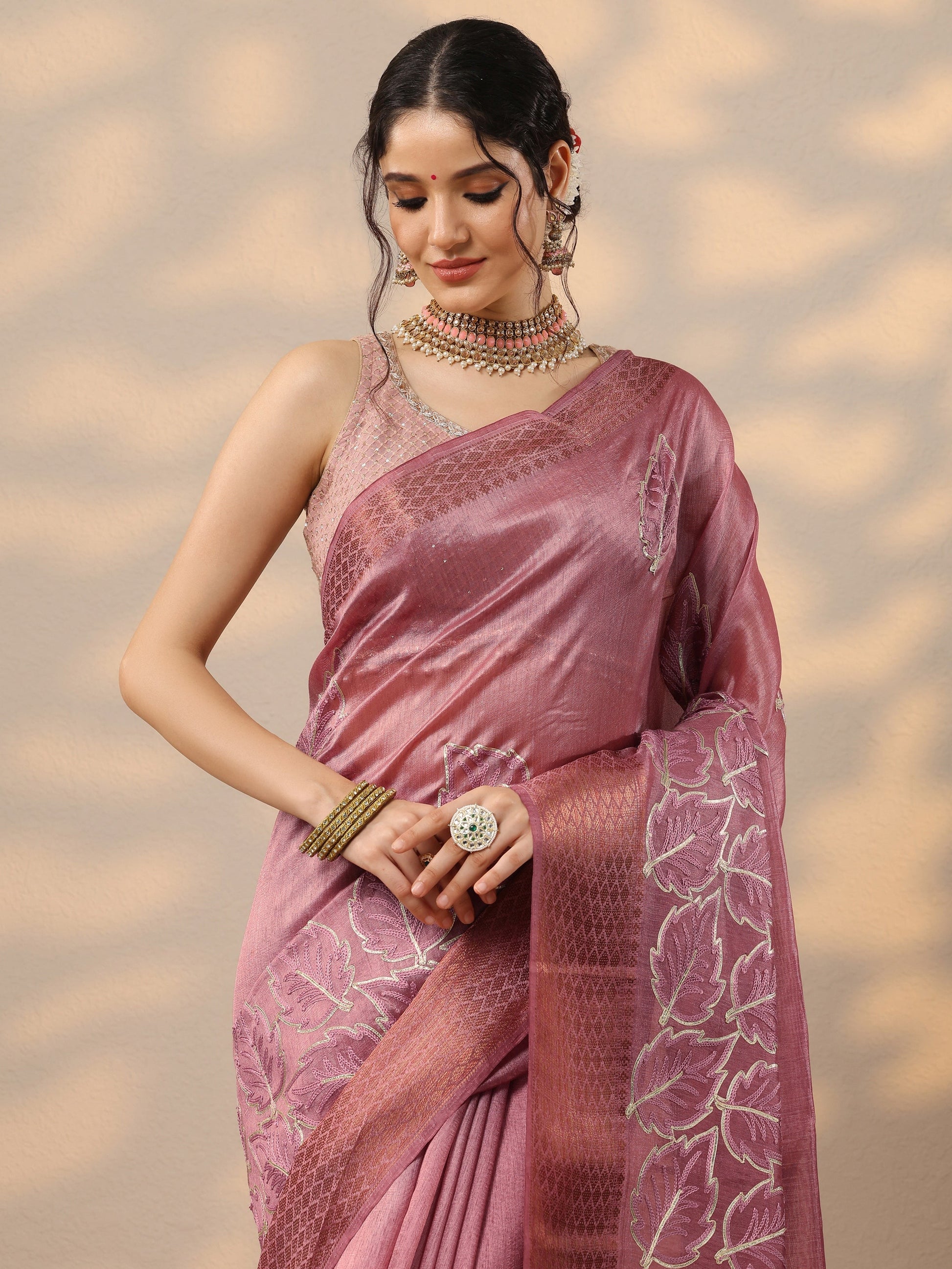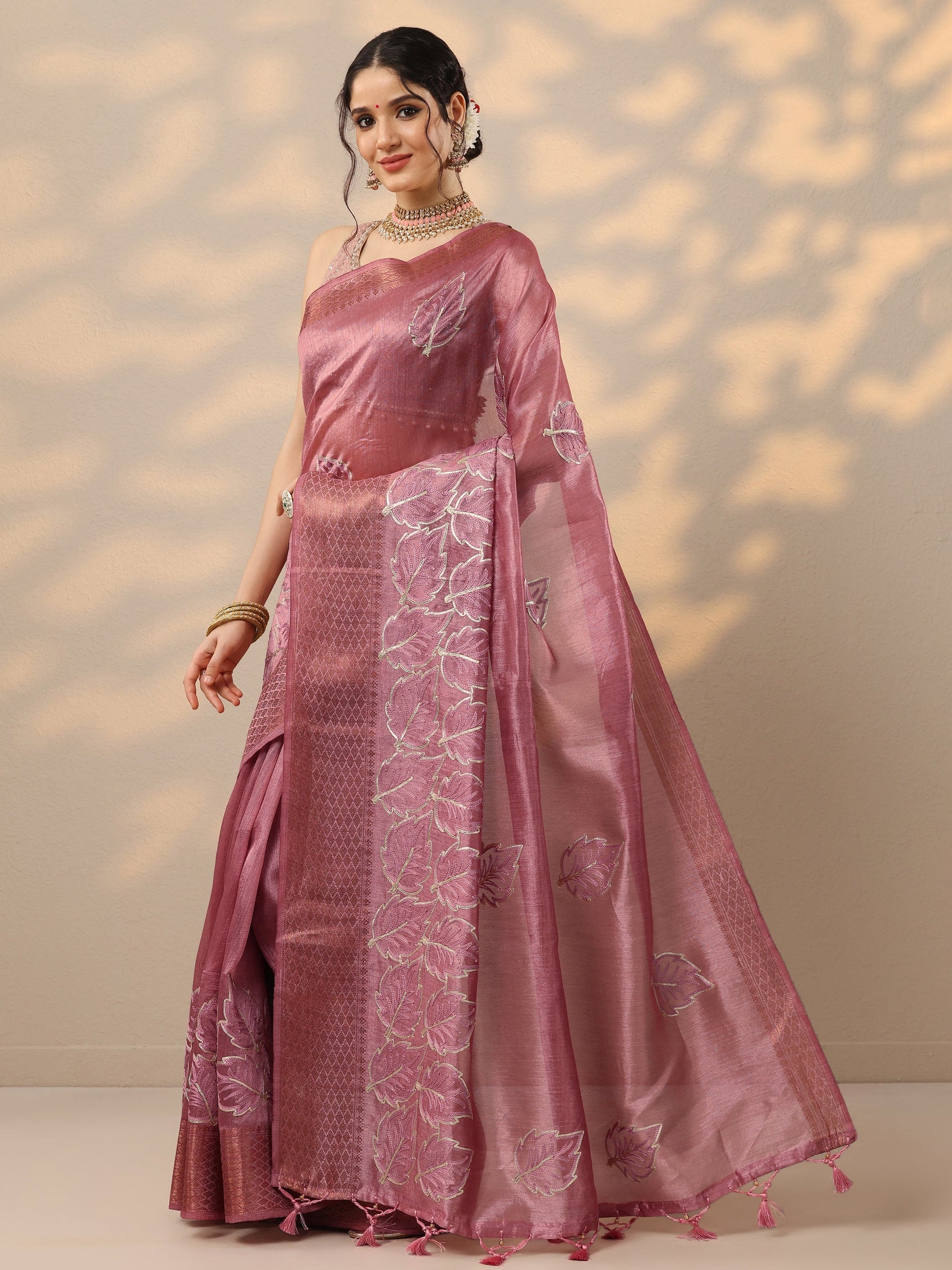 Pink Embroidered Silk Blend Saree With Unstitched Blouse Piece