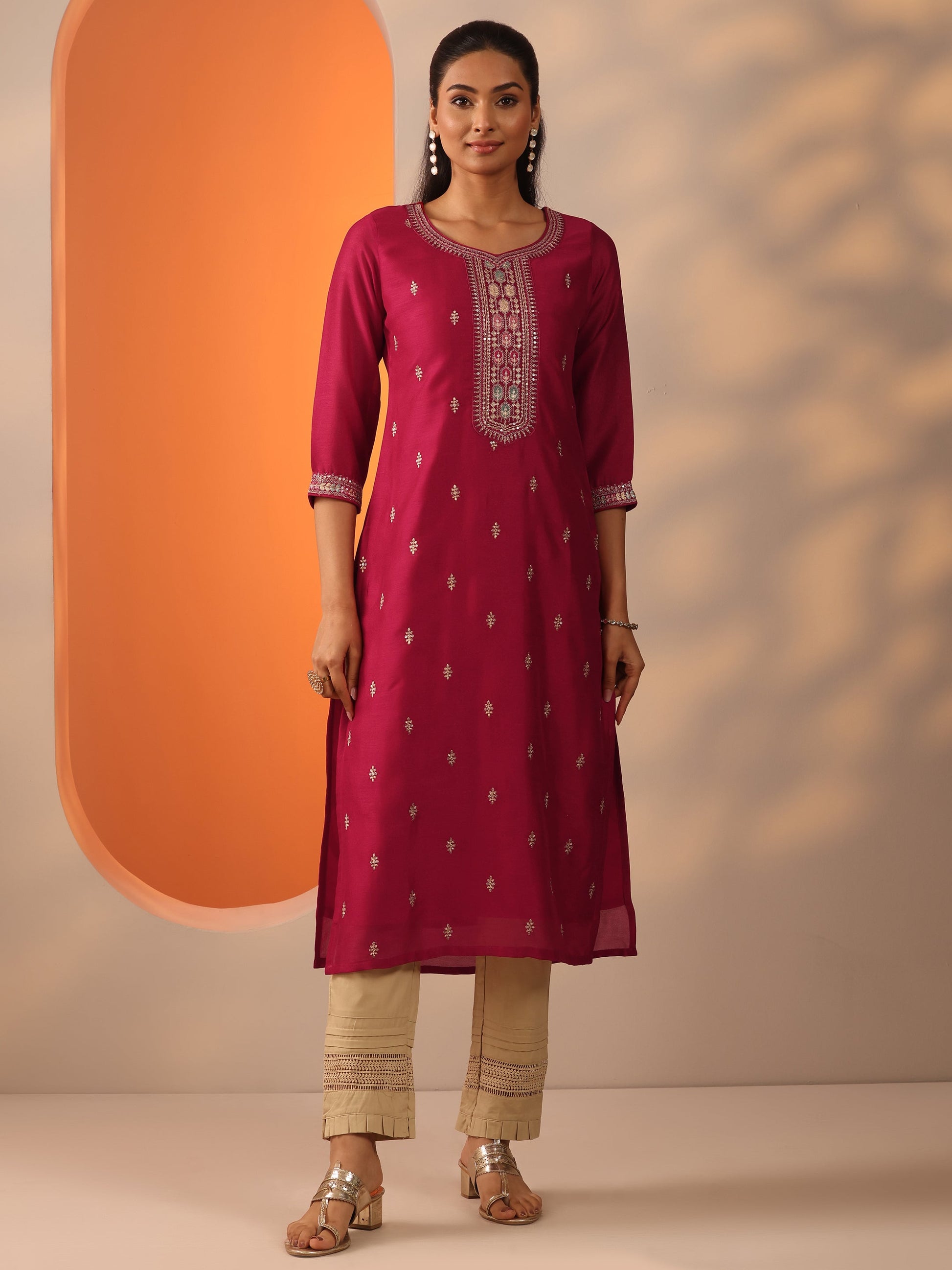 Our 1-piece Red Silk blend straight-fit kurta features a round neckline, regular sleeves, and statement Yoke. Complemented with lining. Adorned with ethnic motif embroidered, this style is perfect for festive wear.