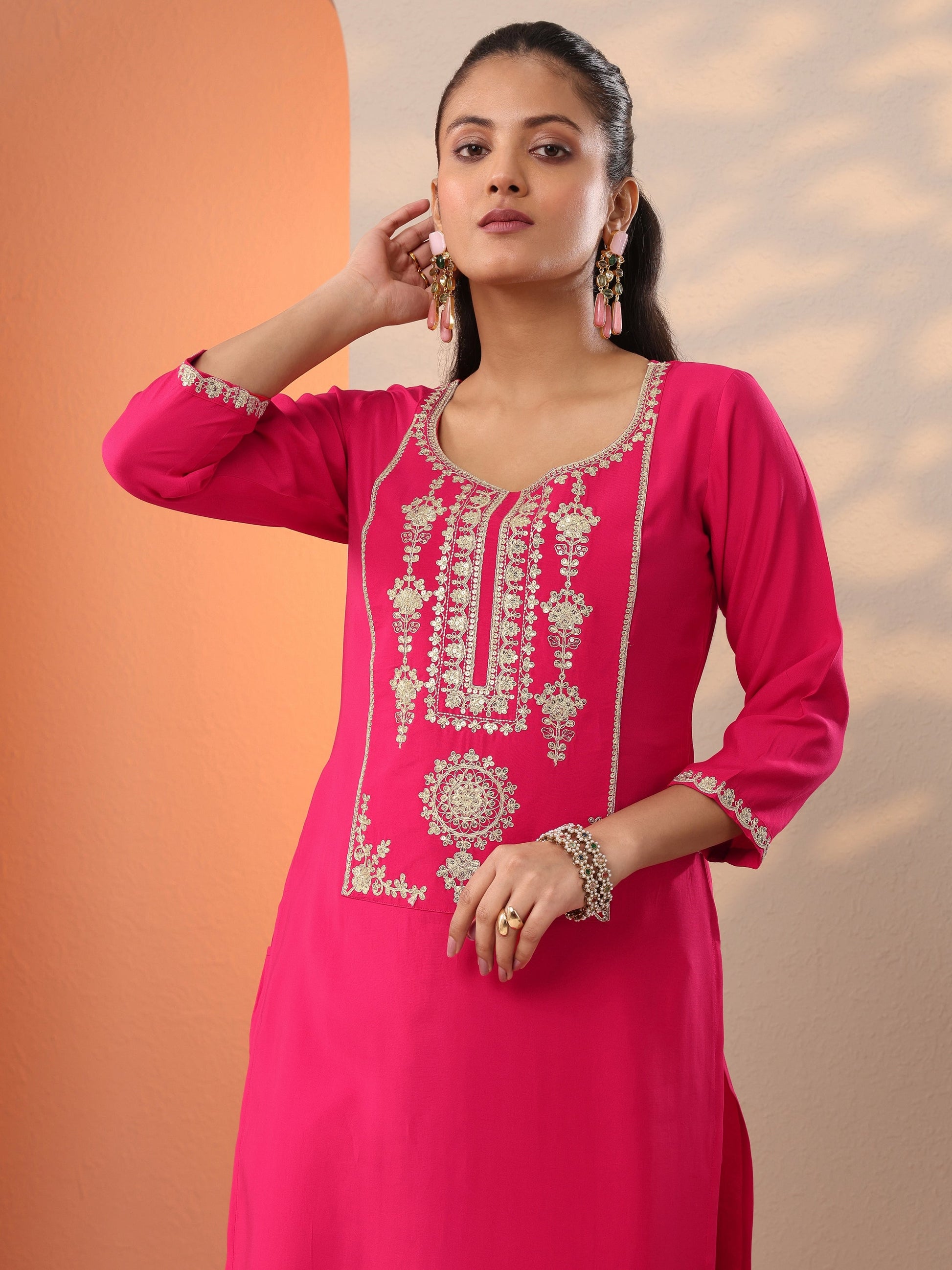 Pink Embroidered Silk Blend Straight Suit Set With Dupatta