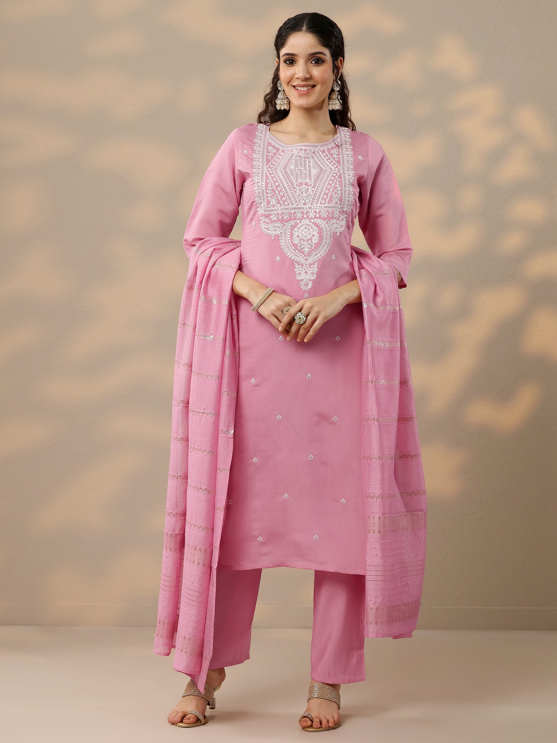 Pink Embroidered Silk Blend Straight Suit Set With Dupatta