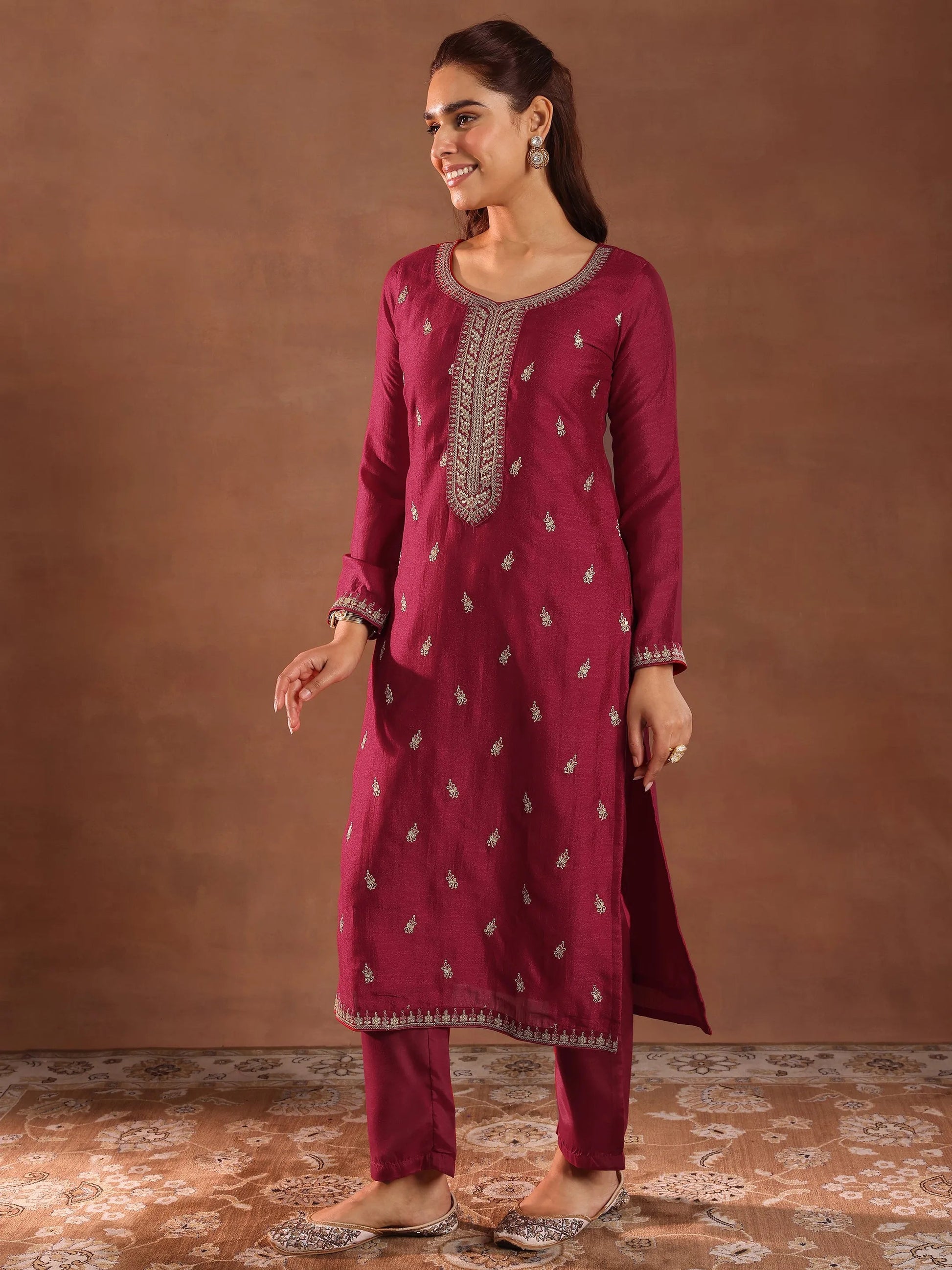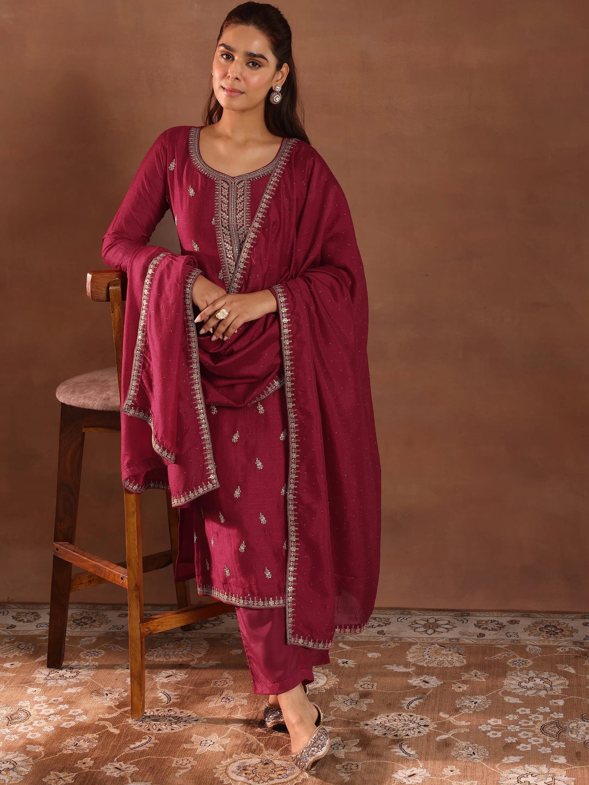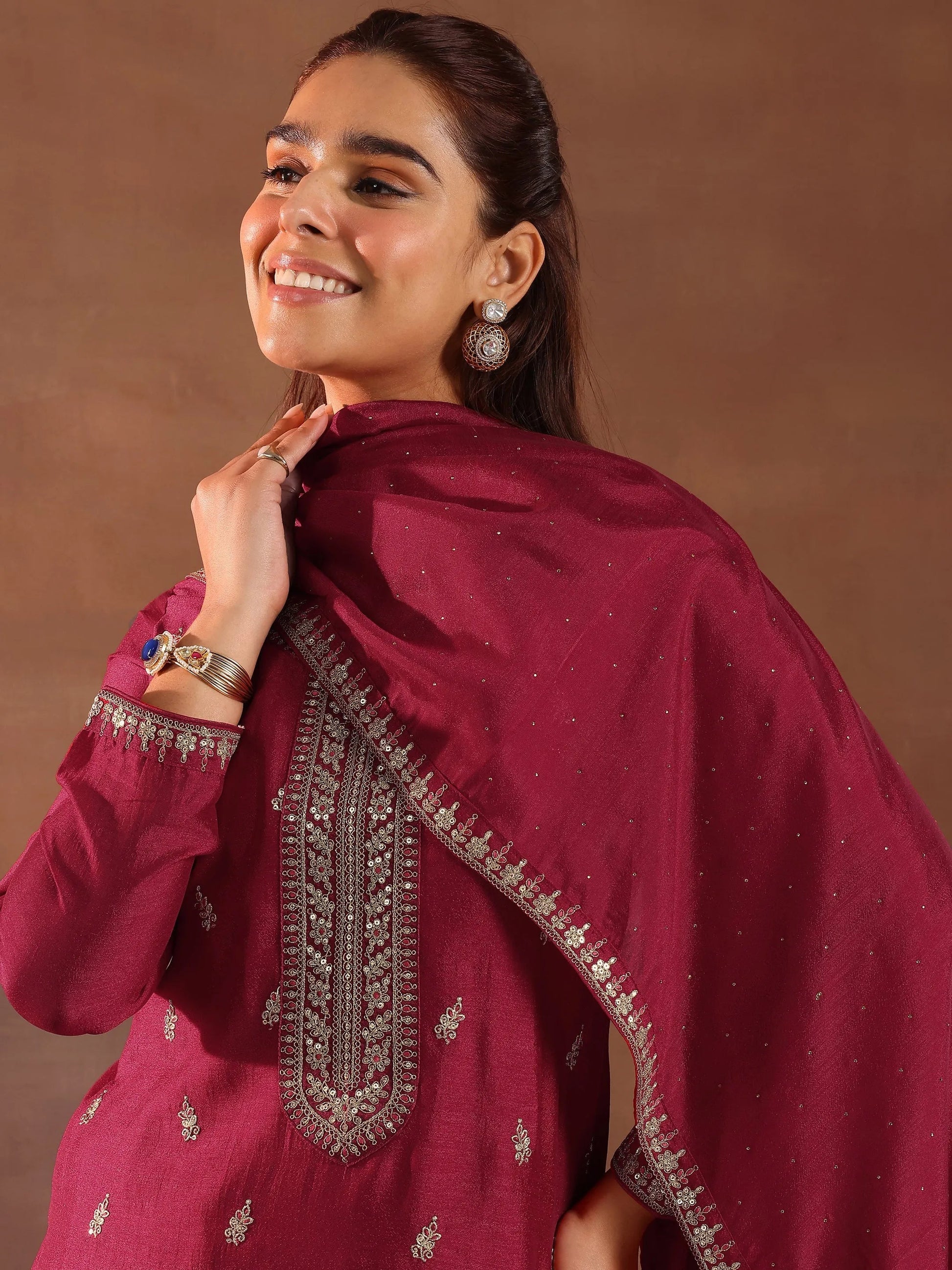 Pink Embroidered Silk Blend Straight Suit With Dupatta