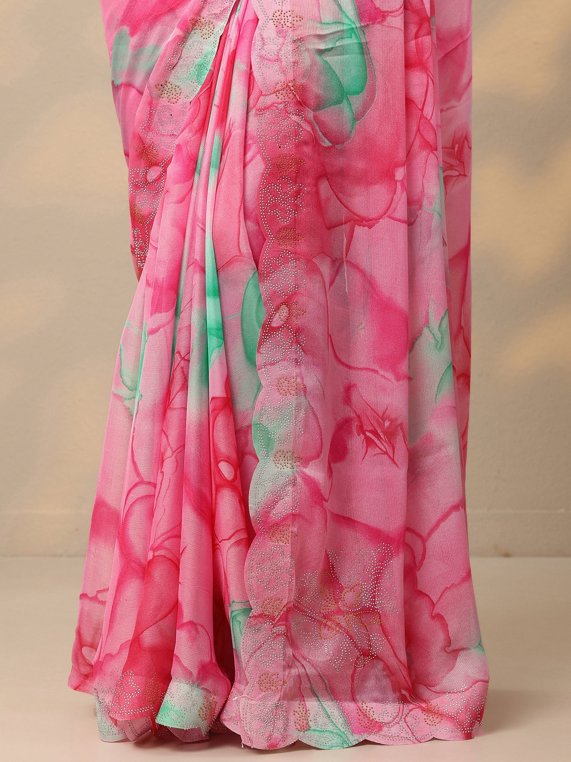 Pink Printed Chinon Saree With Unstitched Blouse Piece