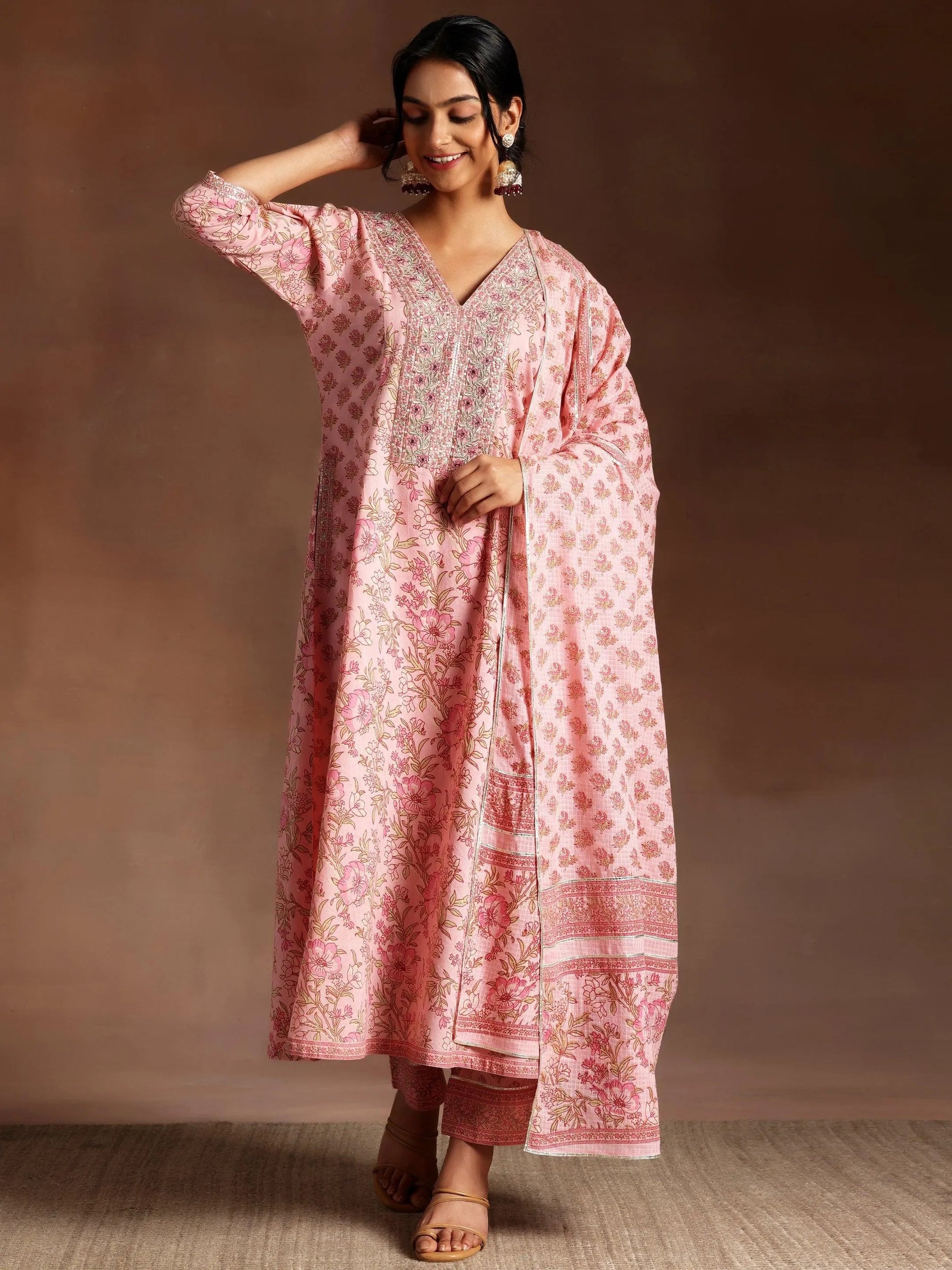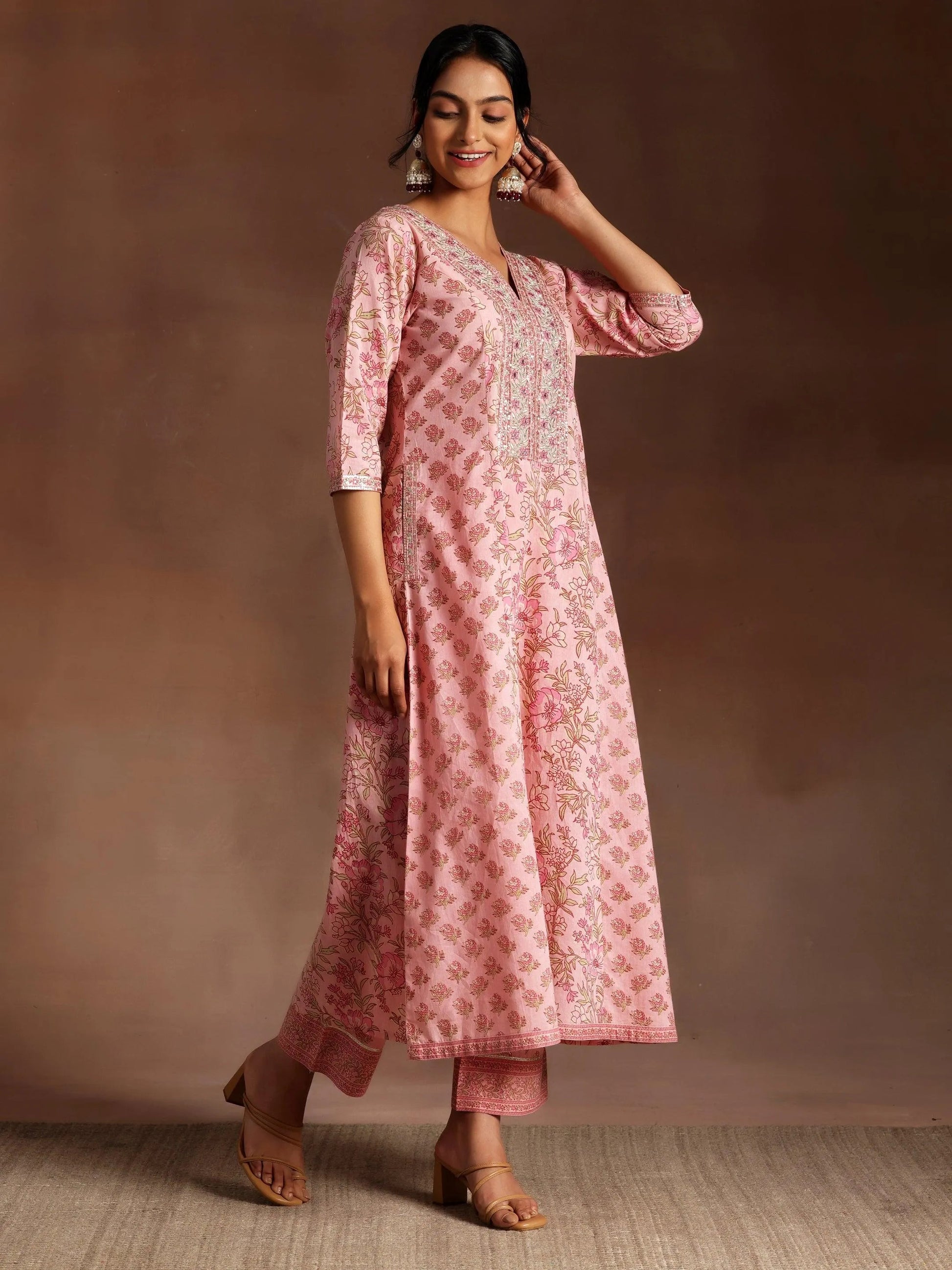 Mariyam Pink Printed Cotton A-Line Kurta With Palazzos & Dupatta