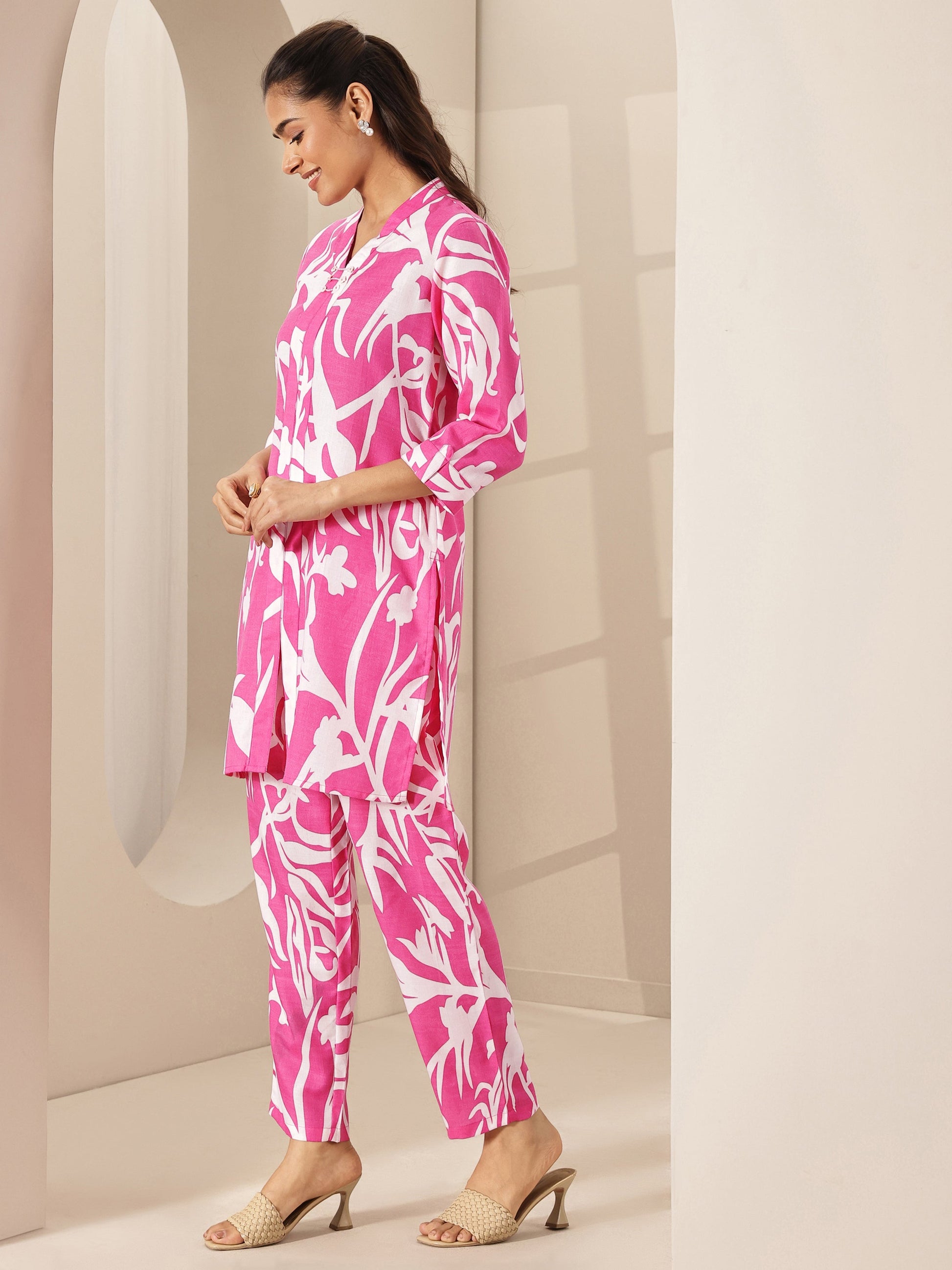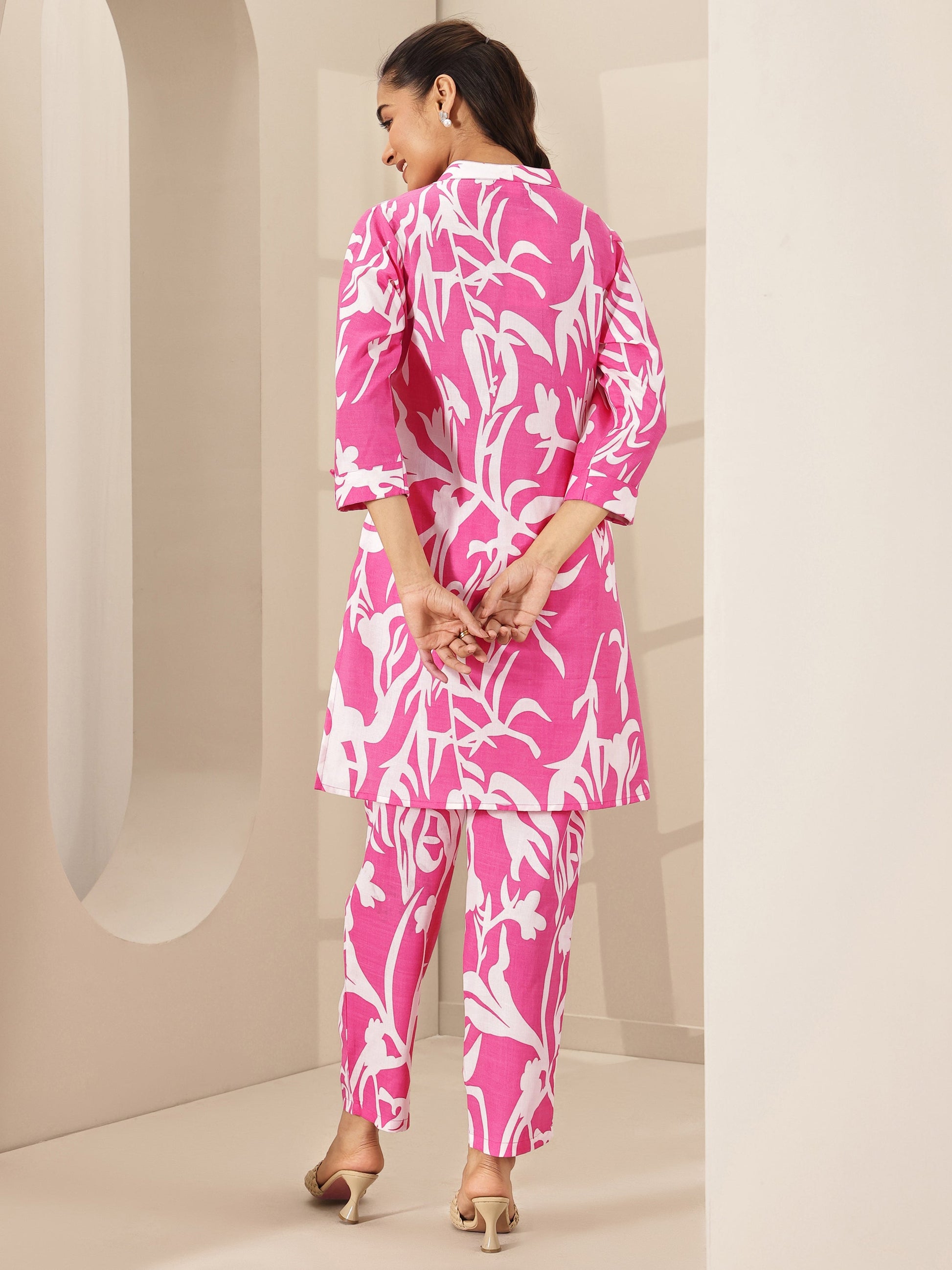 Our 2-piece Pink printed Cotton Blend co-ord set features a Straight-fit Tunic with a Shirt Collar neckline and Three-quarter sleeves. Complemented with matching Palazzos, Trousers with Elasticated waistband. Highlighted with Printed, this style is perfect for Casual.