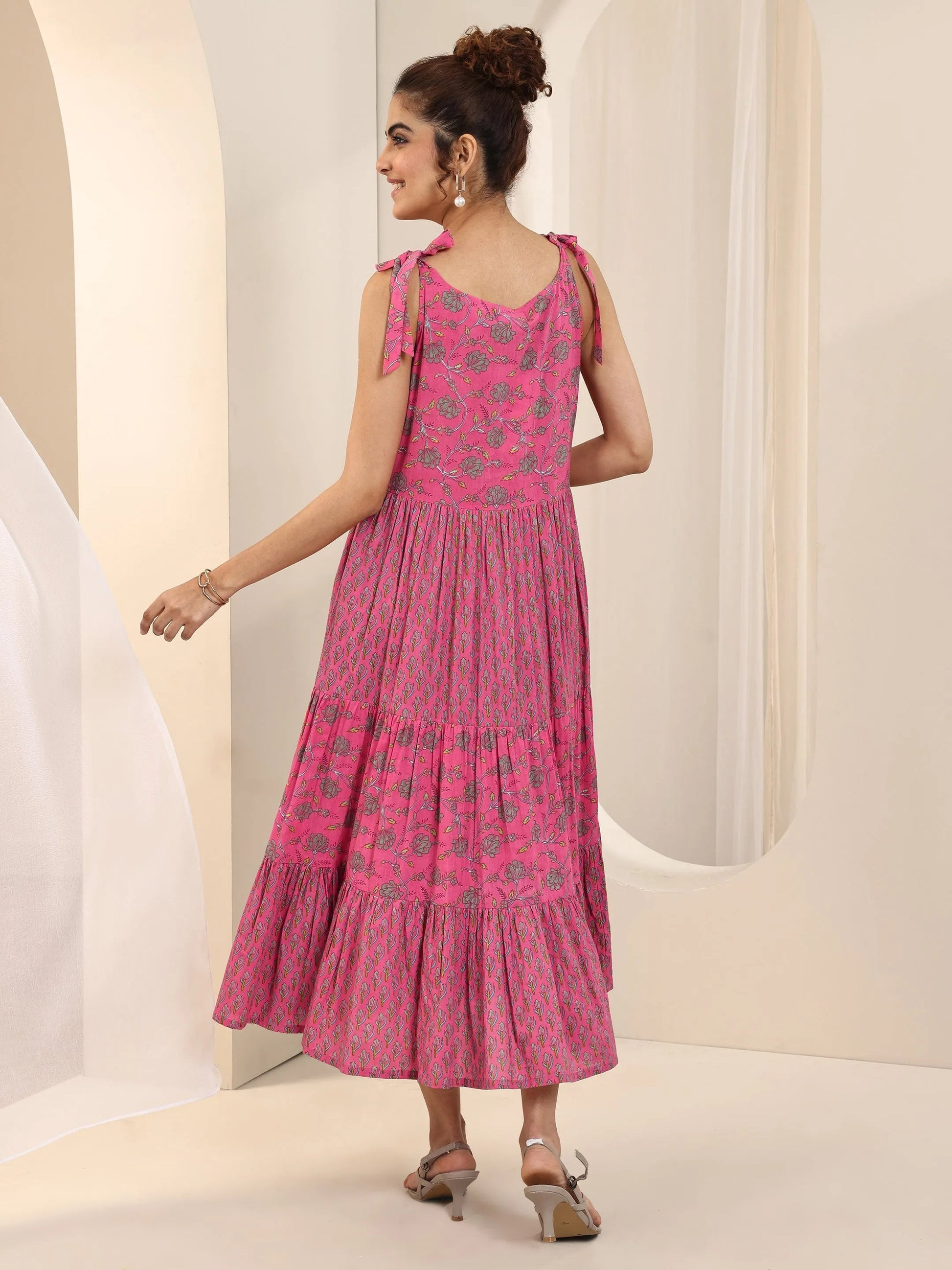 Our pink printed cotton fit and flare dress features a sleeveless silhouette with a V- neckline and flared hemline. Highlighted with captivating floral prints, this style is perfect for casual outings.