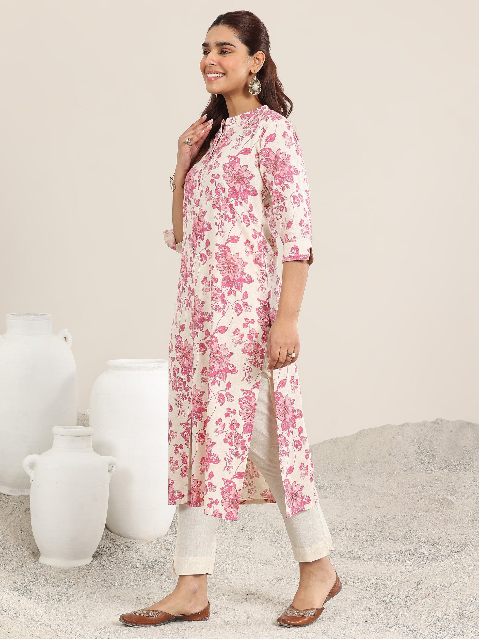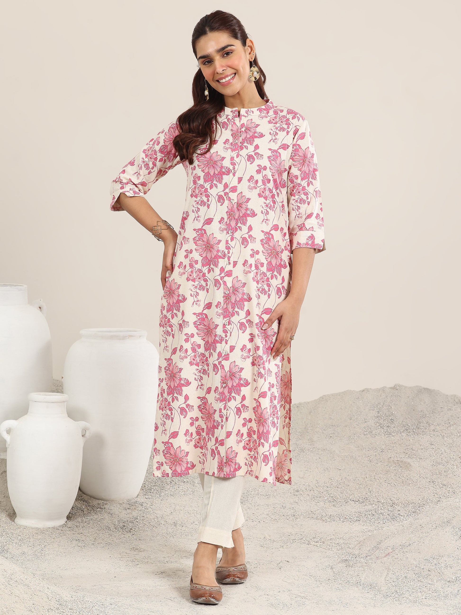 Our 1-piece pink and off-white cotton straight-fit kurta features a mandarin collar neckline, regular sleeves, and statement Yoke. Adorned with printed embellishments, this style is perfect for casual occasions.